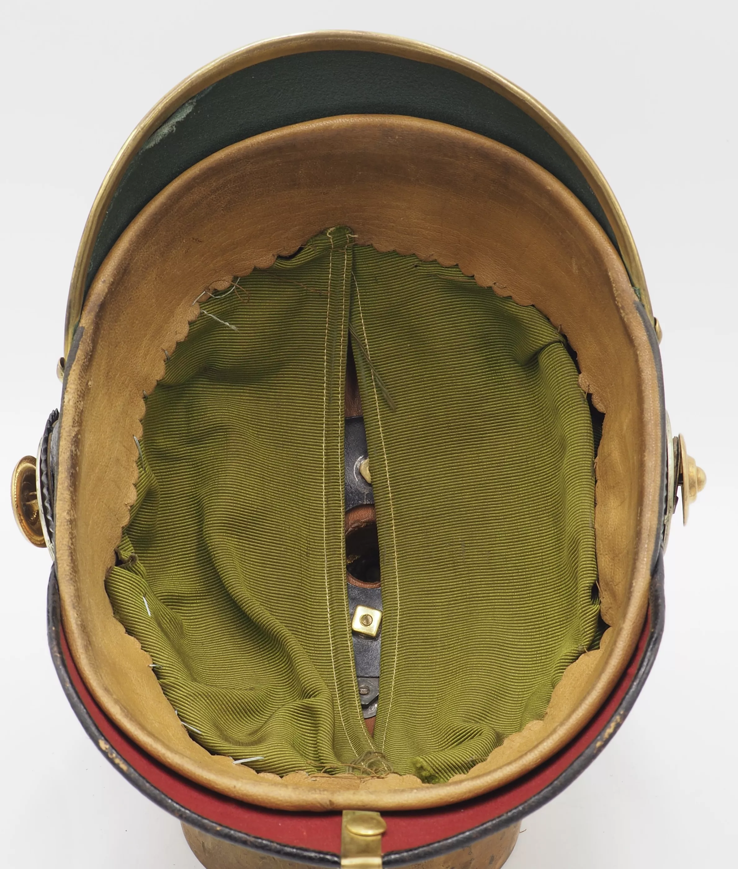Prussian 2nd-Foot Artillery von Hindesin - 1st Pommeranian - 3rd Company, Officer helmet Model 1897. Black lacquered leather helmet body with fine fire gilt metal trim. Helmet has perfect form and firm stitching. The exterior lacquer is in excellent condition with no lacquer loss (see photos). No extra holes in the helmet body. The interior of the helmet has sweat leather and green silk headliner. Both interior visors lined in red and green which is proper for officer helmets.