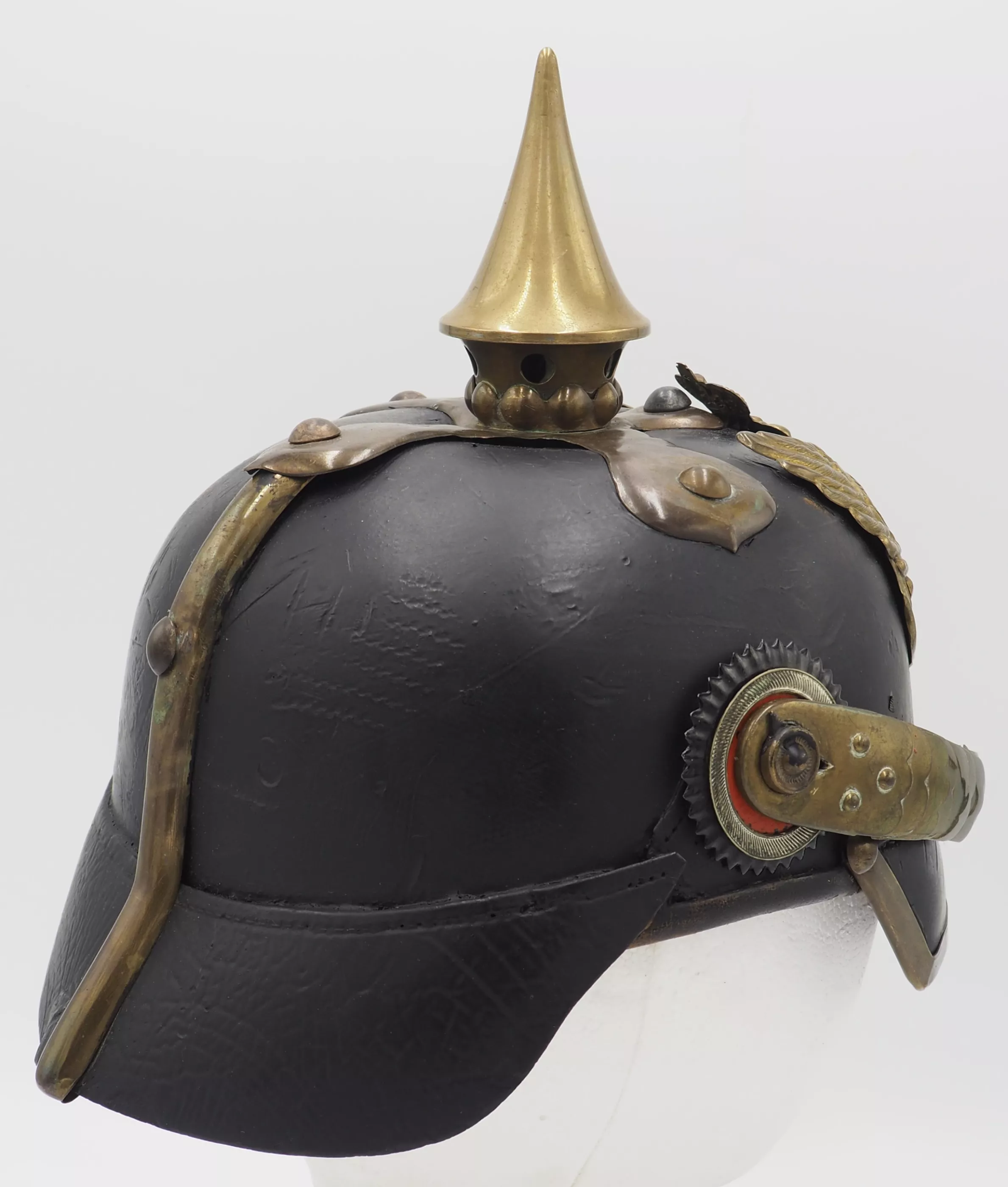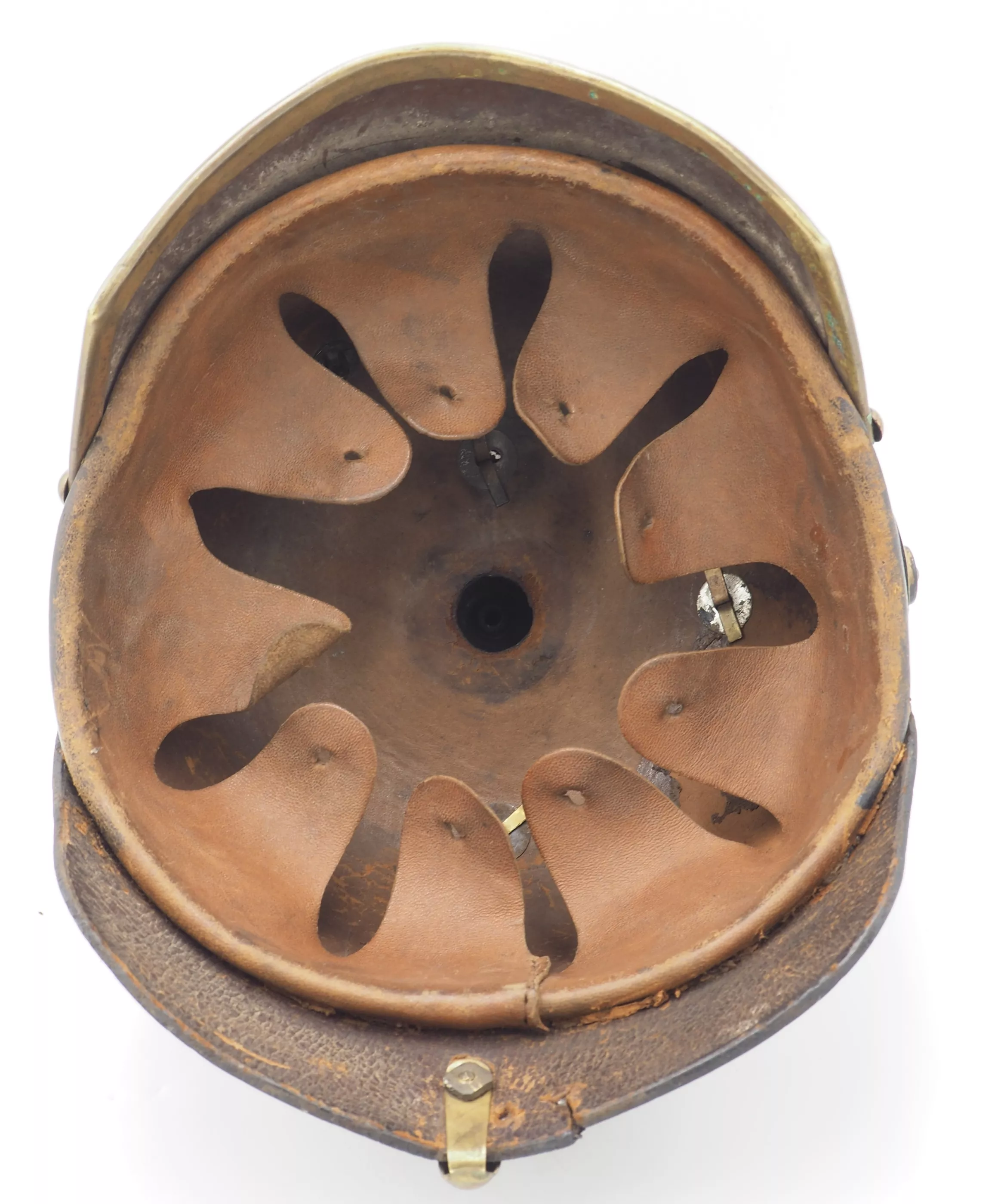 Prussian/Hannover 9th Dragoon Regiment (Dragoon Regiment Carl of Romania-1st Hannoverian) Enlisted Model 1895/99. The helmet has been left uncleaned/unpolished. Fine heavy leather helmet body with brass trim. The helmet body in excellent form and firm stitching. The lacquer finish is dull with age and has a repair tear on the left side (see photos). Interior has EM style leather tabbed liner that is in excellent condition. The helmet interior visors are plain leather and have no legible markings.