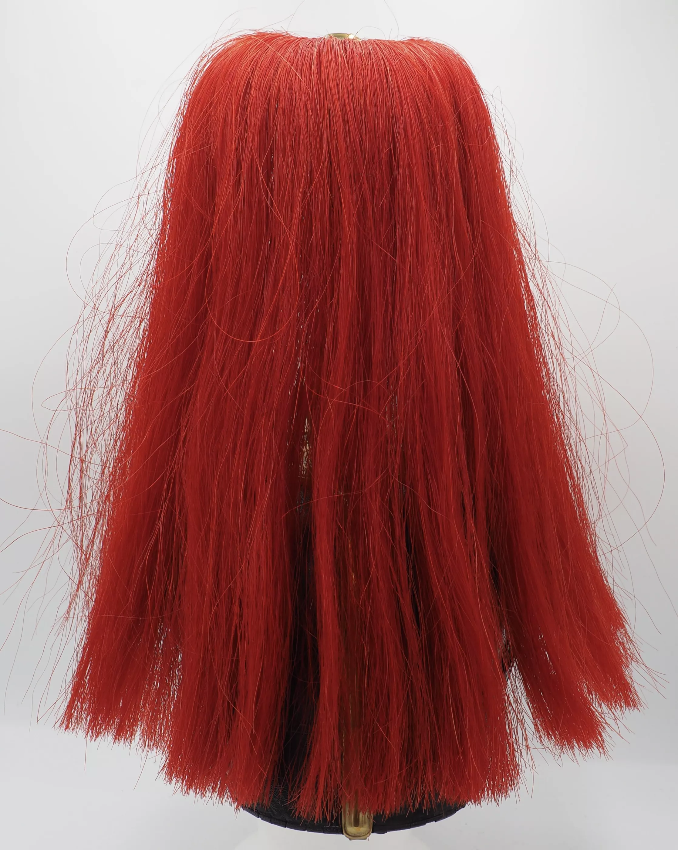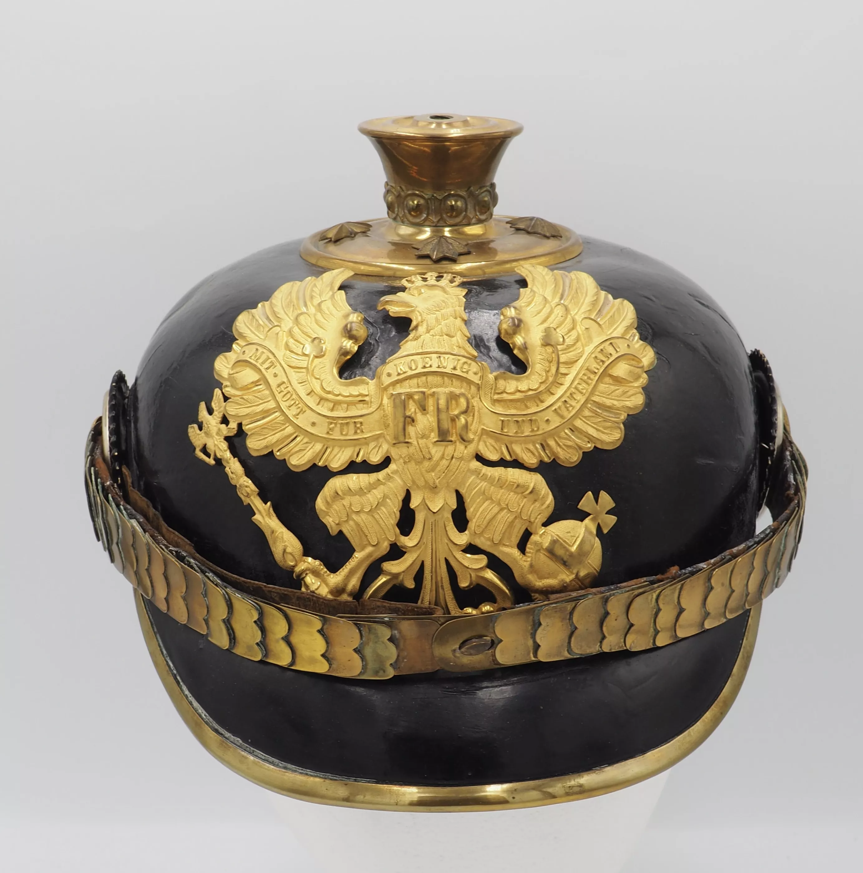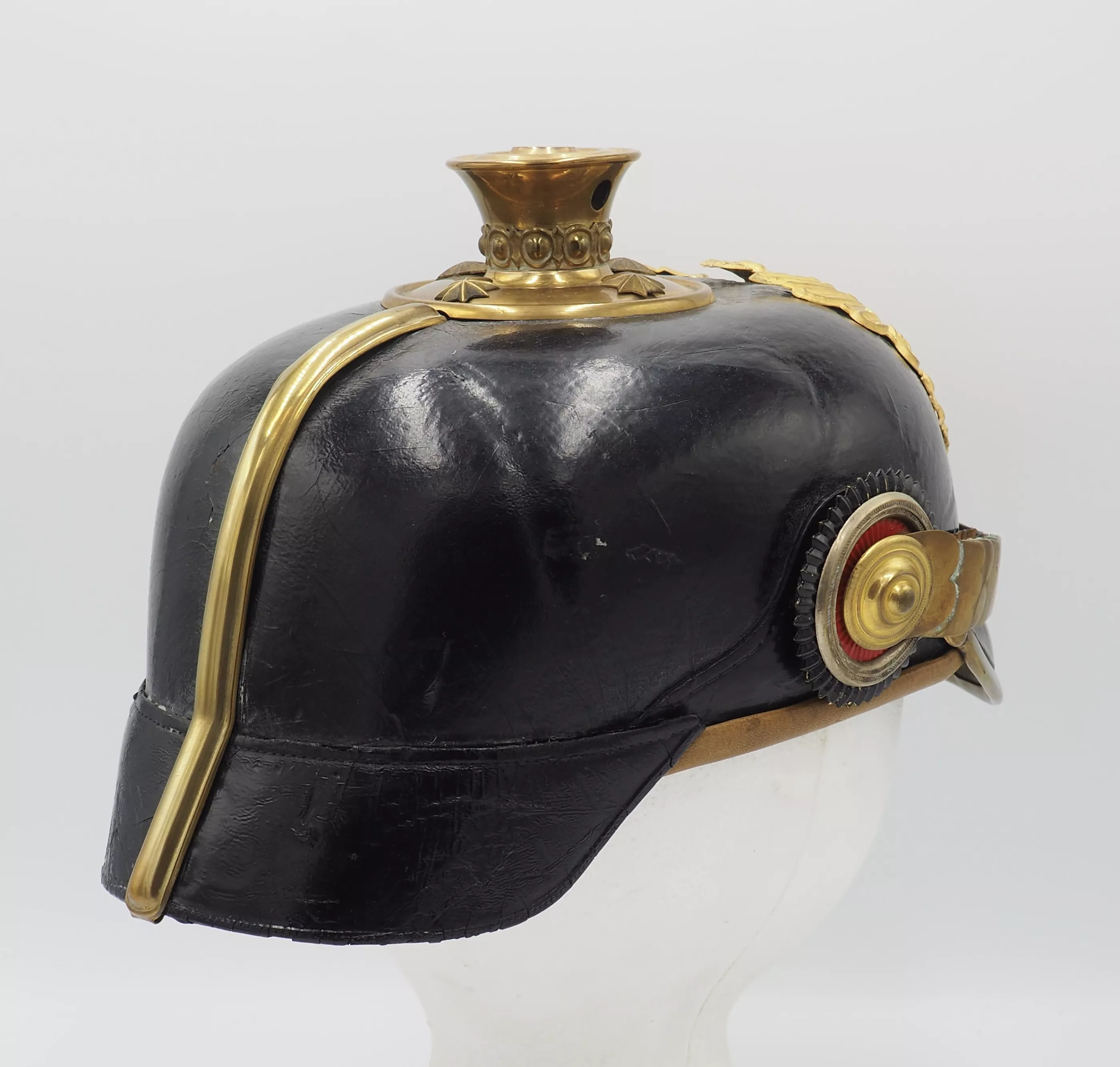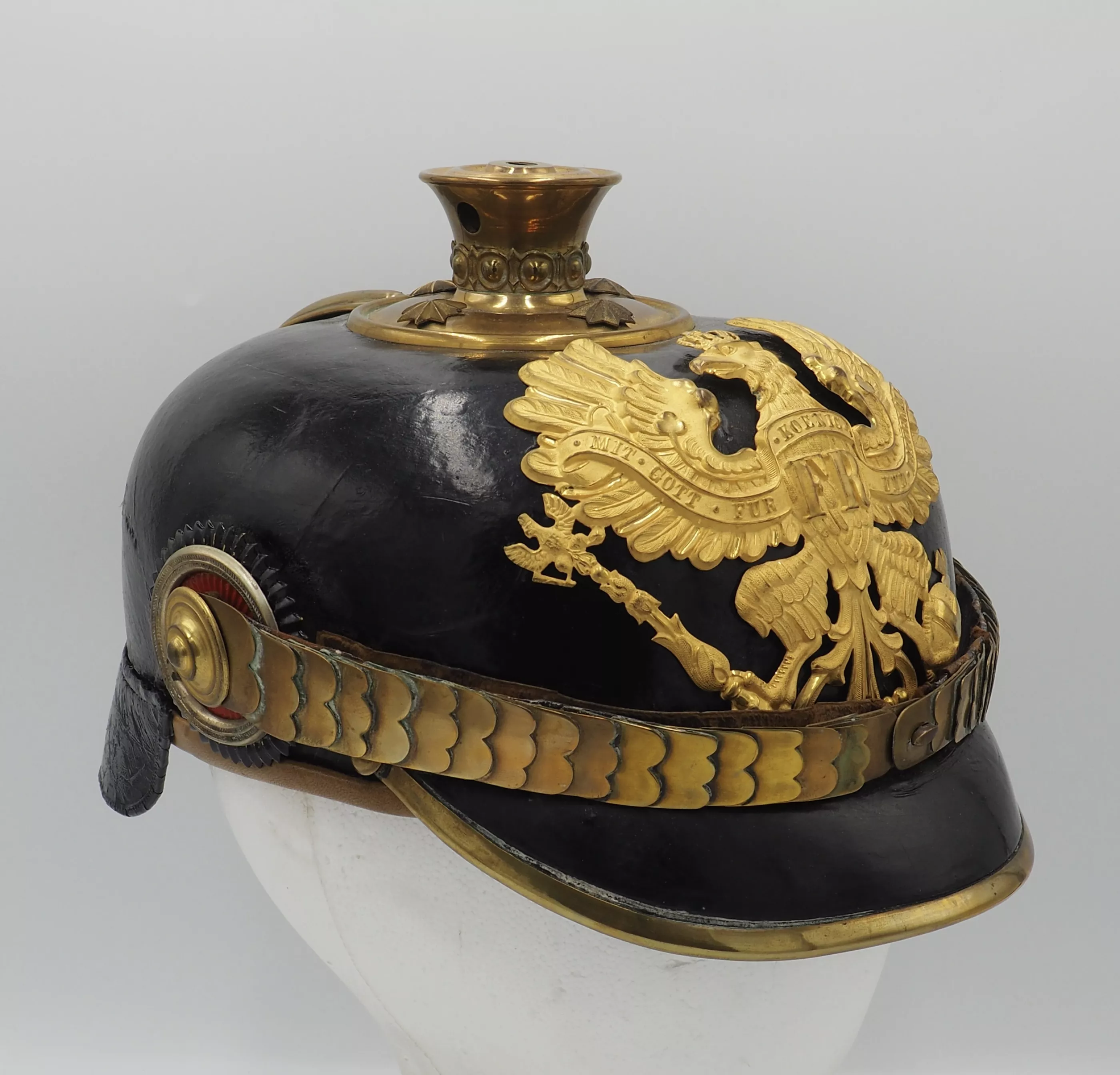 The frontplate for the helmet is the Line Prussian Eagle fixed to the helmet shell with screws/nuts. The helmet has a Standard Officer spike base with a tall smooth trichter on which is mounted a red horse hair plume. The base is secured to the helmet body with 4 split brads stars. The red plume indicated the wearer was a musician and as it is an officer helmet we conclude he was a Bandmaster for his unit. Flat gilt chinscales on rosettes. Officer Reichs and Prussian cockades. Beautiful helmet in near pristine condition. Great regimental Bandmaster.