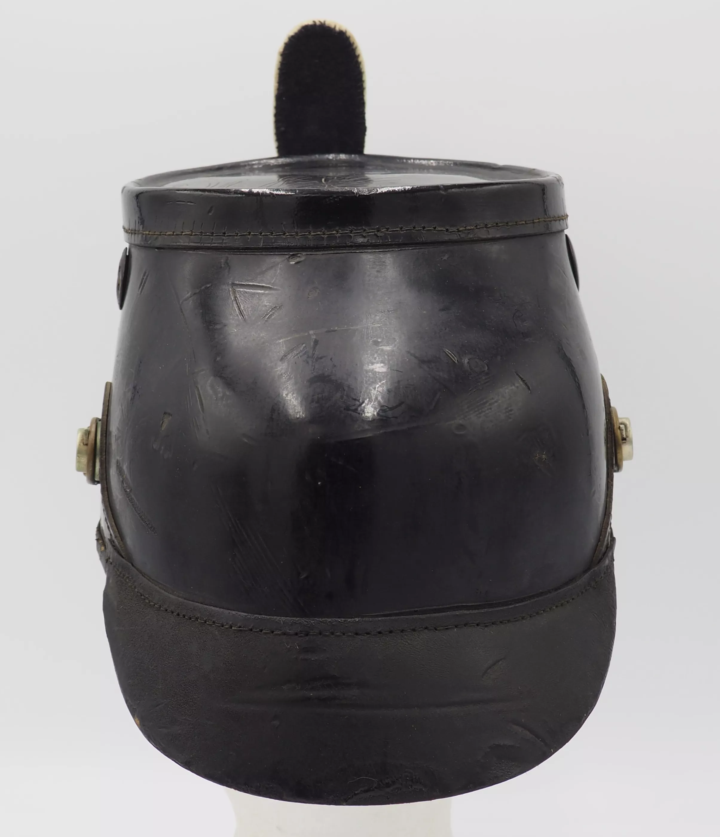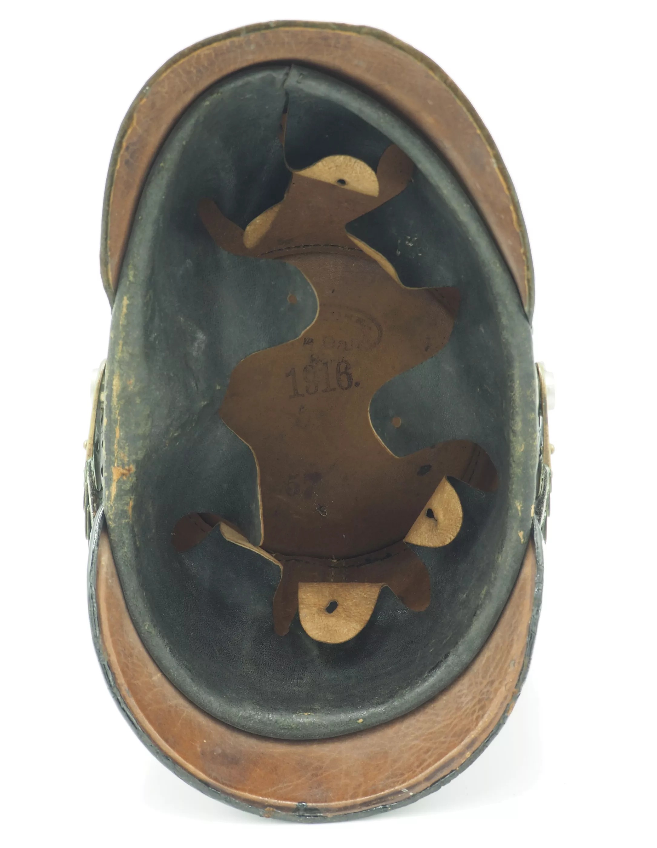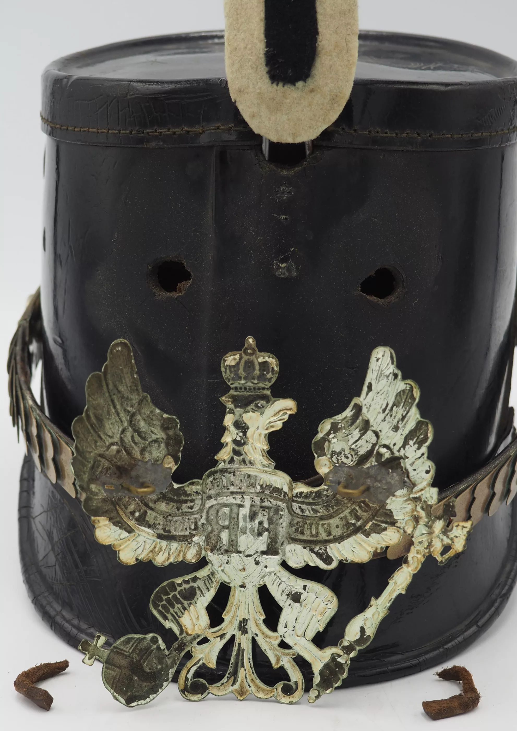 Prussian Shako for 2nd Telegrapher Battalion -Established 1899 - Hdq. Frankfurt-Oder and Cottbus, Enlisted Man - Model 1897. From the New England Collection. Black lacquered leather shako with silver metal trim. The helmet body is large sized and in excellent condition with perfect form and firm stitching. No extra holes in the helmet body. The helmet interior has standard black dyed leather EM style liner that is still soft and supple. Marked inside helmet body with makers stamp and date of "1916" and the size "57".