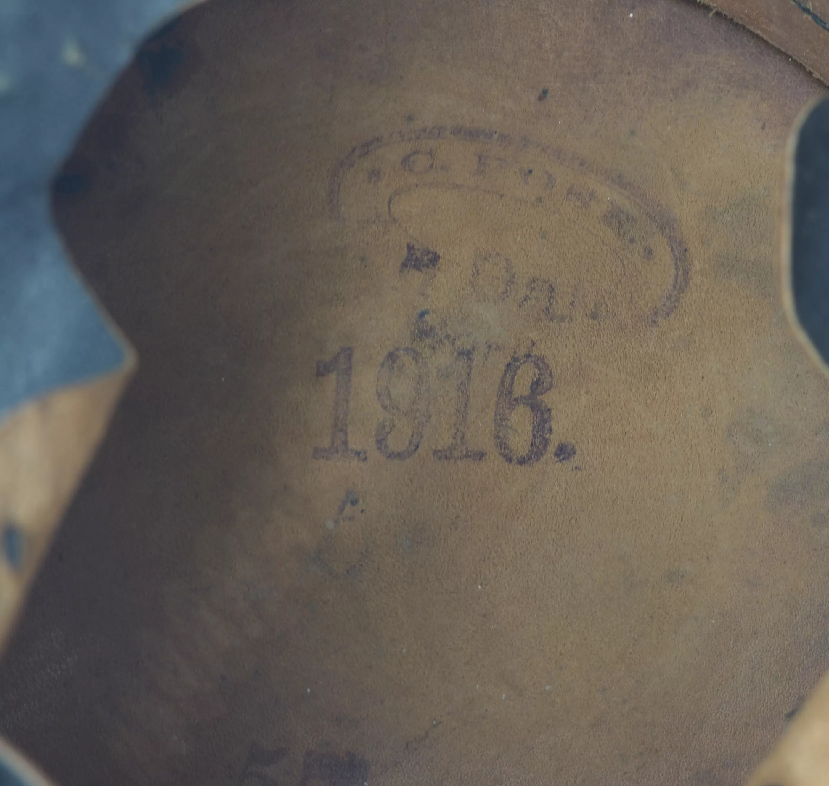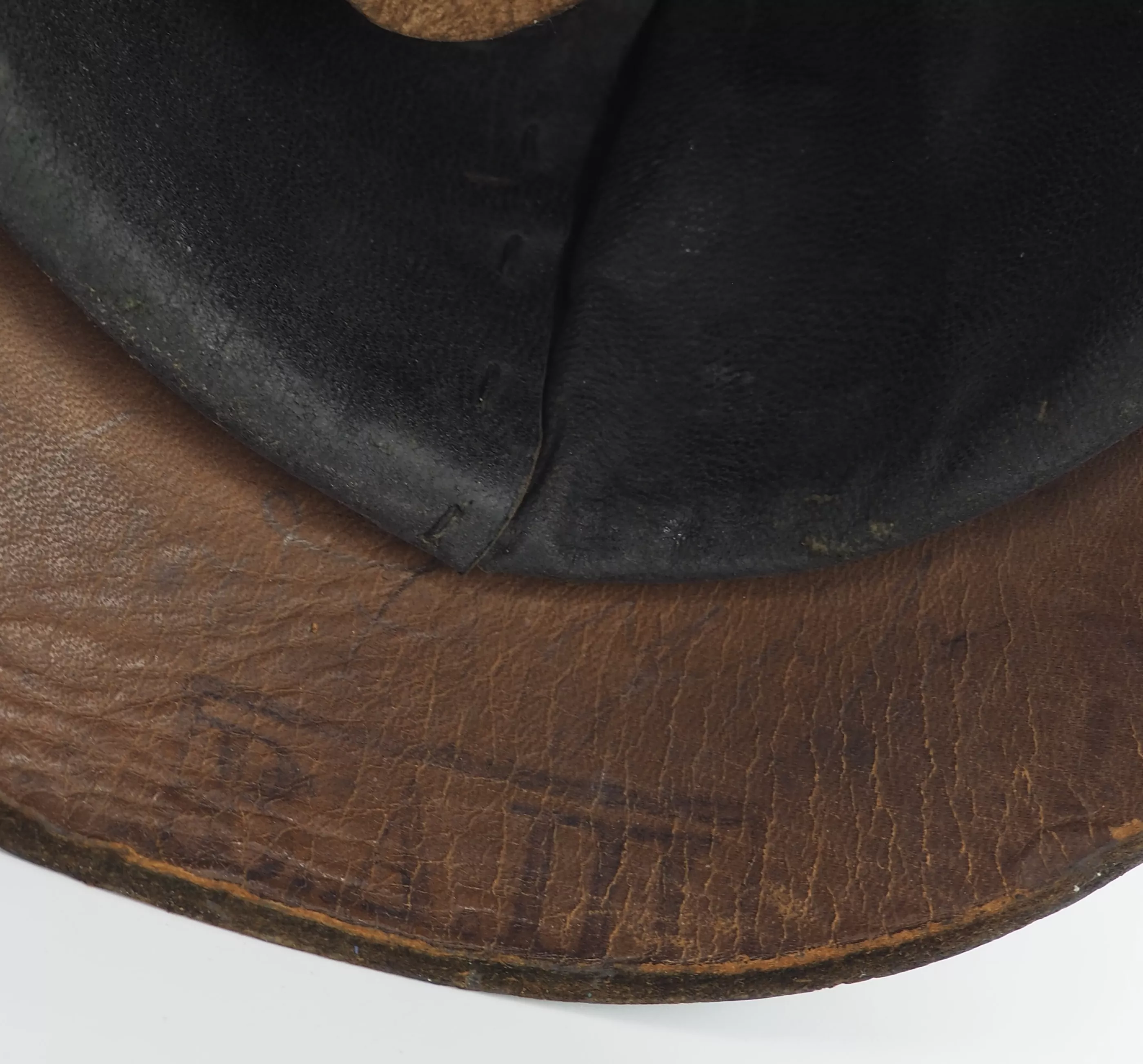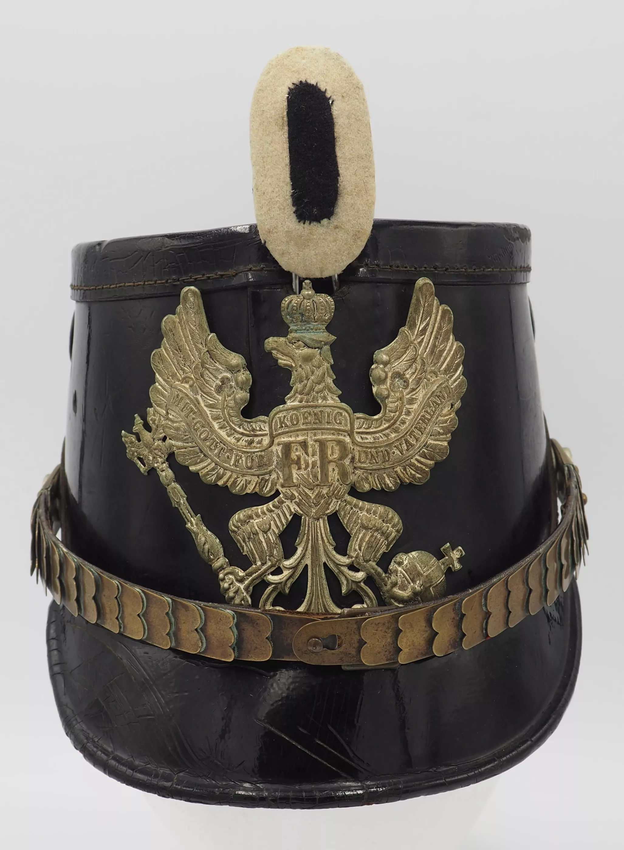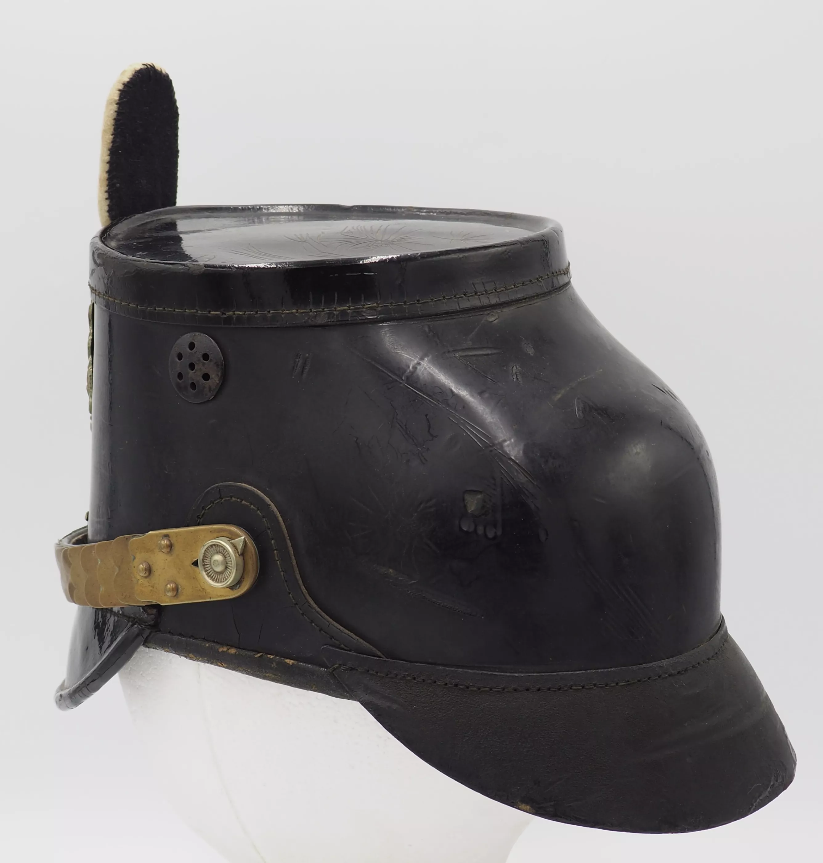 Prussian Shako for 2nd Telegrapher Battalion -Established 1899 - Hdq. Frankfurt-Oder and Cottbus, Enlisted Man - Model 1897. From the New England Collection. Black lacquered leather shako with silver metal trim. The helmet body is large sized and in excellent condition with perfect form and firm stitching. No extra holes in the helmet body. The helmet interior has standard black dyed leather EM style liner that is still soft and supple. Marked inside helmet body with makers stamp and date of "1916" and the size "57".