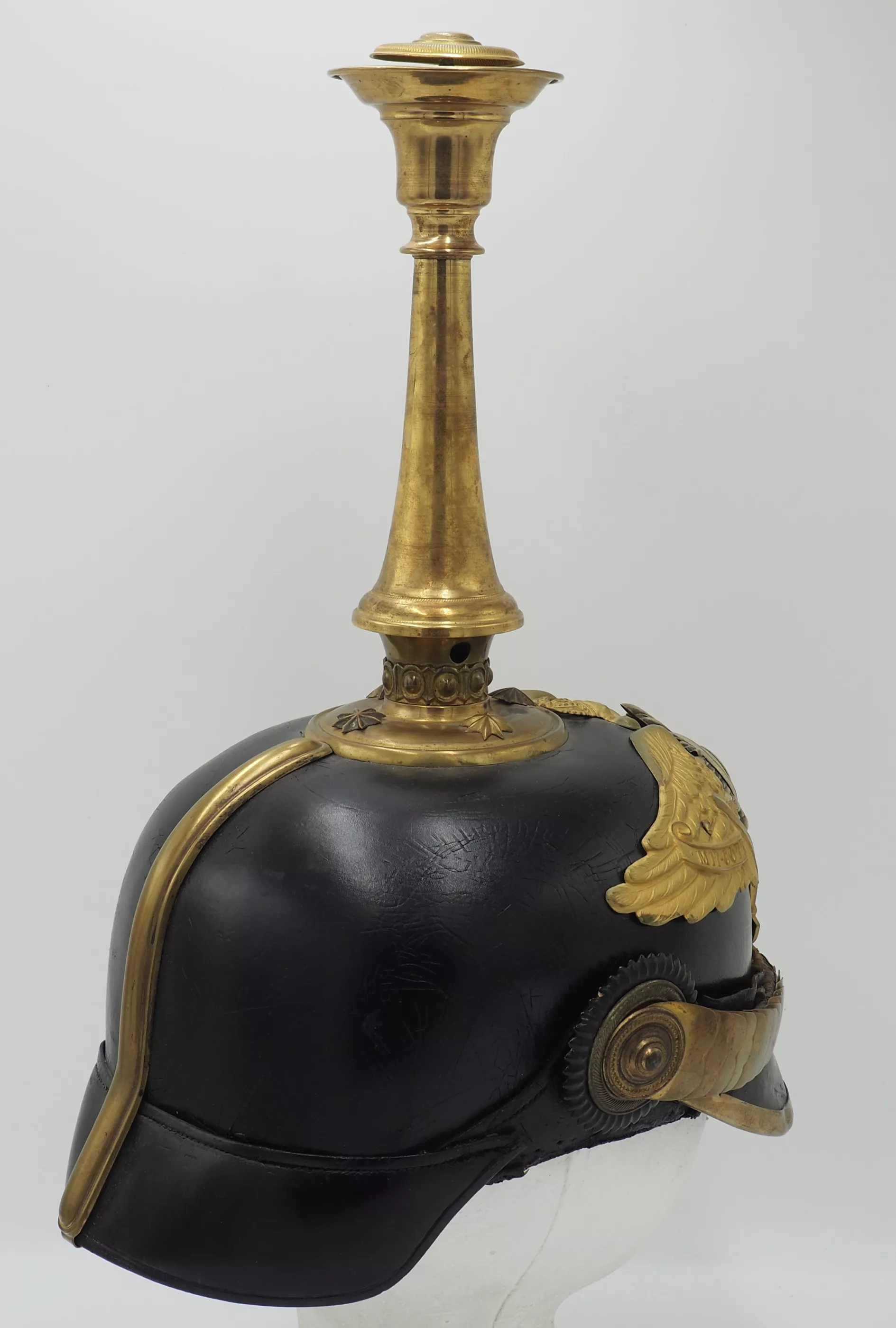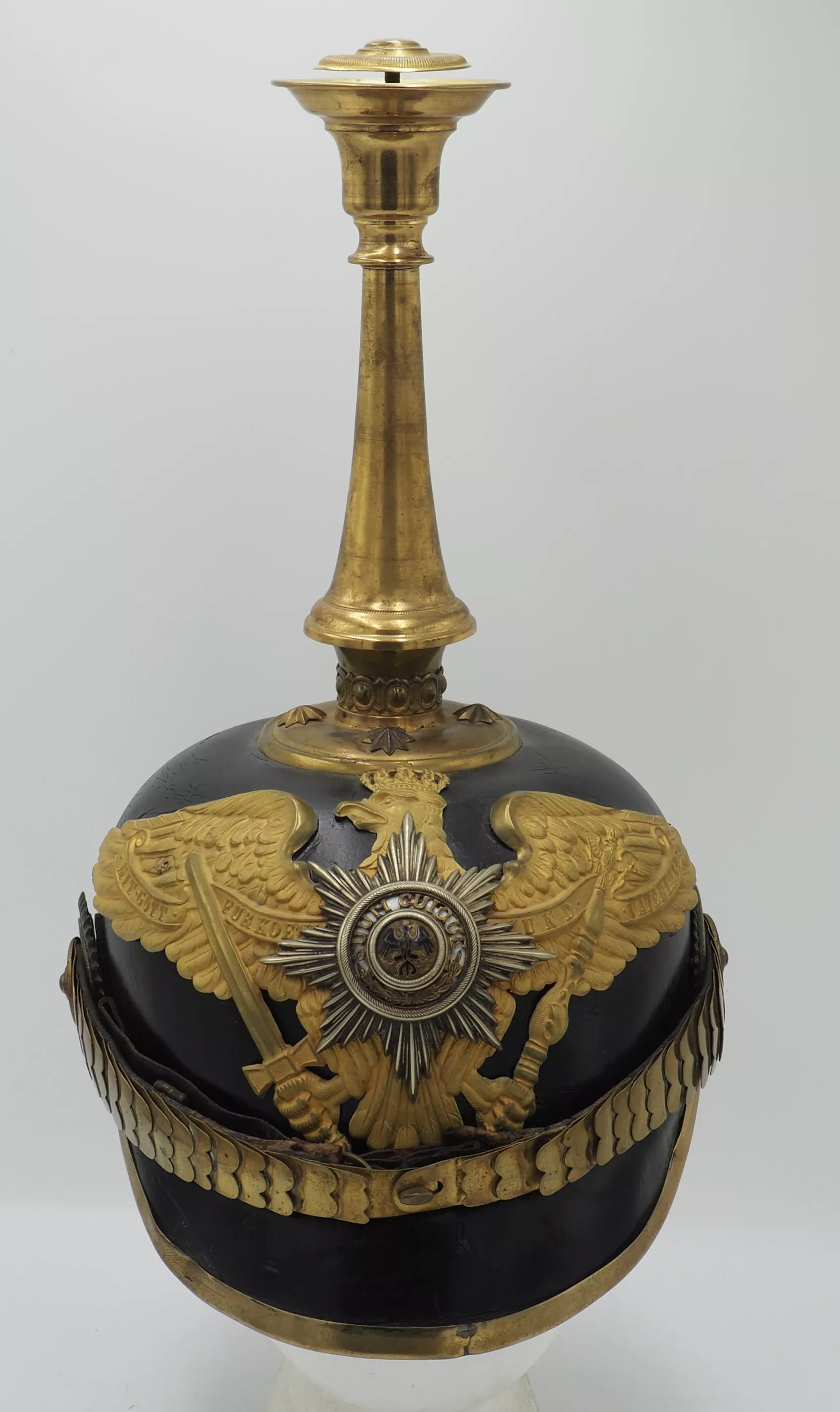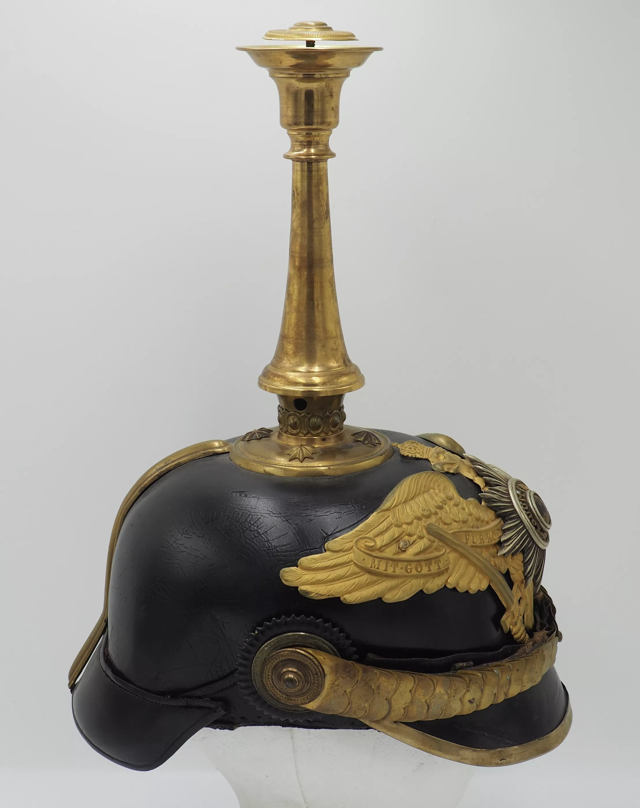 Prussian Guard Infantry and Grenadier Regiments Officer to Parade (white Yak hair plume) -Model 1897. Black leather helmet body with fire gilt metal trim. The leather helmet body in perfect condition with firm stitching. The exterior lacquer in excellent condition with a bright finish and no lacquer loss. The helmet body has NO extra holes. The helmet interior has standard sweat leather and silk headliner in good condition but shows use and wear.