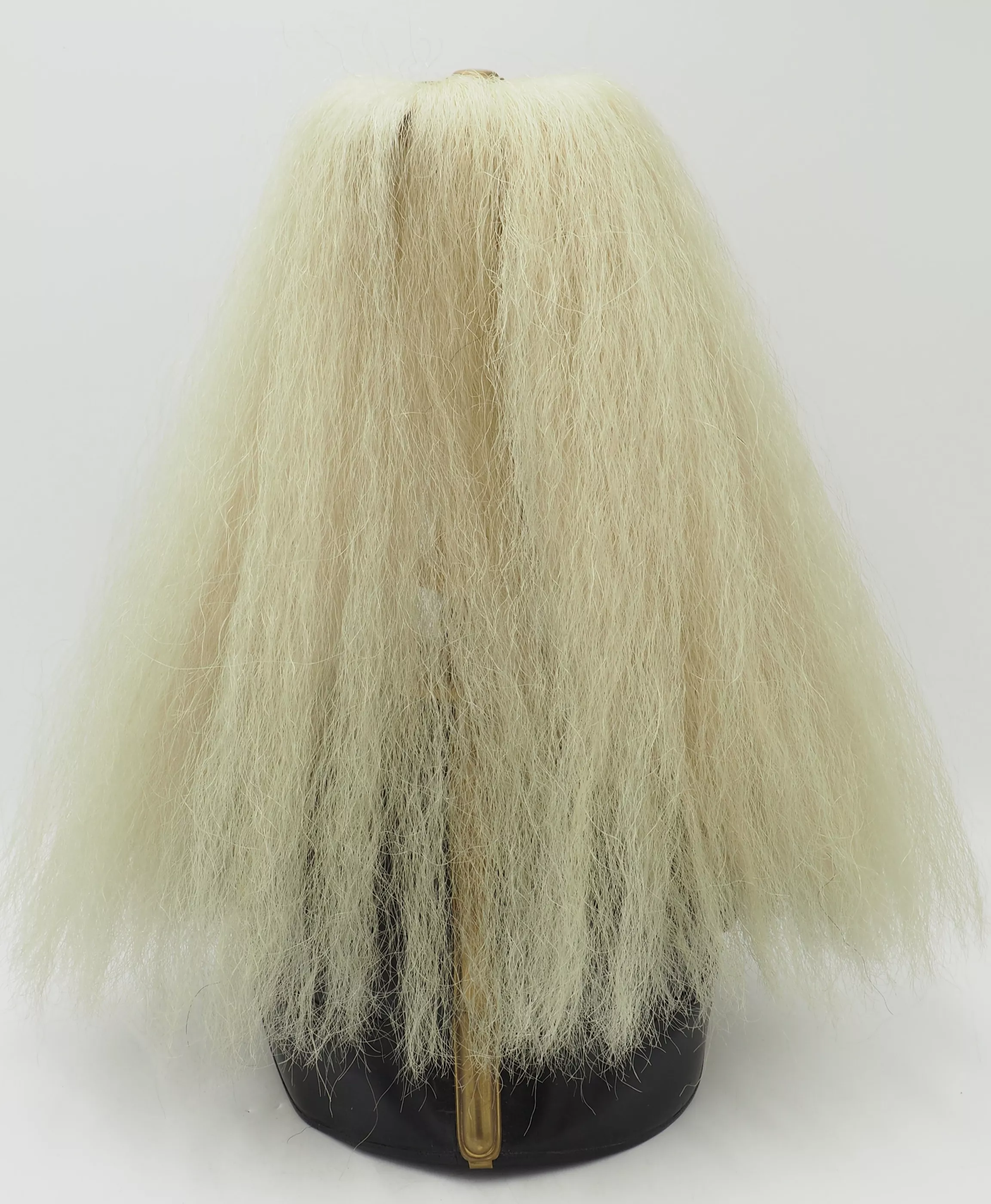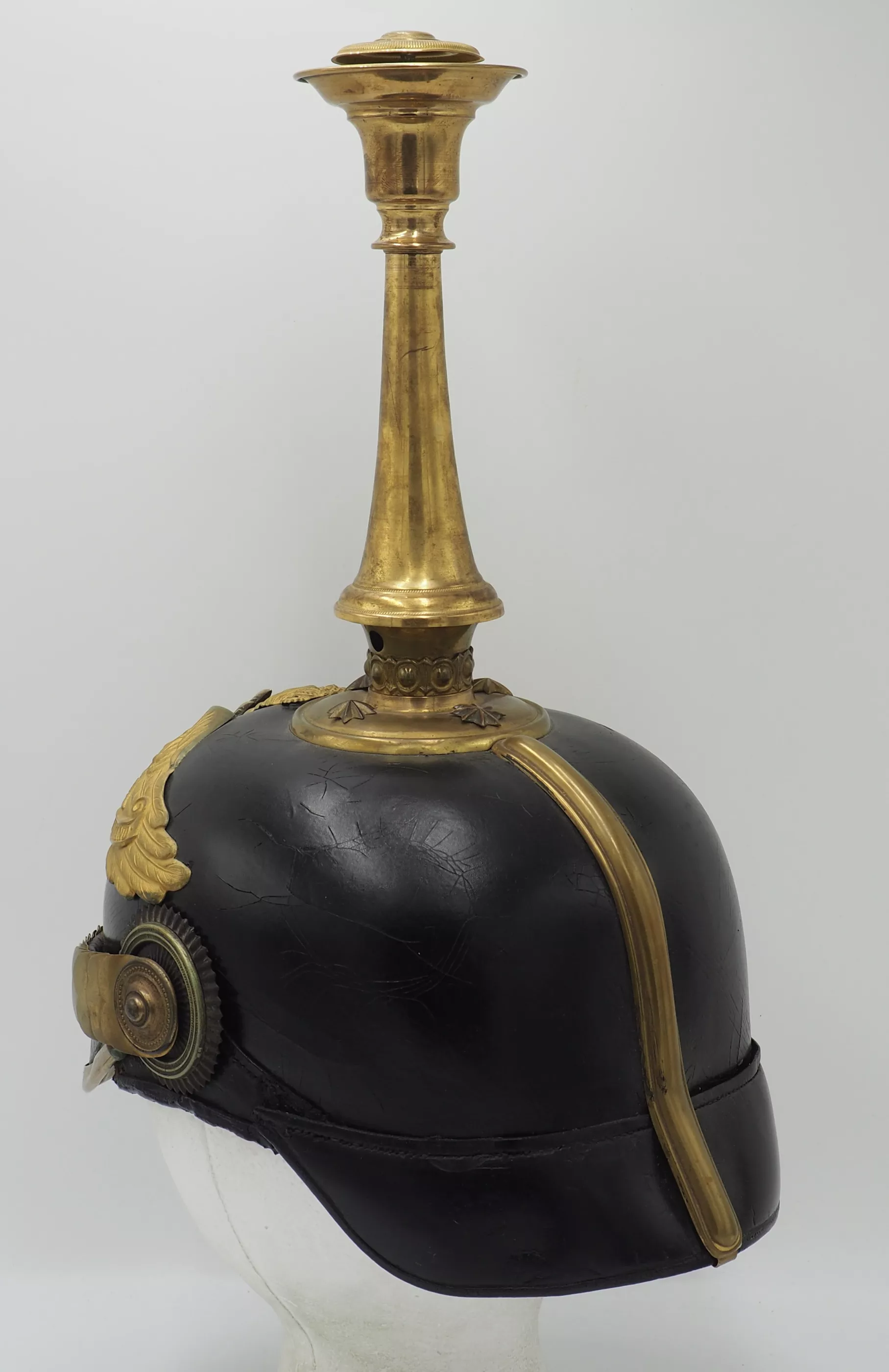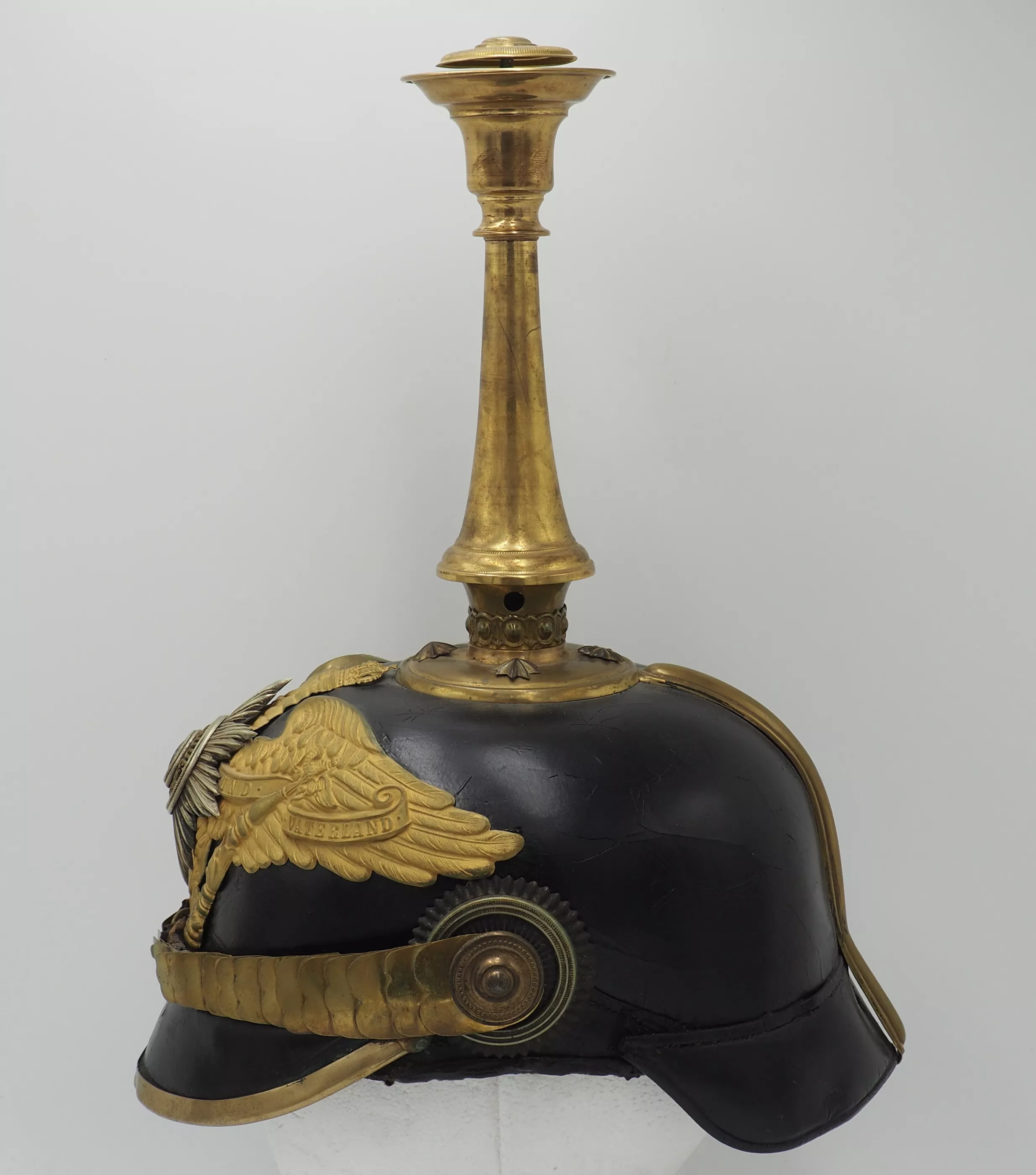Prussian Guard Infantry and Grenadier Regiments Officer to Parade (white Yak hair plume) -Model 1897. Black leather helmet body with fire gilt metal trim. The leather helmet body in perfect condition with firm stitching. The exterior lacquer in excellent condition with a bright finish and no lacquer loss. The helmet body has NO extra holes. The helmet interior has standard sweat leather and silk headliner in good condition but shows use and wear.