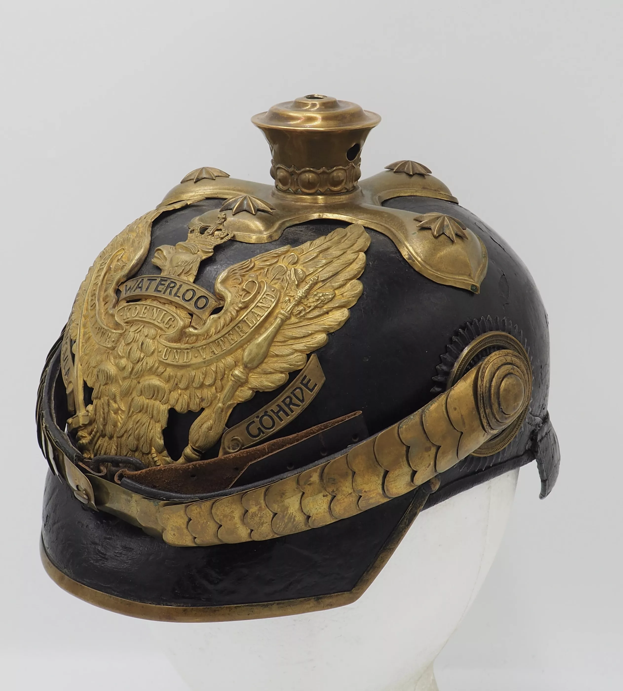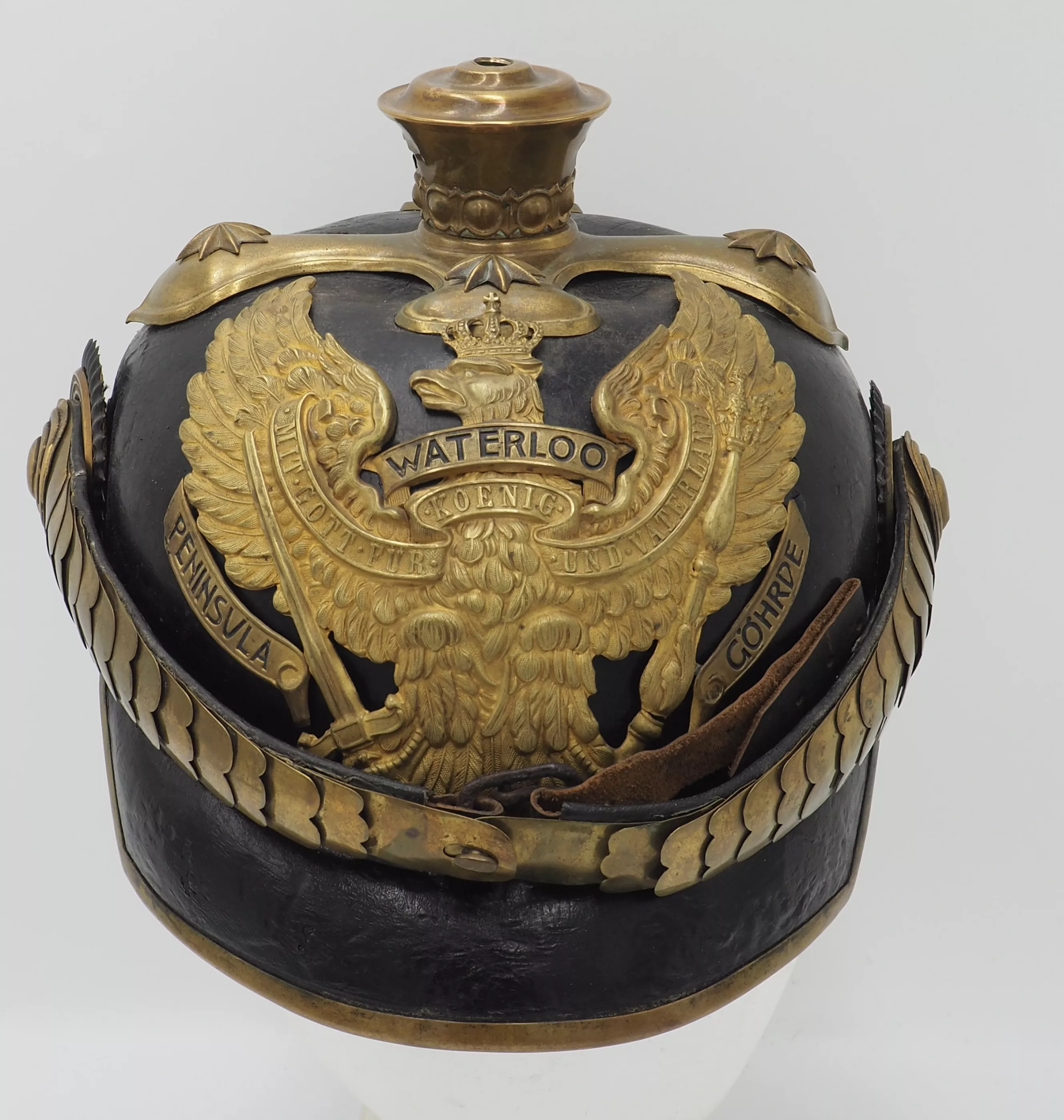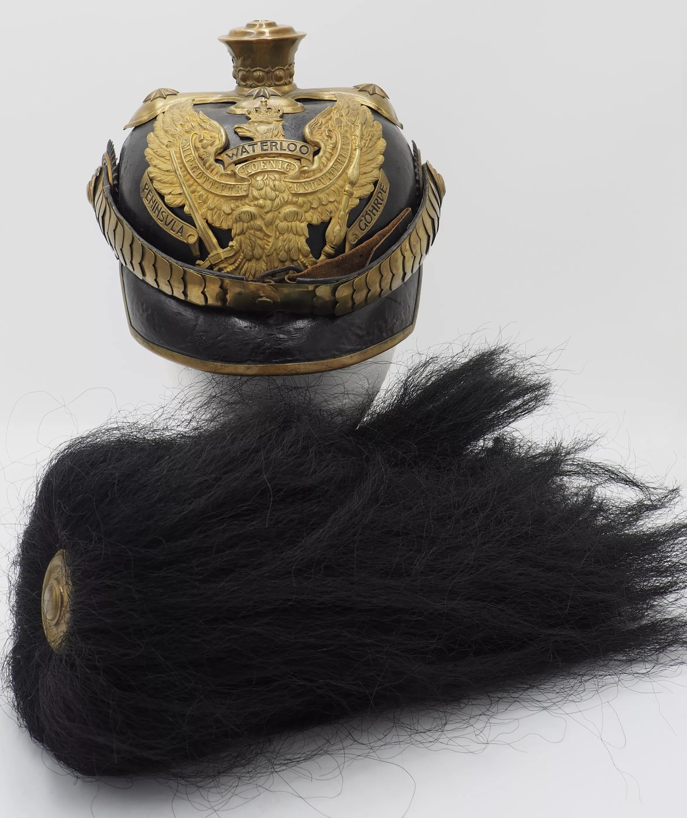 Tall smooth plume trichter on which is mounted a black Yak hair parade plume. Large gold stars retain cross base to helmet. The Frontplate is the new post-January 24, 1899 Officer Hanoverian Dragoon Eagle with the banner “Waterloo – Peninsula - Gohrde” to commemorate this Regiments service in the Kings German Legion during the Napoleonic Wars. This regiment served in Spain and during the final battle at Waterloo. Original set of convex rounded gold chinscales with a gold officer rosette. Original officers Reich and Prussian cockades.