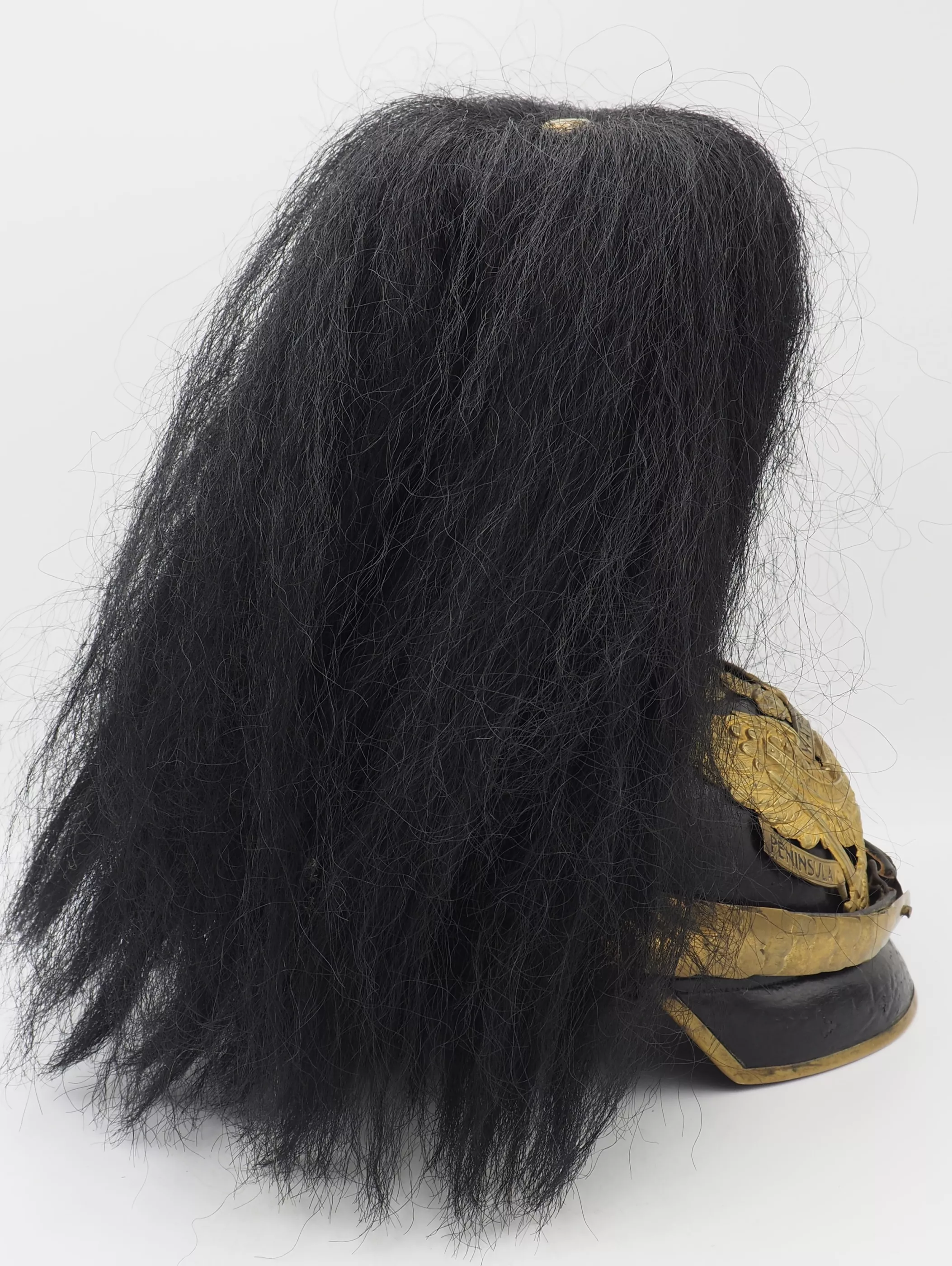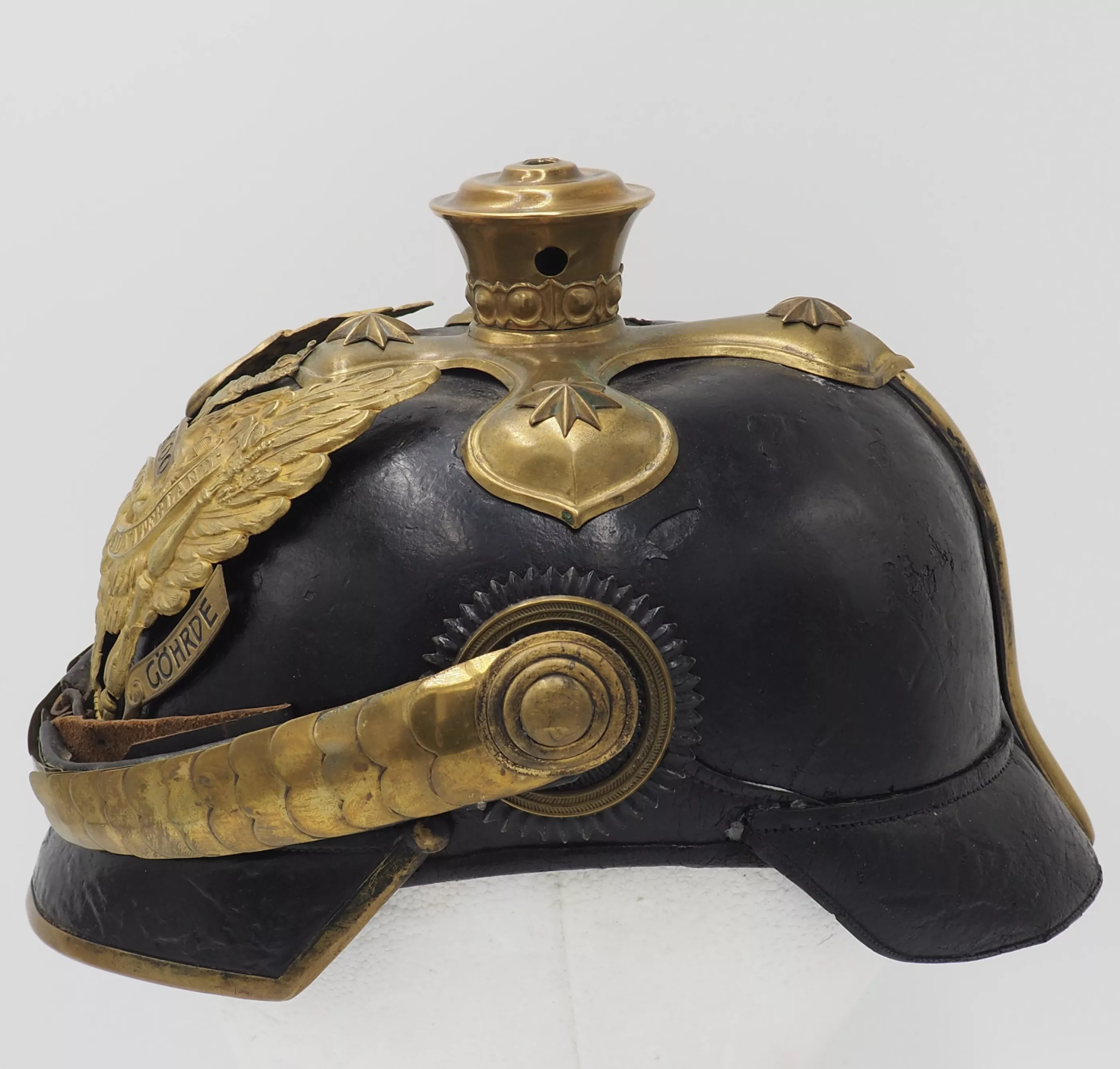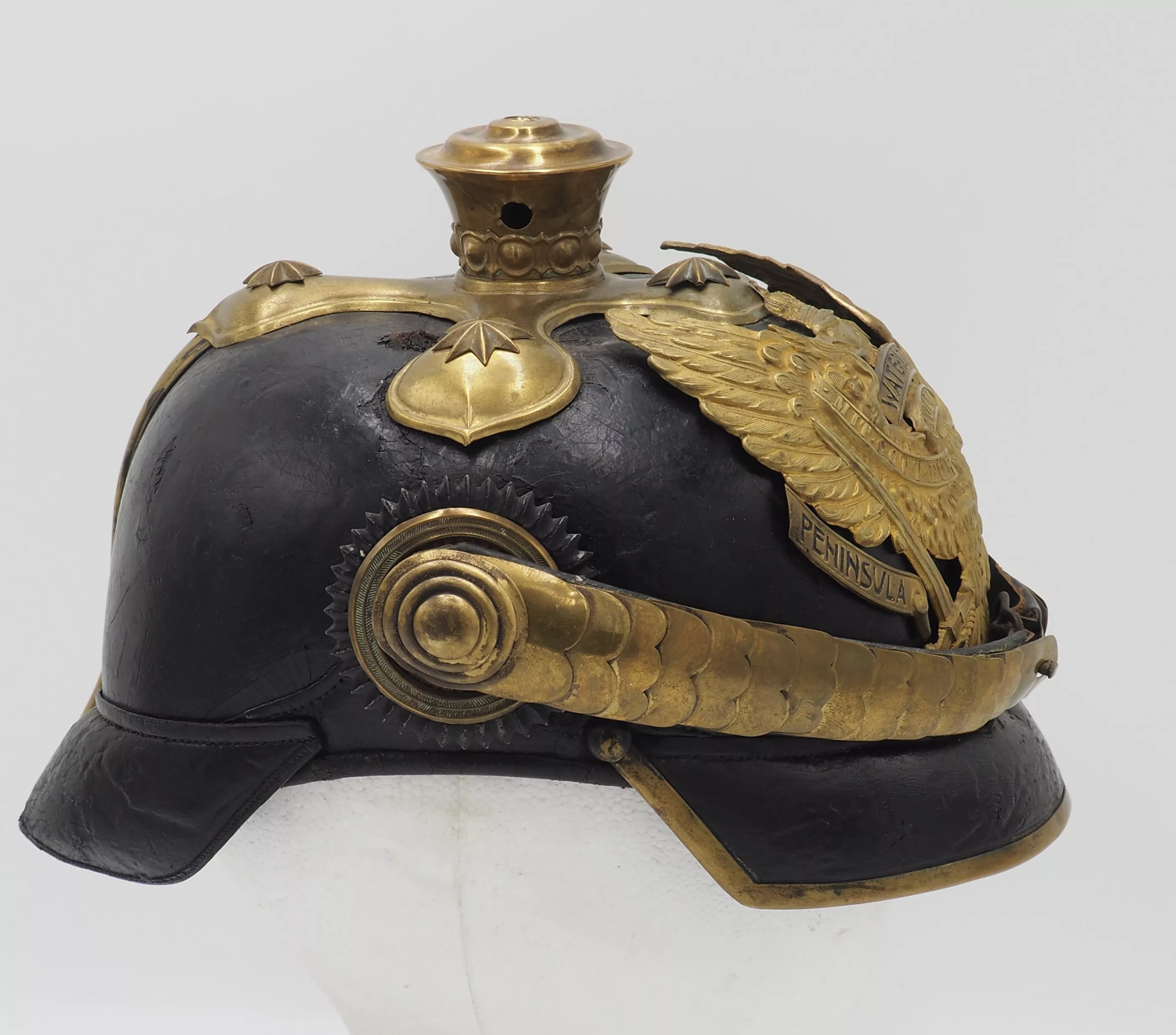Tall smooth plume trichter on which is mounted a black Yak hair parade plume. Large gold stars retain cross base to helmet. The Frontplate is the new post-January 24, 1899 Officer Hanoverian Dragoon Eagle with the banner “Waterloo – Peninsula - Gohrde” to commemorate this Regiments service in the Kings German Legion during the Napoleonic Wars. This regiment served in Spain and during the final battle at Waterloo. Original set of convex rounded gold chinscales with a gold officer rosette. Original officers Reich and Prussian cockades.