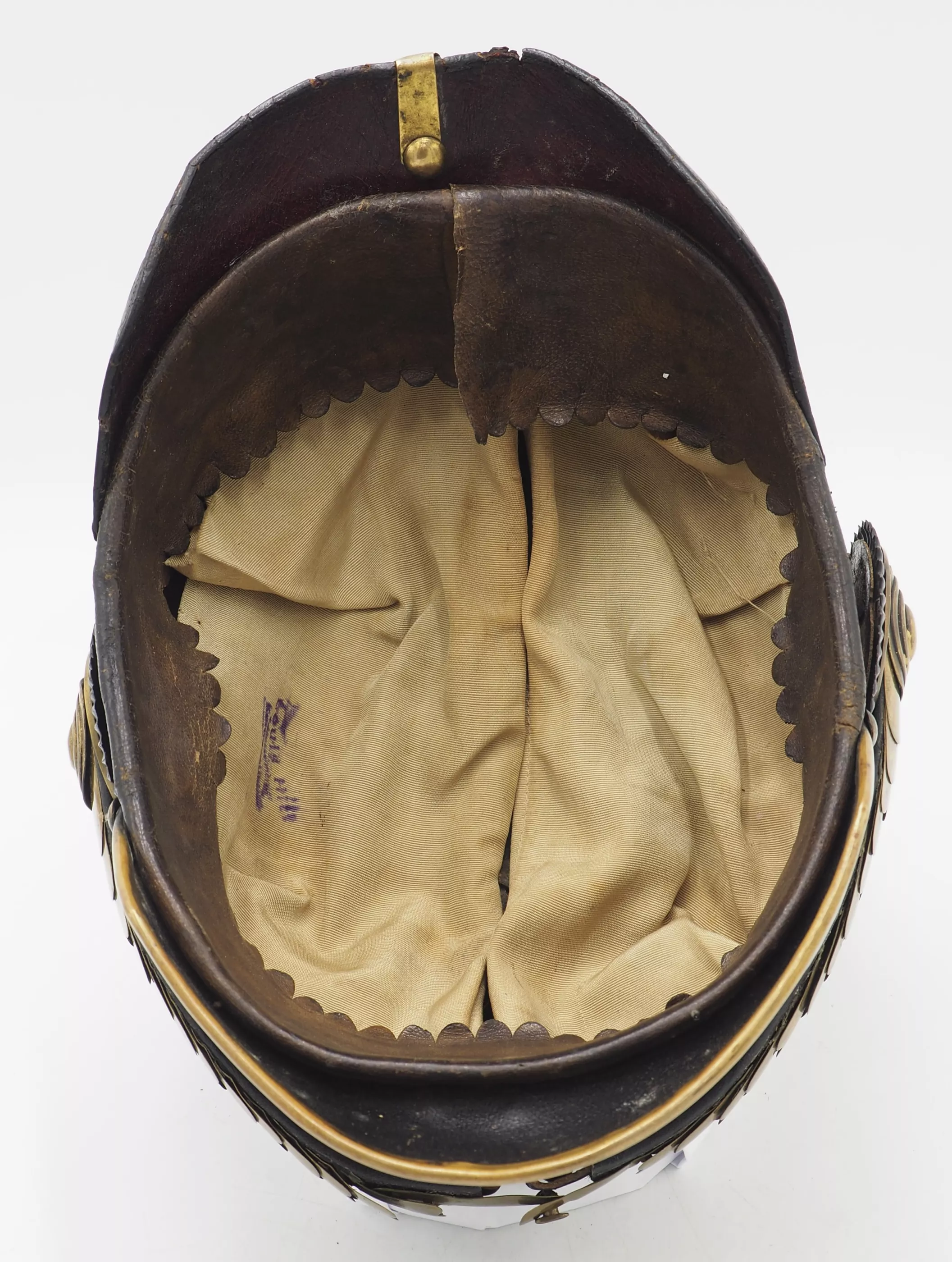 Hanoverian 9th Dragoon Regiment (1st Hanoverian Dragoon- Established 1805-Metz) Officer Model 1899 with Parade Plume. Recently acquired at a show in the US. Leather helmet body with squared front visor and gold metal trim. Older style helmet body (mid 1890’s). The leather body shows age and use (see photos). There are extra holes in helmet body due to the frontplate change in 1899. The helmet interior has sweat leather and non-ribbed white silk headliner. The silk liner has ink stamp from maker. The helmet has a gold crossed spike base with officer pearl/diamond ornamentation at base.