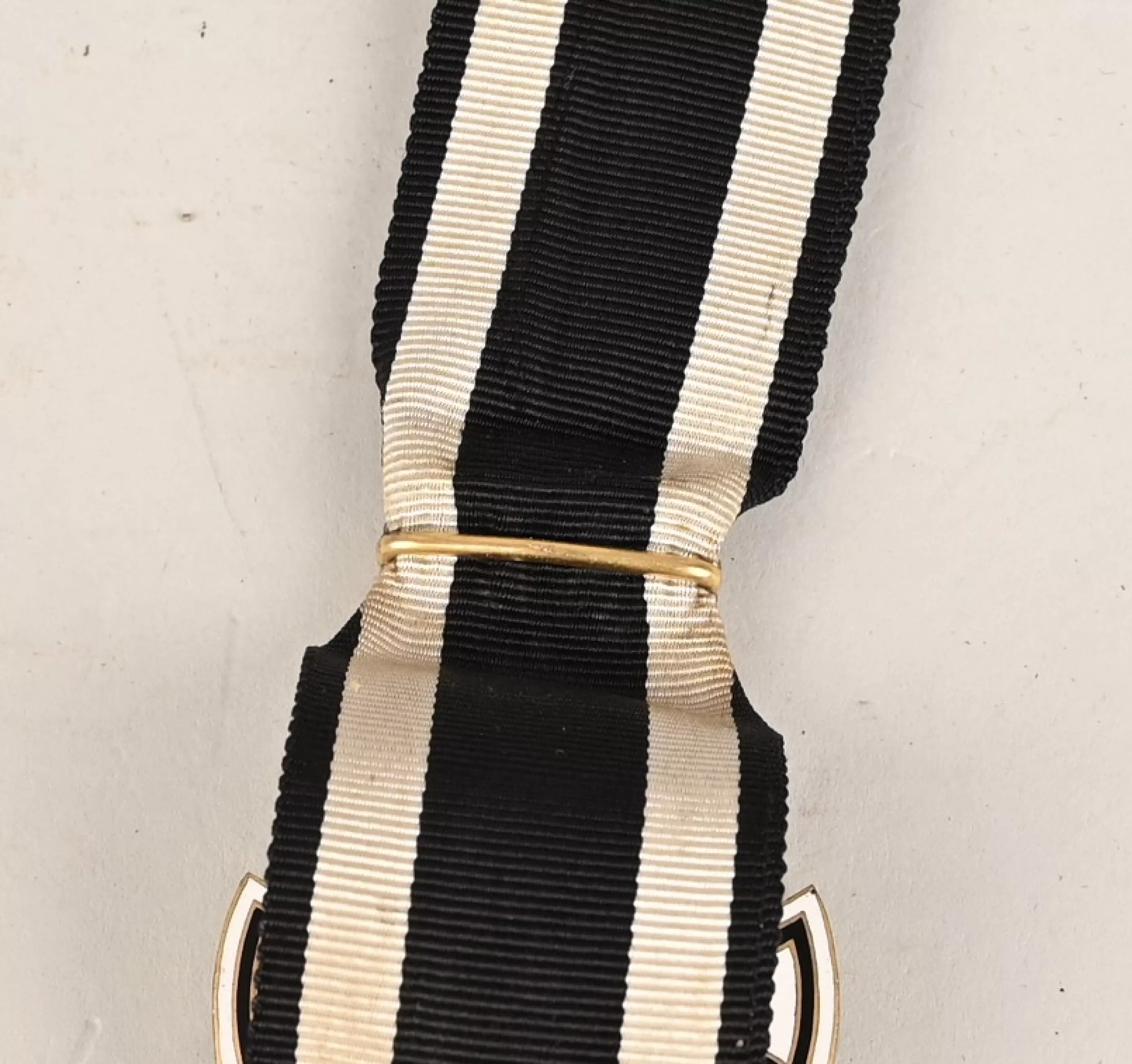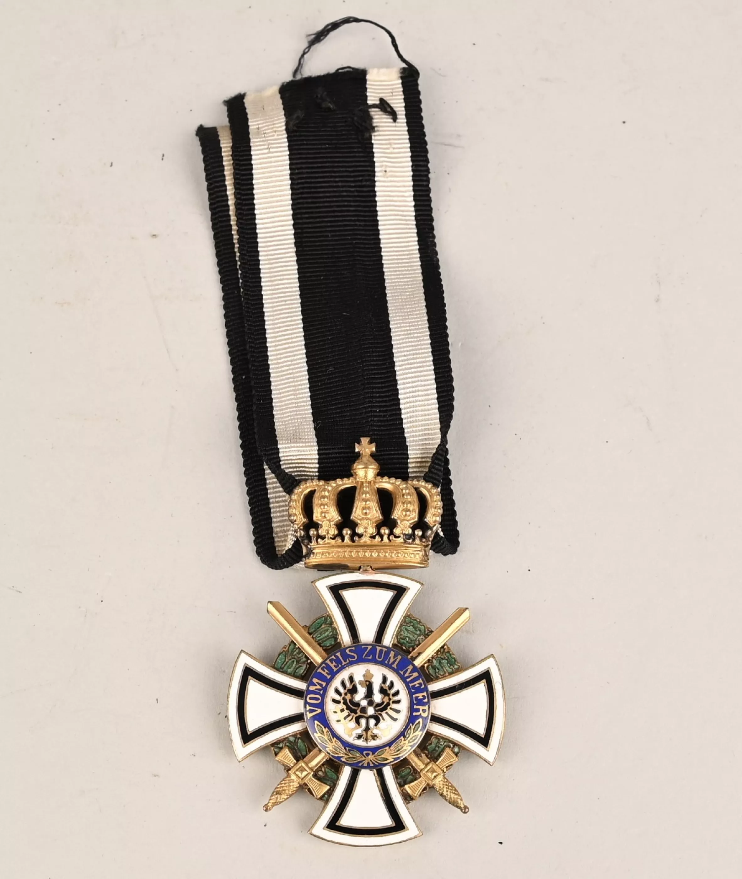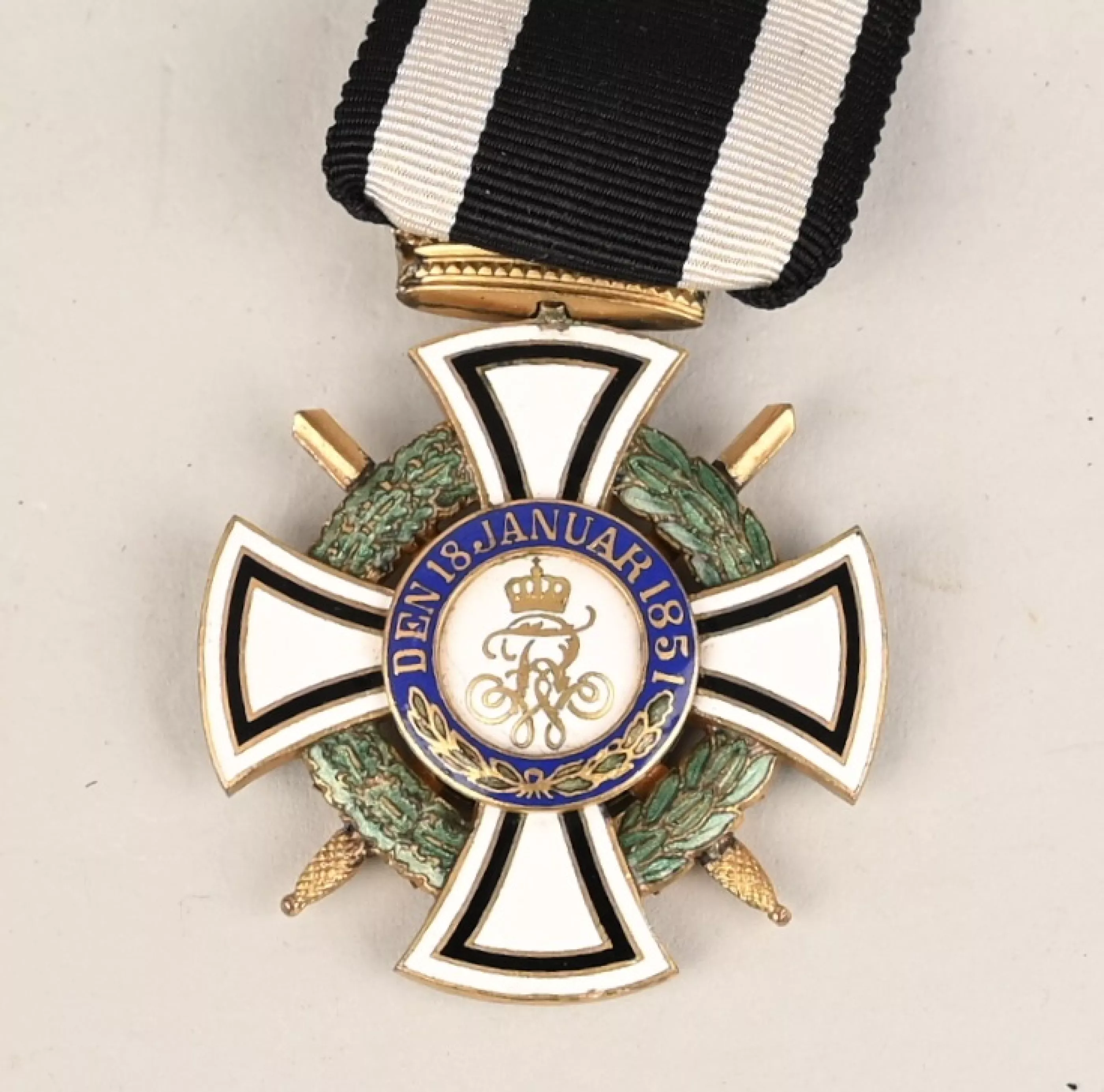 Prussian Hohenzollern Knight Cross in Gilt Silver. Instituted 18 January 1851 by King Friedrich Wilhelm IV. (1851-1918 issue). Constructed of silver with multi-coloured enamels, consisting of a Cross Pattée with white enameled arms highlighted with black enameled borders, joined through the quadrants by a green enameled laurel and oak leaf wreath, with crossed swords piercing the centre, the obverse with a central white enameled medallion bearing a hand-painted Hohenzollern imperial eagle, within a ring of blue enamel bearing a gilt inscription of “VOM FELS ZUM MEER” (“FROM THE CLIFFS TO THE SEA”) with laurel branches, the reverse with a central white enameled medallion bearing a gilt monogram of King Friedrich Wilhelm IV, within a ring of blue enamel bearing a gilt institution date of “DEN 18. JANUAR 1851” with laurel and oak leaf branches, topped by a crown suspension with a Black White and Black Ribbon. No Makers Marks on this example but the Gilding is absolutely terrific and guarranted 100% to period. We assume the medal was made to complete a "Spange" at some point. In overall near mint to MINT condition.