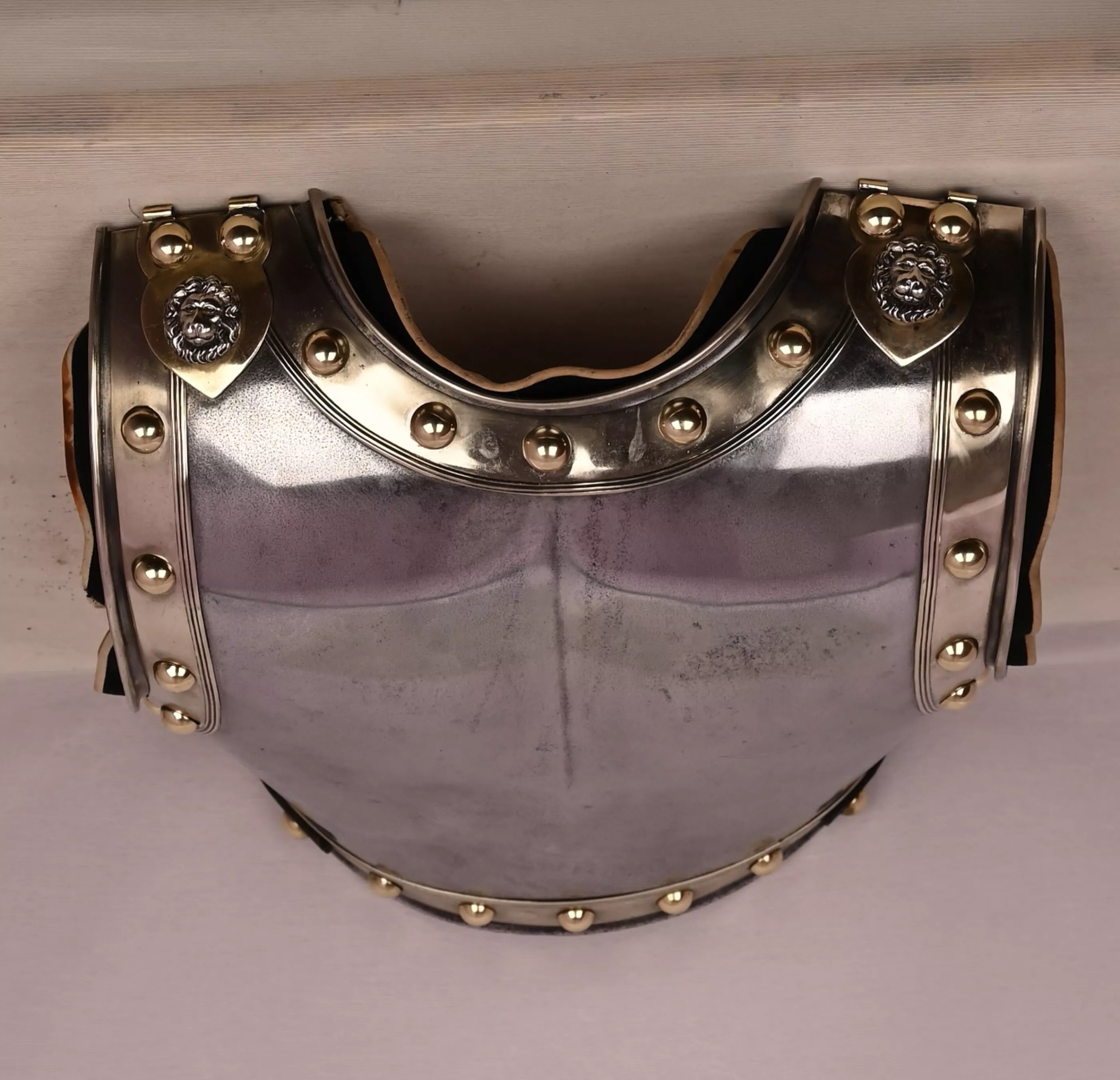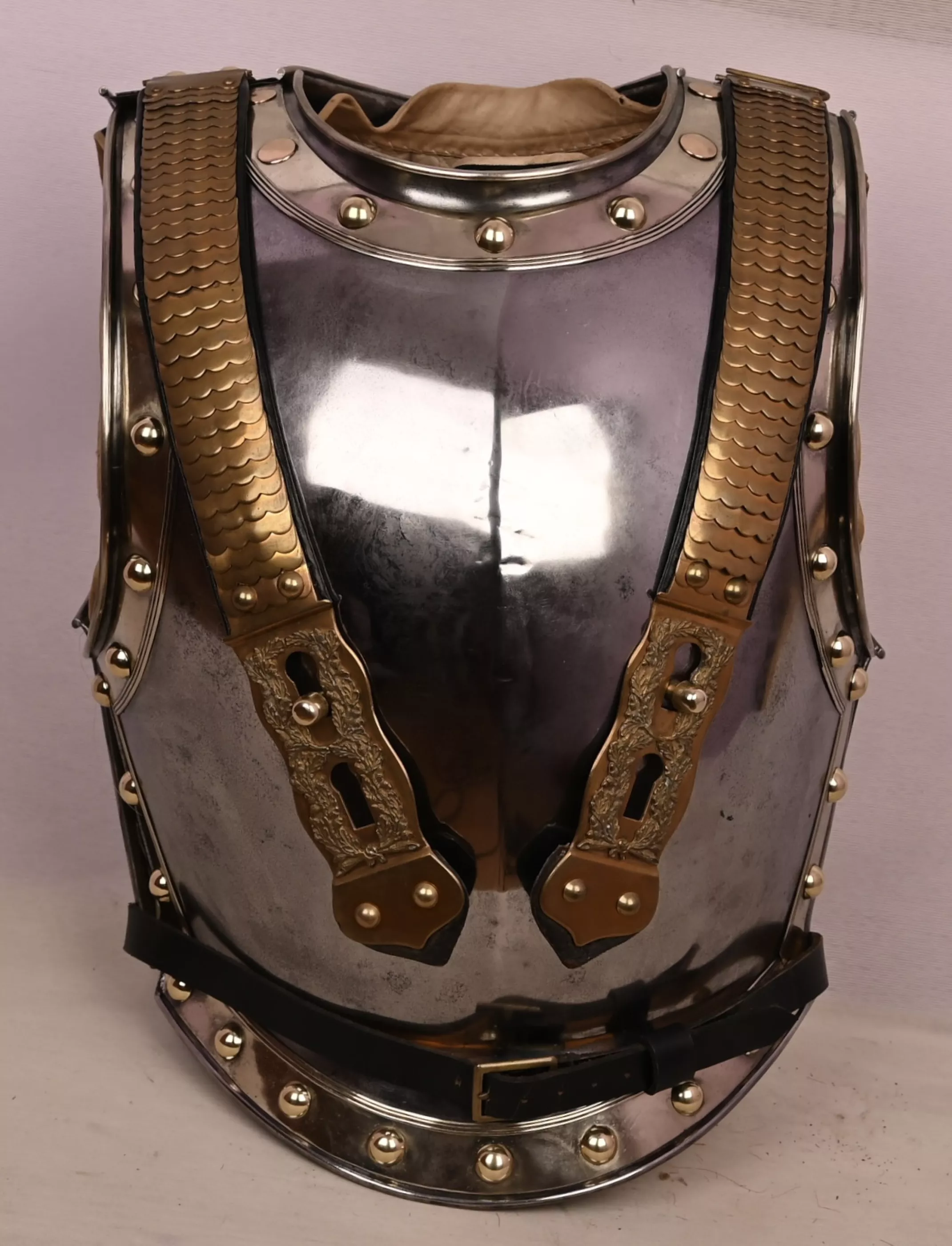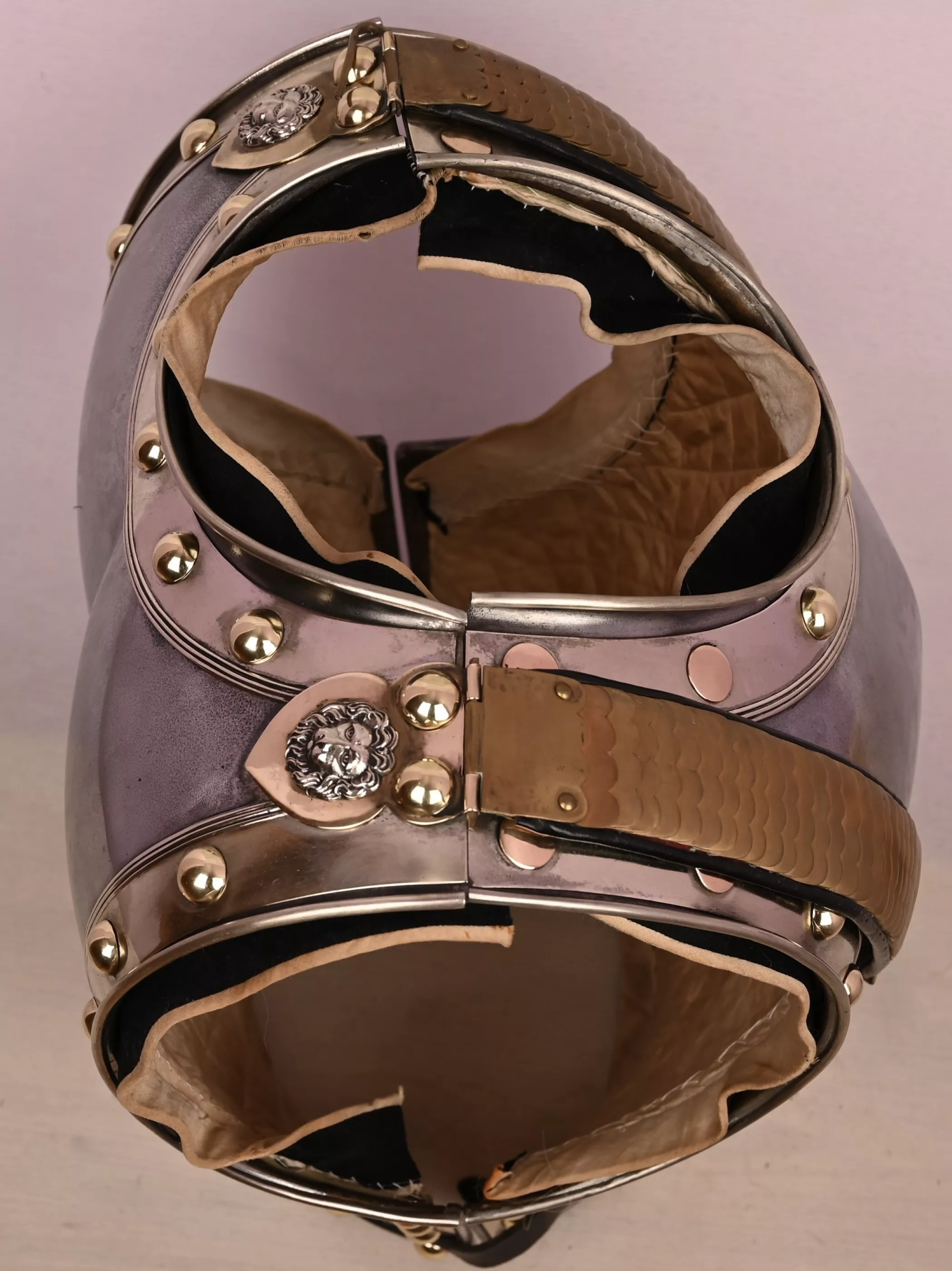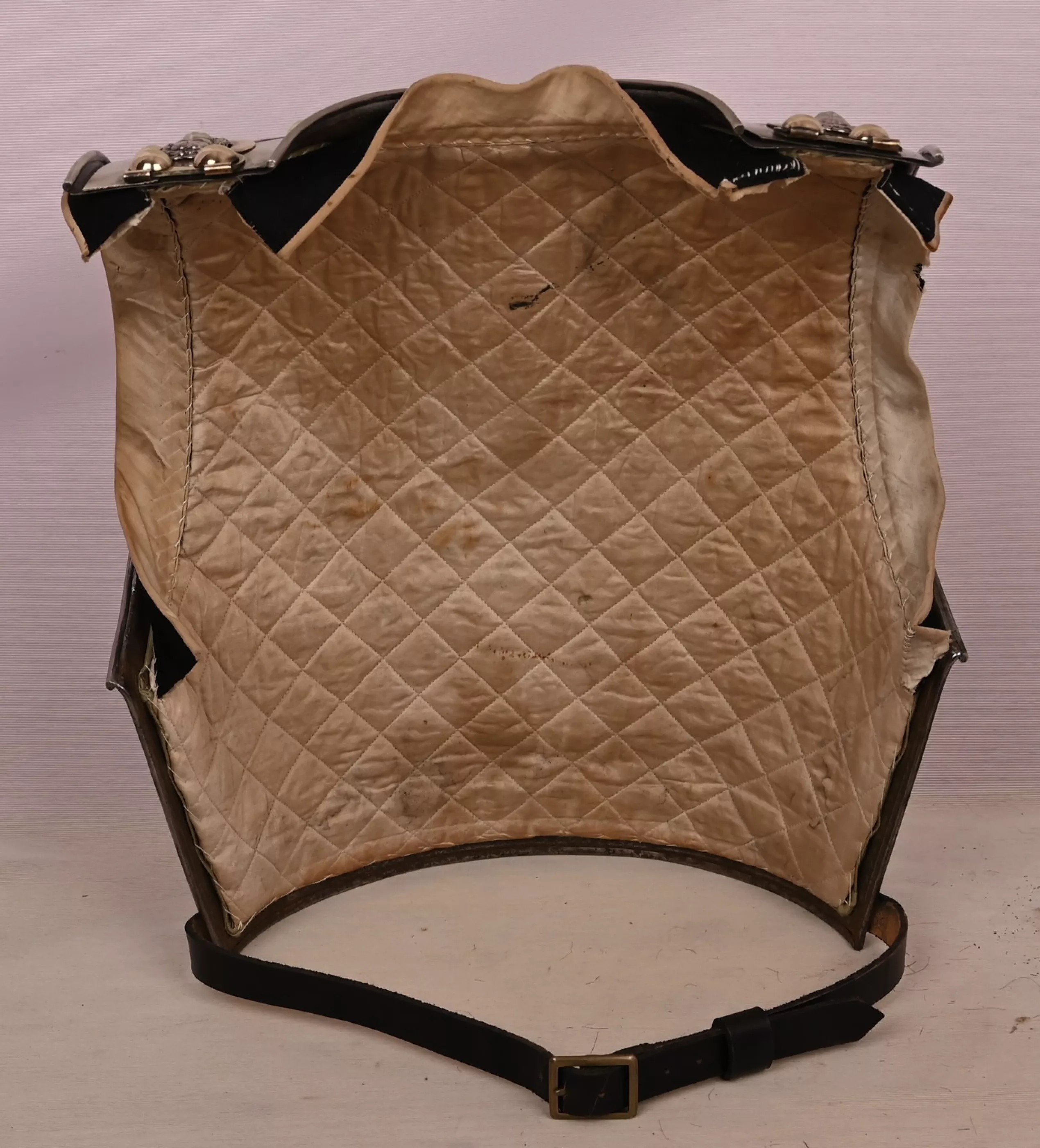 Elegant Prussian Officer's Kurass for Line Regiments. Ultra light construction that was used for Parade Dress purposes. Highly polished steel front and back plate. Both plates have their original waffled tissue lining. The front plate is made of light steel polished to high finish. Please note a few small dents visible tin the middle only. The remaining of the plate is without dents or damage. Both plates have been professionally polished to their original shine. The Gilded brass scaled straps have kept their initial patina. The leather of the belt and straps has also been professionally restored. A fantastic and beautiful ensemble that is rarely seen in the marketplace today