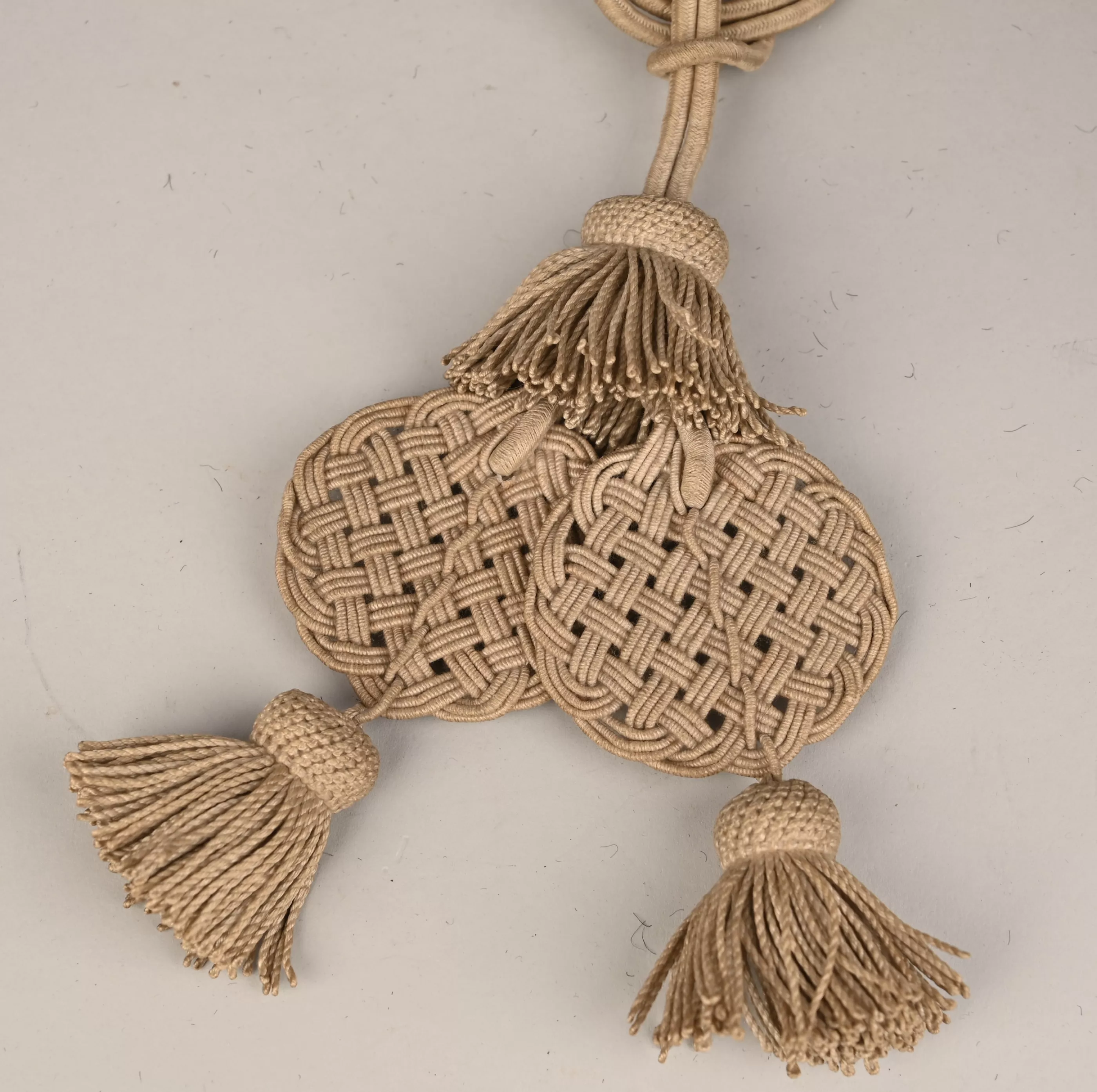 Prussian Leib Garde Hussar Enlisted Tassels for Parade. Unique to this regiments. White cotton braid with three small tassels and two braided discs. Small hook present. Attached to the Fangshnur for parade dress.