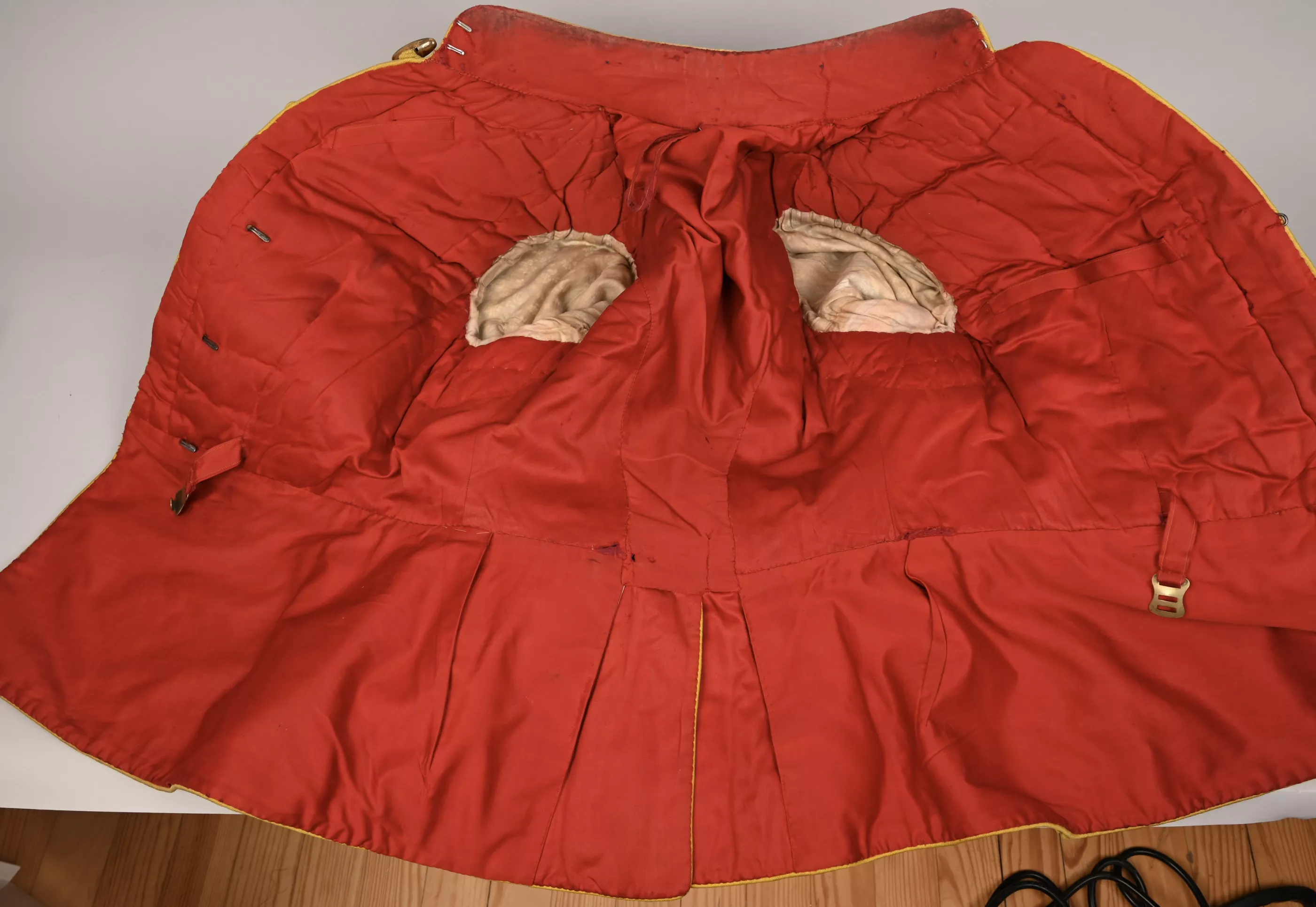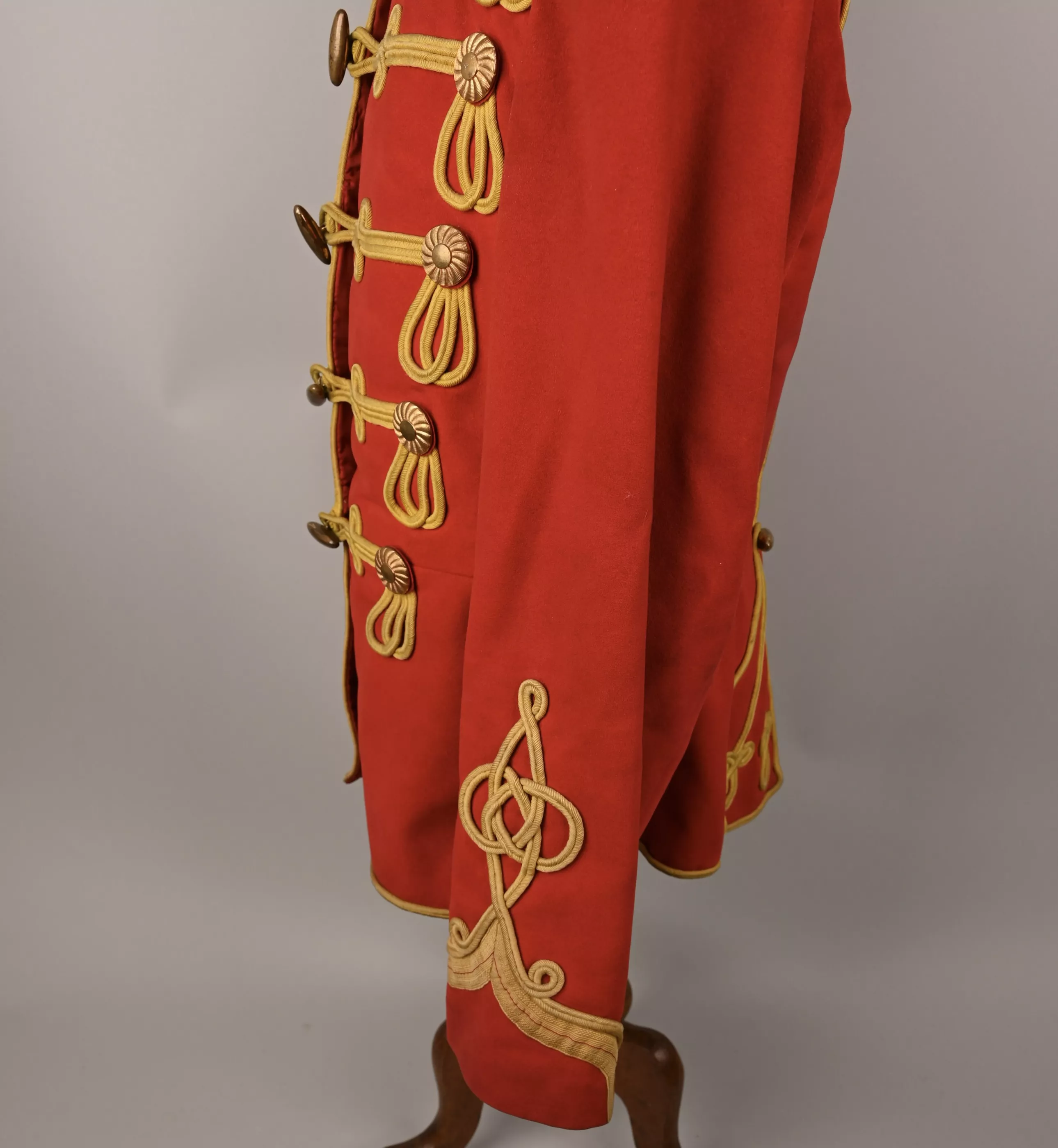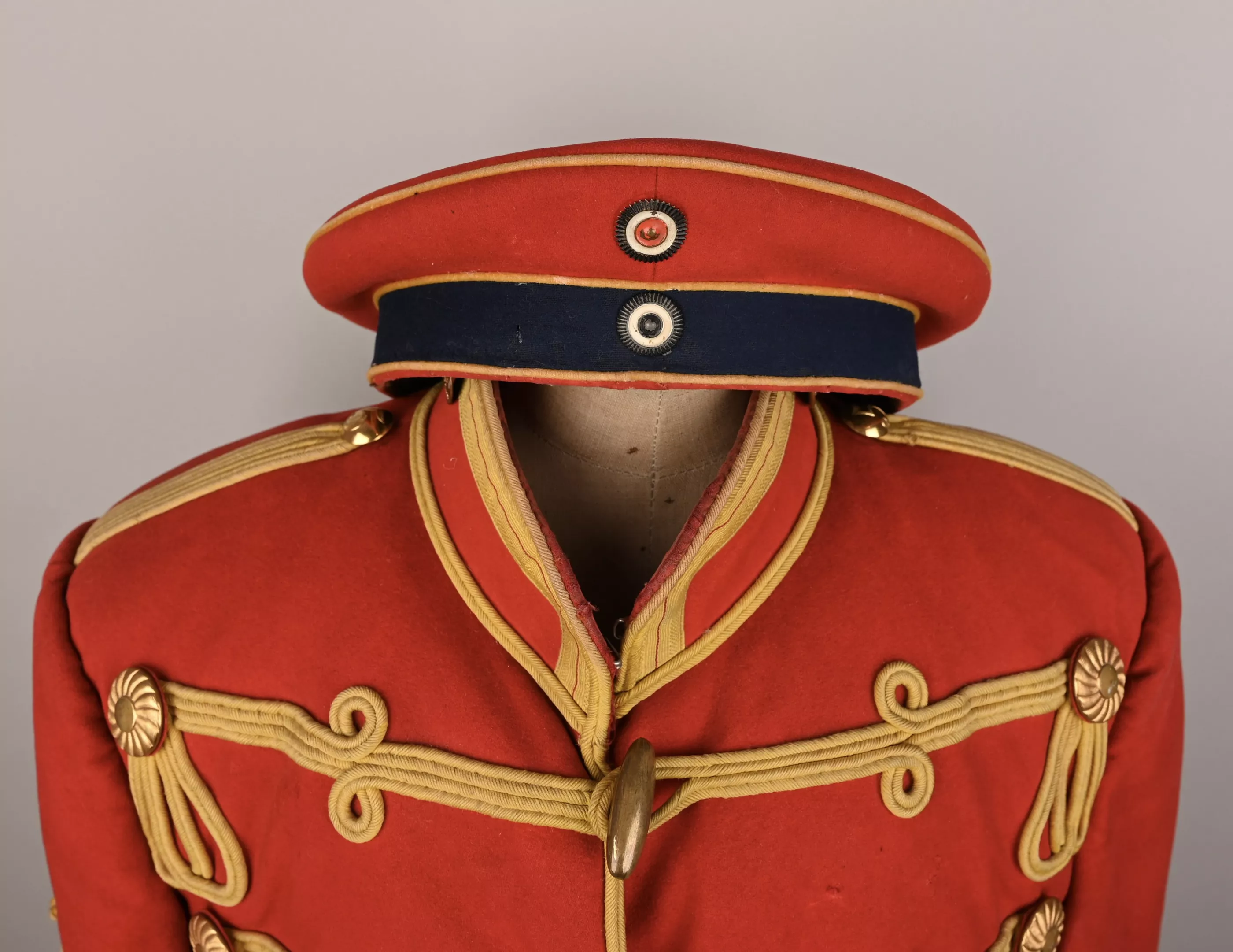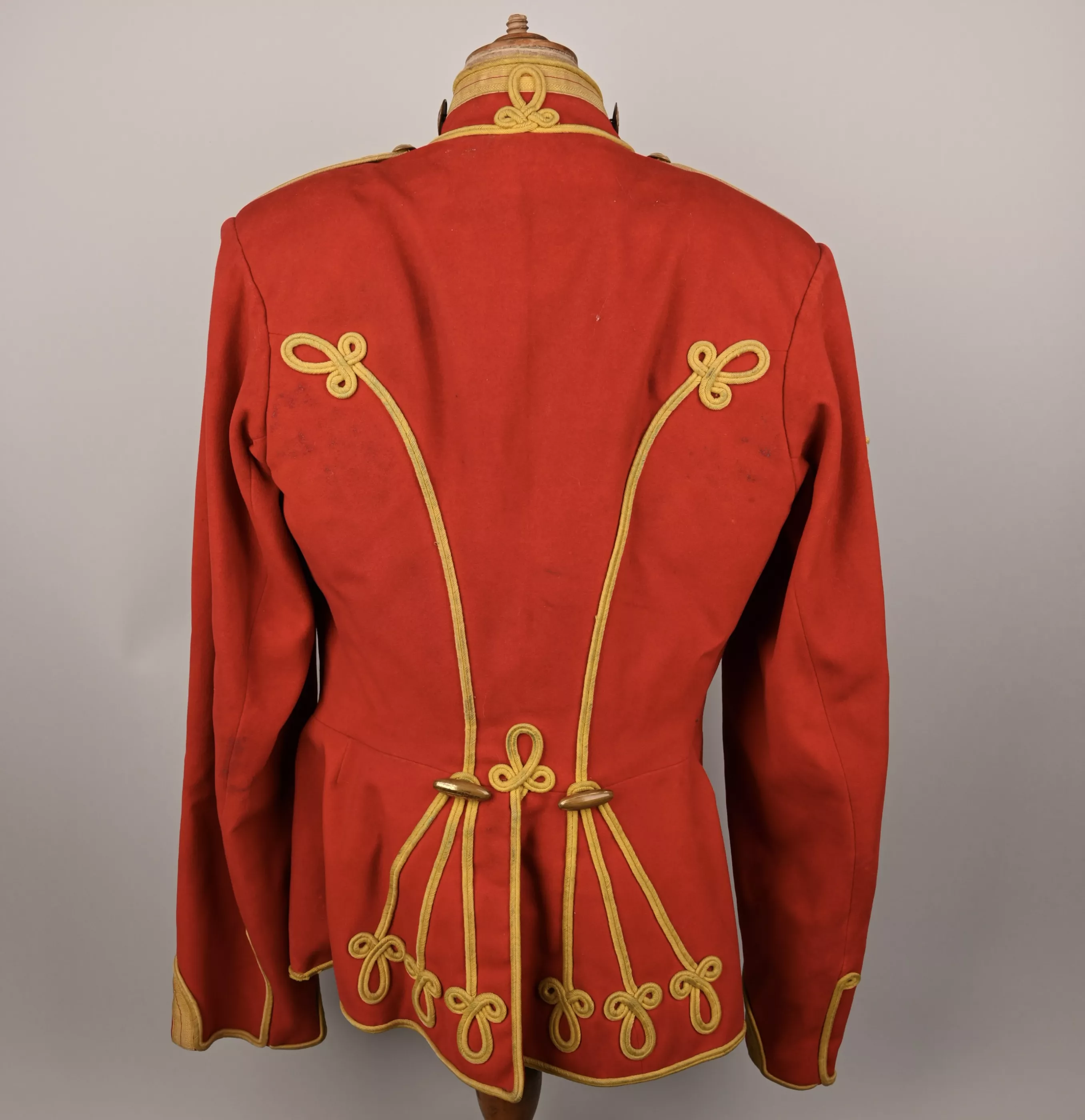 Leib Garde Hussar Attila (Tunic) - Hussar tunic composed of tightly woven poppy red wool decorated with flat yellow woolen braid to the five chest rows of 'frogging', rear trim, collar, Hungarian style cuffs and shoulder straps. The cuffs feature the special yellow trim with red centerline unique to this regiment. Each row of chest frogging features two gilt brass rosettes at each end and a center brass lozenge-shaped fastening toggle. A yellow braid first class lance / sword proficiency award is present on the upper right sleeve. The interior is lined with bright red linen cloth. Tunic shows some minor wear and dirt spot but no mooth damage (see pictures).