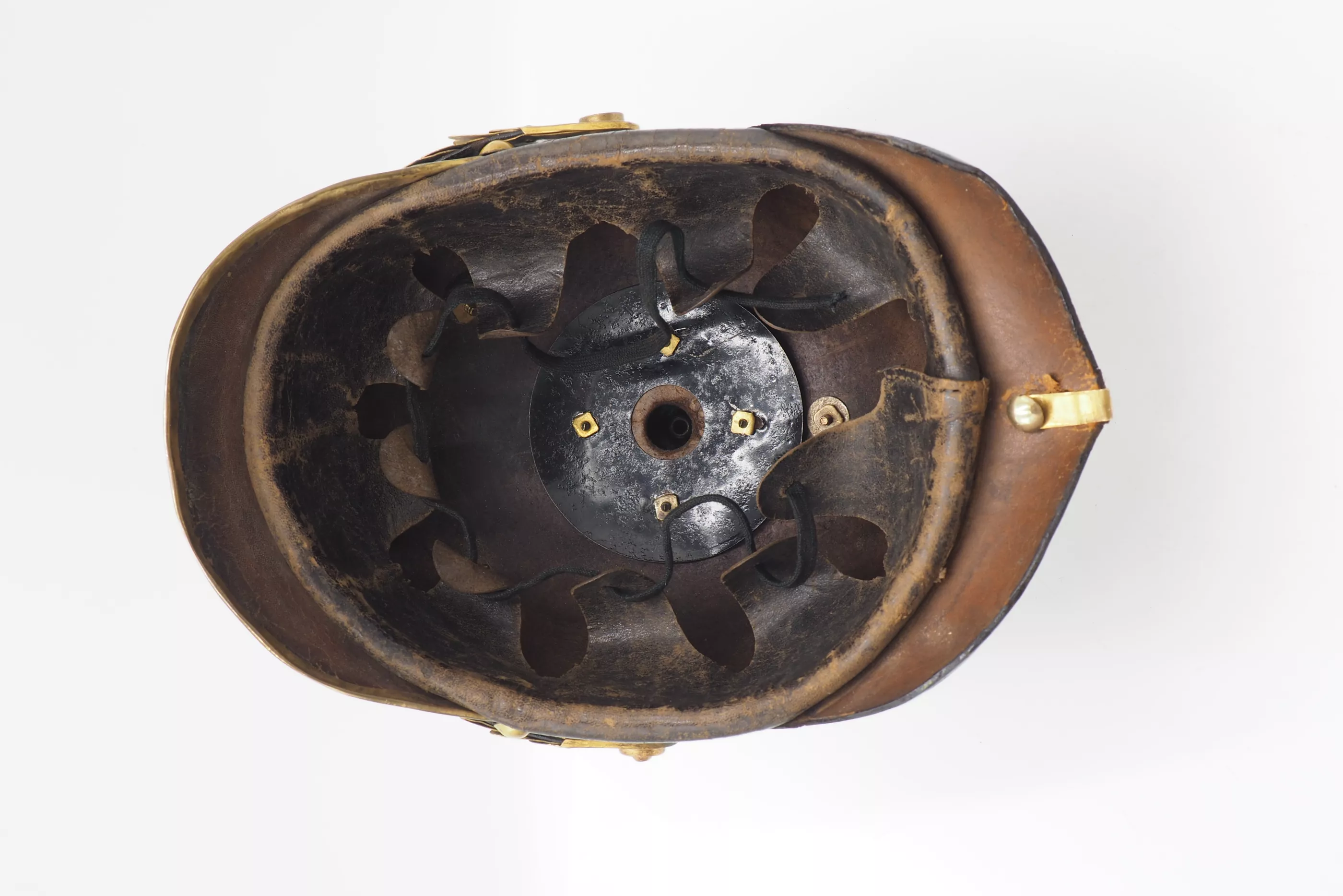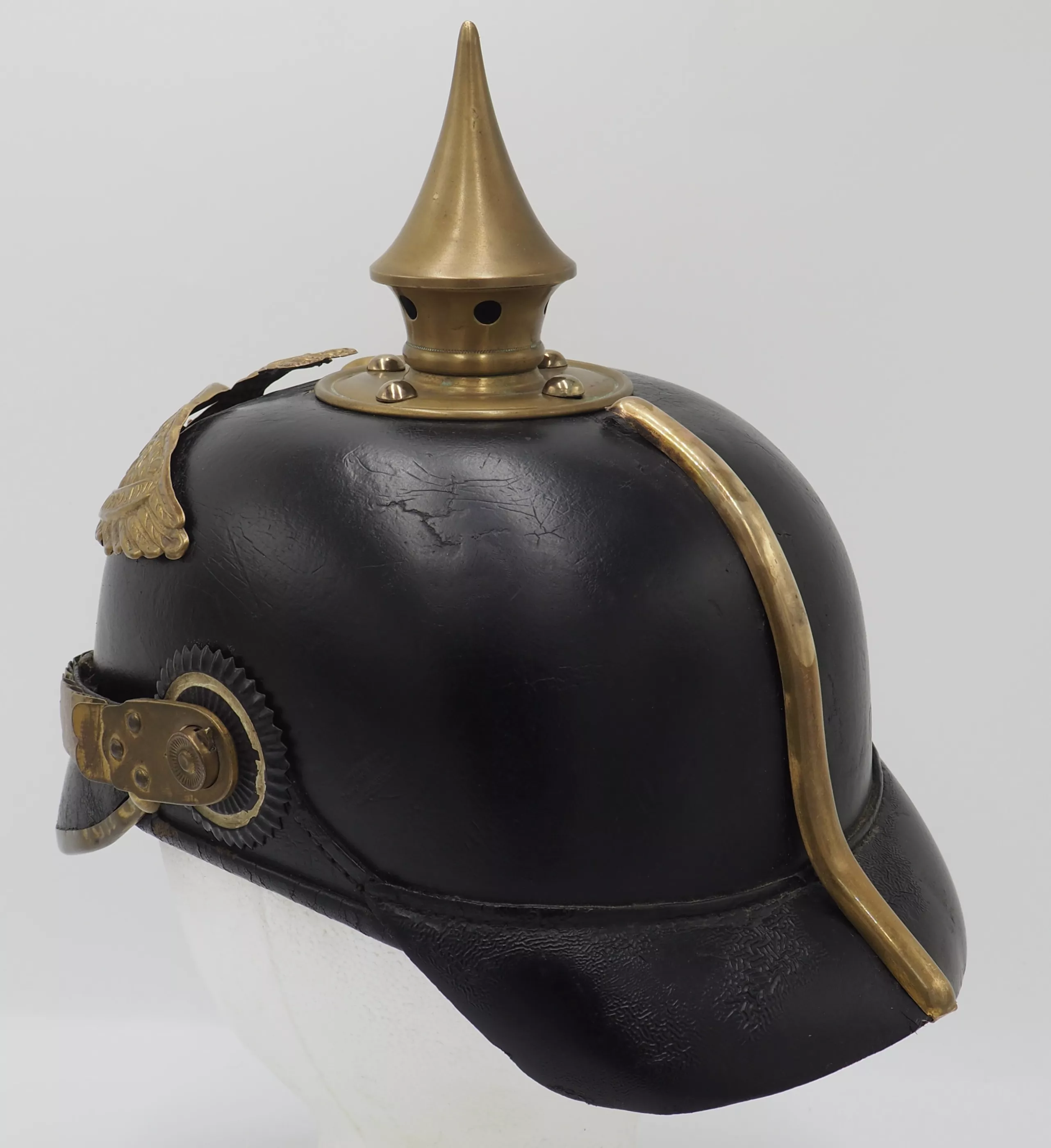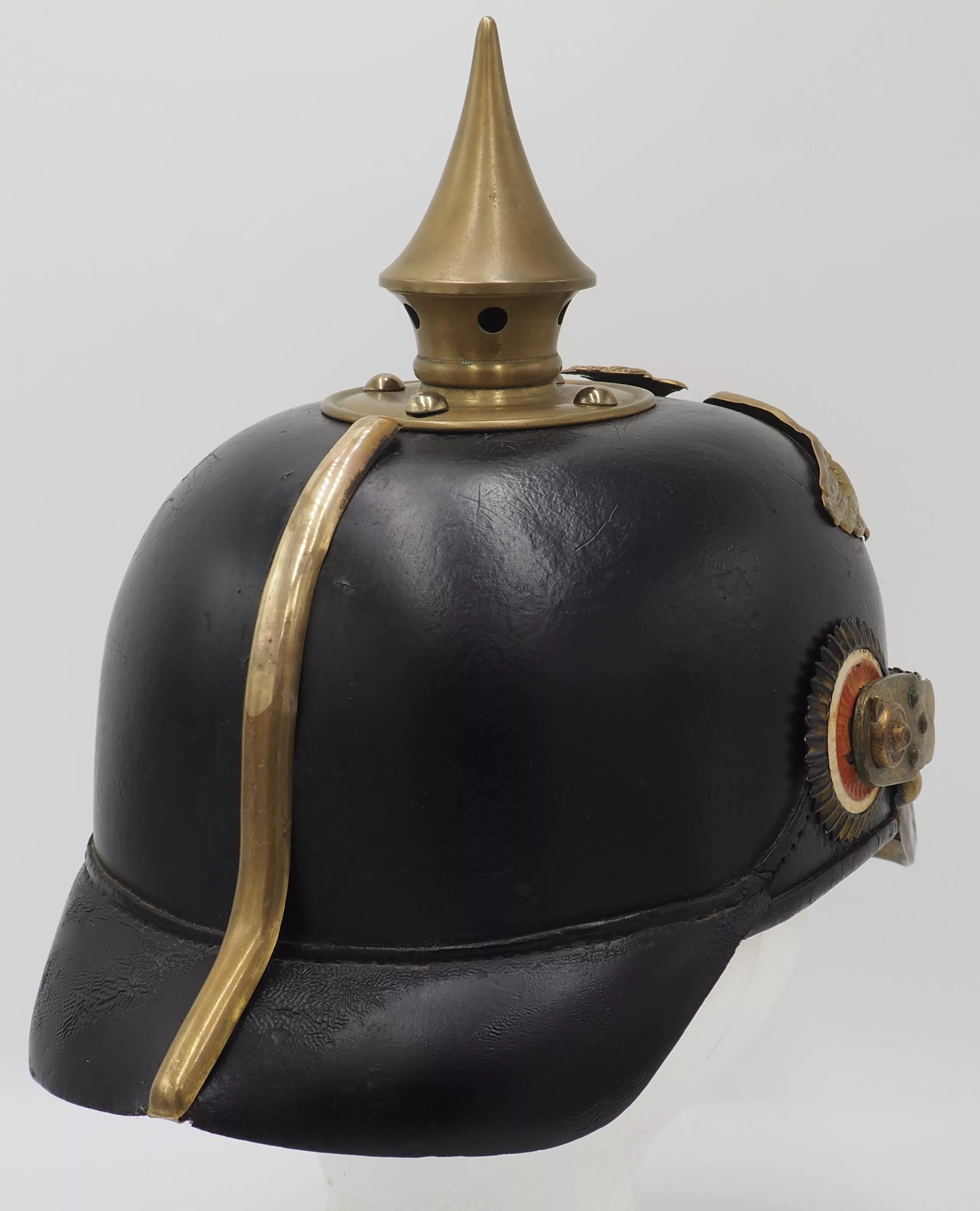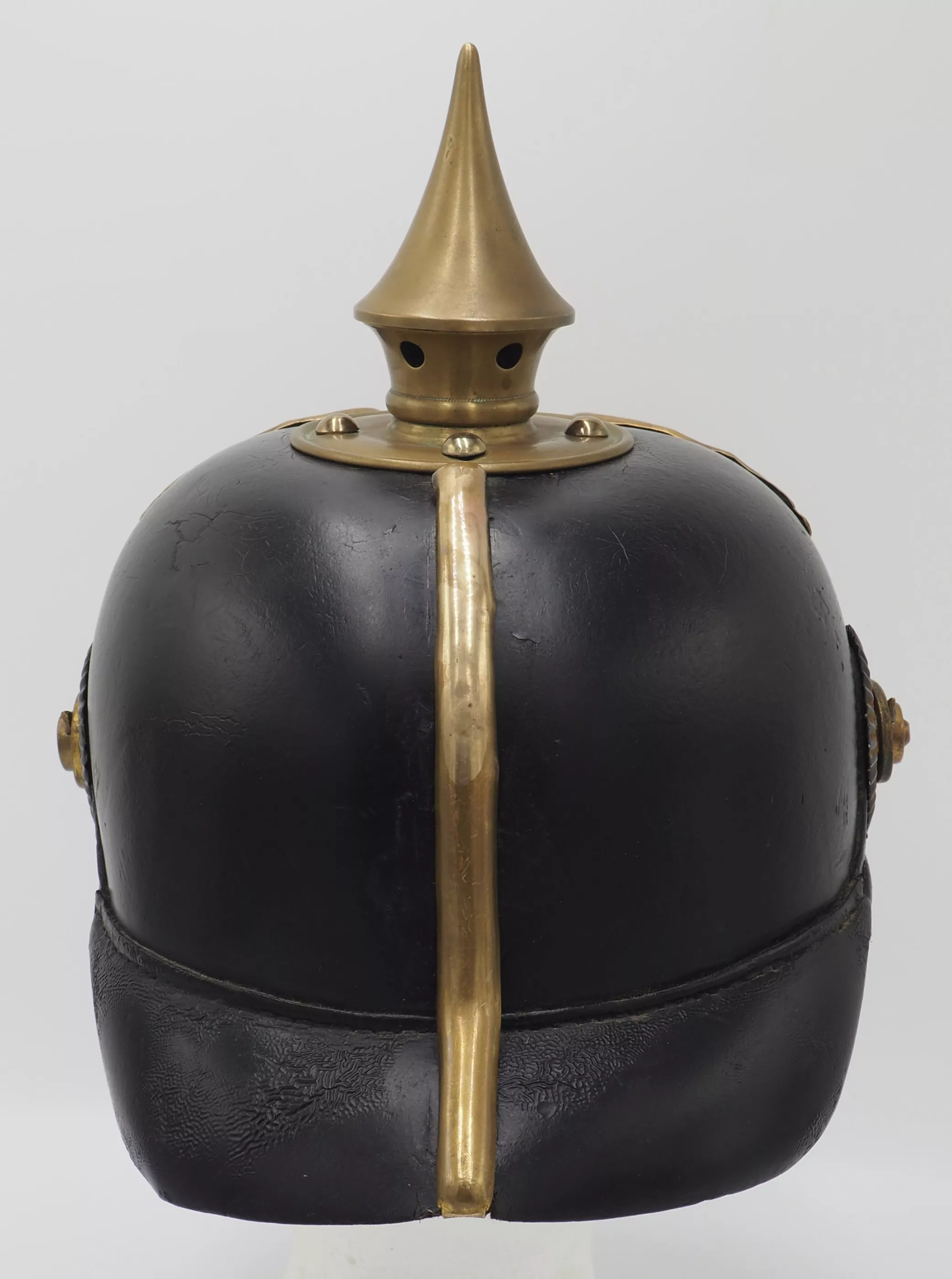 Prussian Guard Infantry and Grenadier Regiments Enlisted Man - Model 1891*. Heavy black leather helmet body with brass metal trim. The leather helmet body in fine condition with firm stitching. The exterior lacquer in excellent condition with a dulled age related finish and no lacquer loss. The helmet body has the pre-1895 "punched" holes (In 1895 the looped retainer and grommeted holes was introduced) for the screw back helmet front plate. There is a small extra hole beside one of the retaining holes that appears never to have been use (see photo).