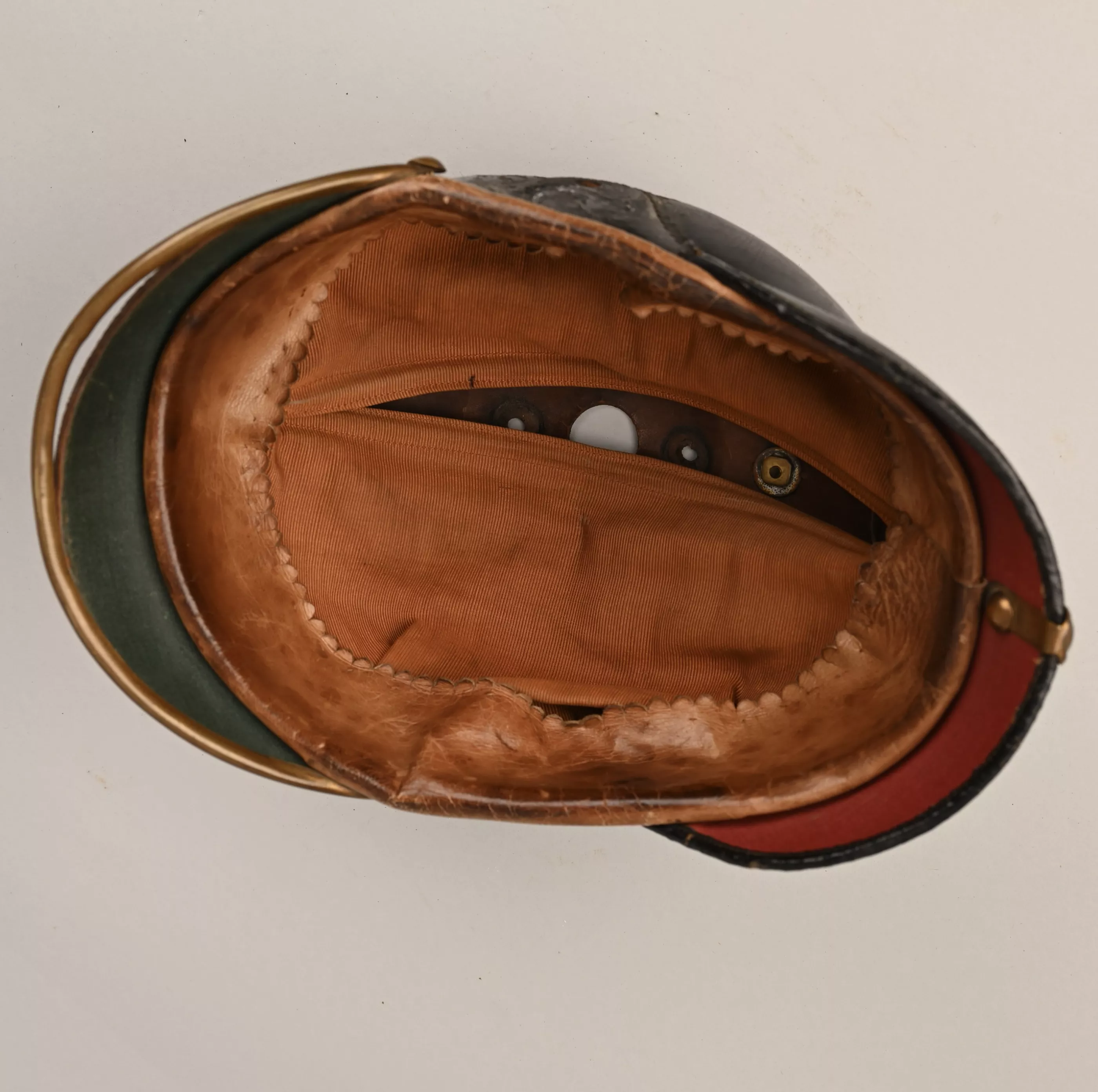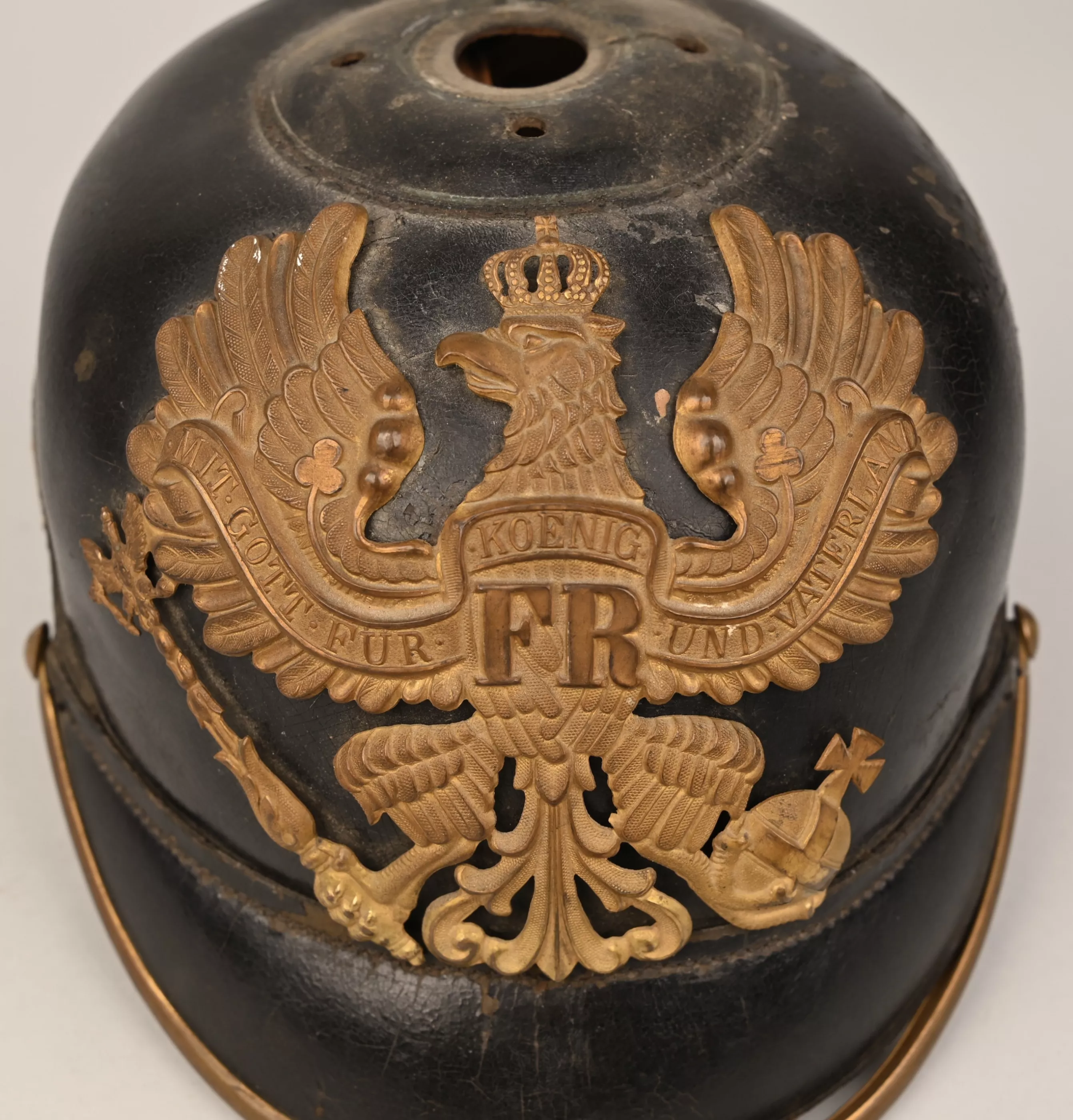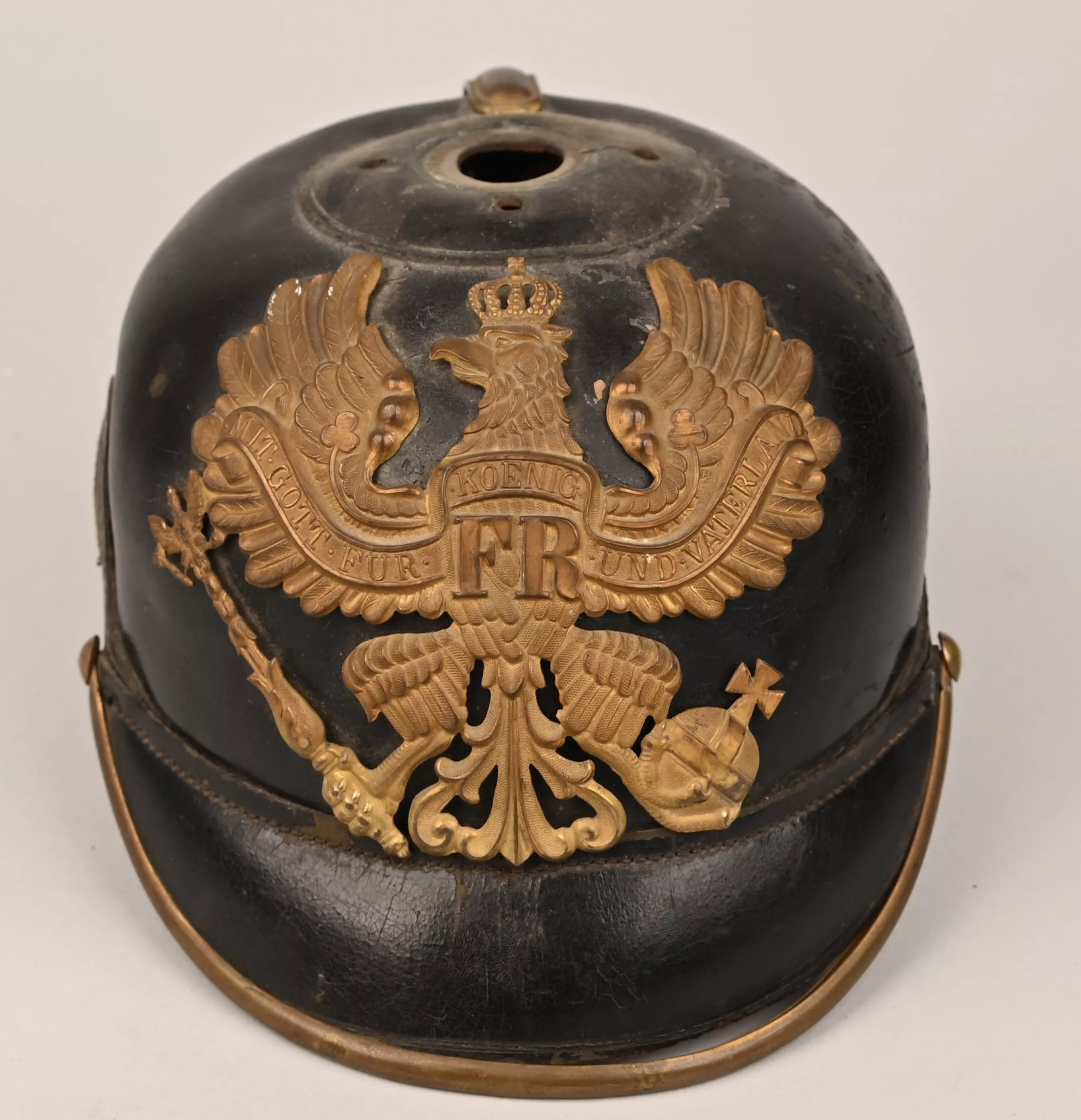 Black laquered leather helmet body in excellent condition with only minor flaws to finish. Both visor of offciers quality and firmly stitched to helmet body. Note that the front visor trim is slightly loose from the leather part and needs to be re-fitted (see pictures). Fire gilt trim with Prussian Officer's Line Eagle attached with two screw/nuts - no extra holes and plate is a prefect fit. Back spine complete and loose from stress on the uper part (see picture). Very nice officers liner with both origional sweatband and silk attached. Missing Spike, attachements, scales and Cockades. A nice helmet that merits to be completed.