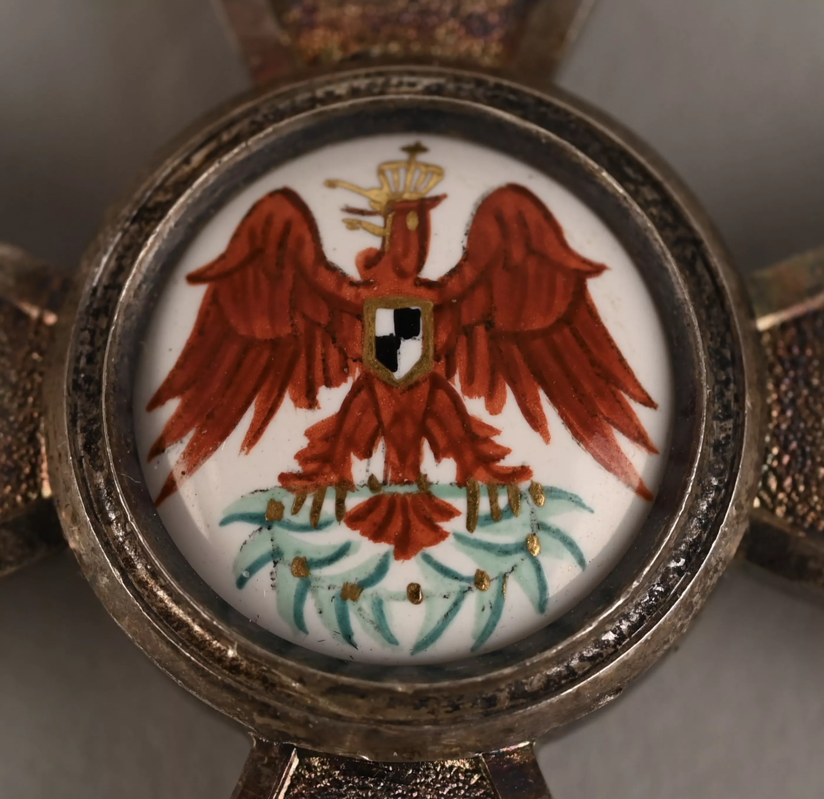 Order of the Red Eagle, 4th Class "Roter Adlerorden". Last model before 1918. Cast and enamelled in one piece. Zinc-gilt cross. The obverse shows a central enamelled disc with beautiful and detailed hand painted enamel work of a crowned red eagle. The reverse shows a Prussian Crown and 'FW' cypher. Unmarked with remanant of original ribbon.