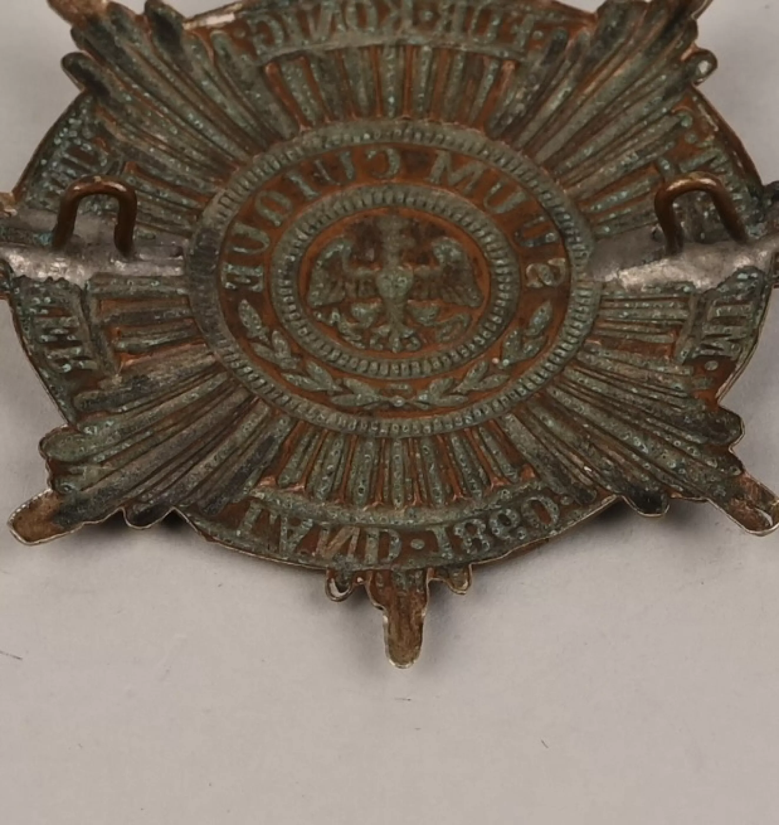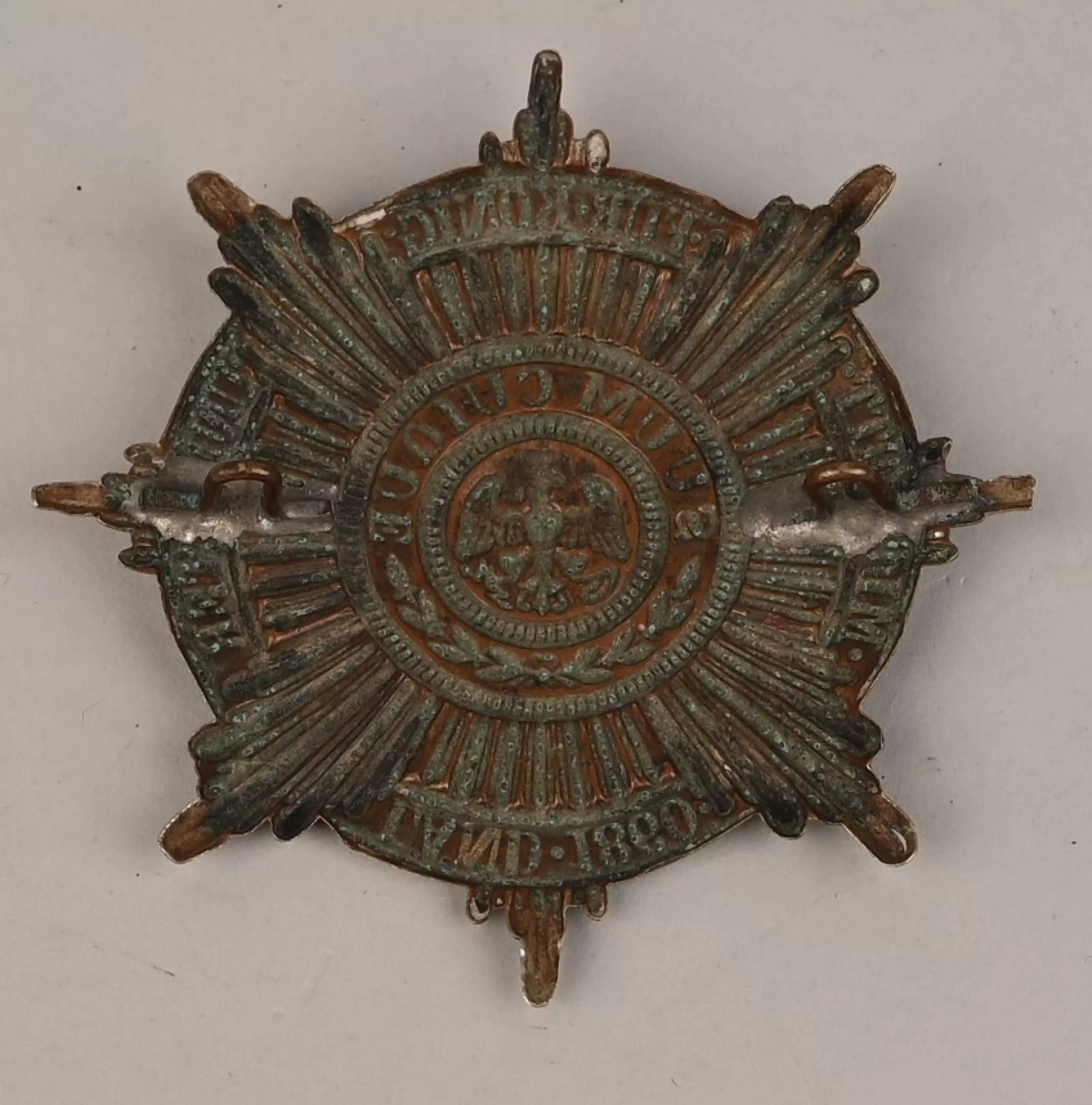 "German Silver" or "Maillechort" frontplate for a Prussian Garde Jäger/Schützen, Garde MG or Garde Transport troops Shako. Plate is 100% original to period and had both the original loops soldered to its back. Distance aprox from center loops 54mm.