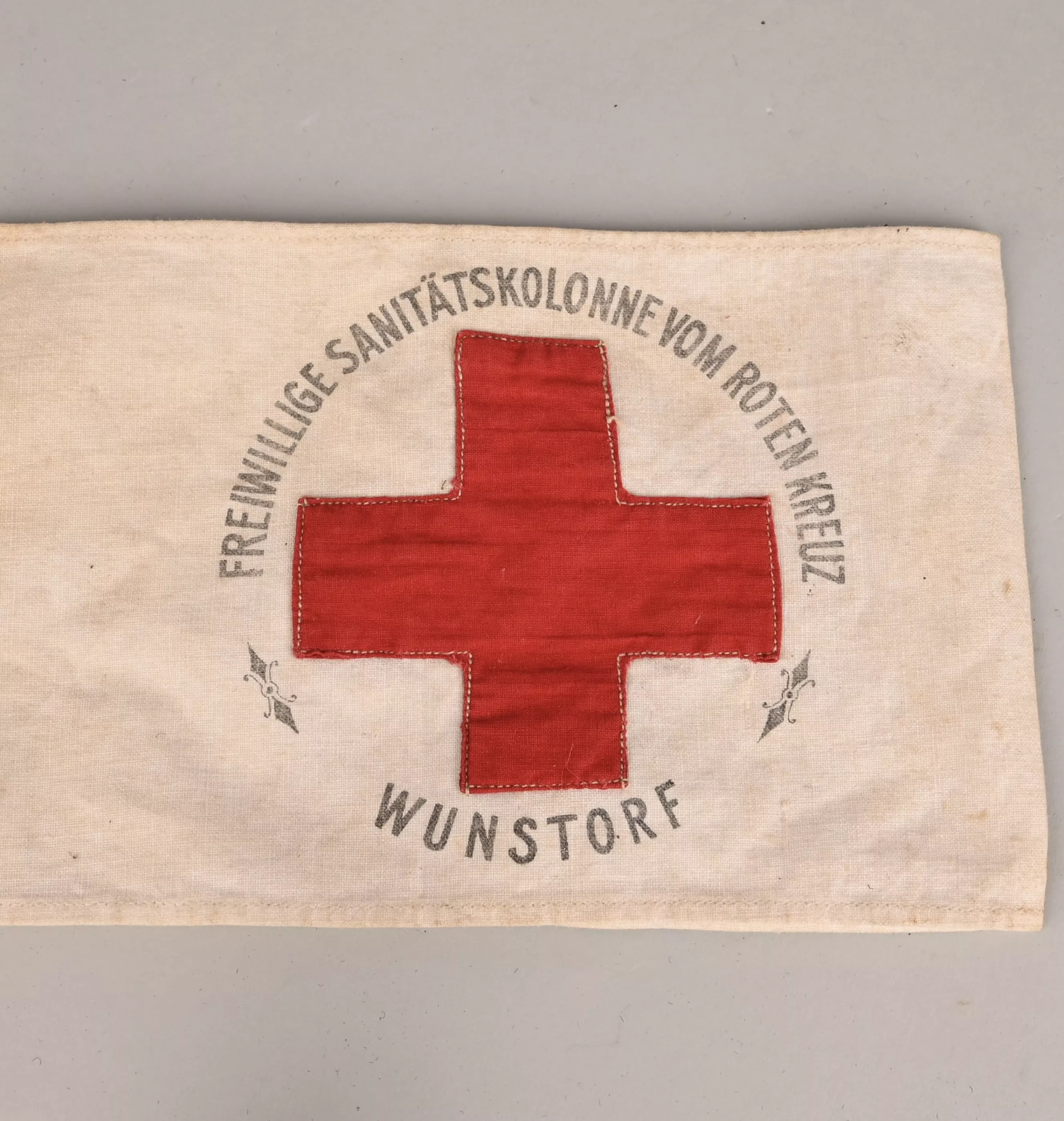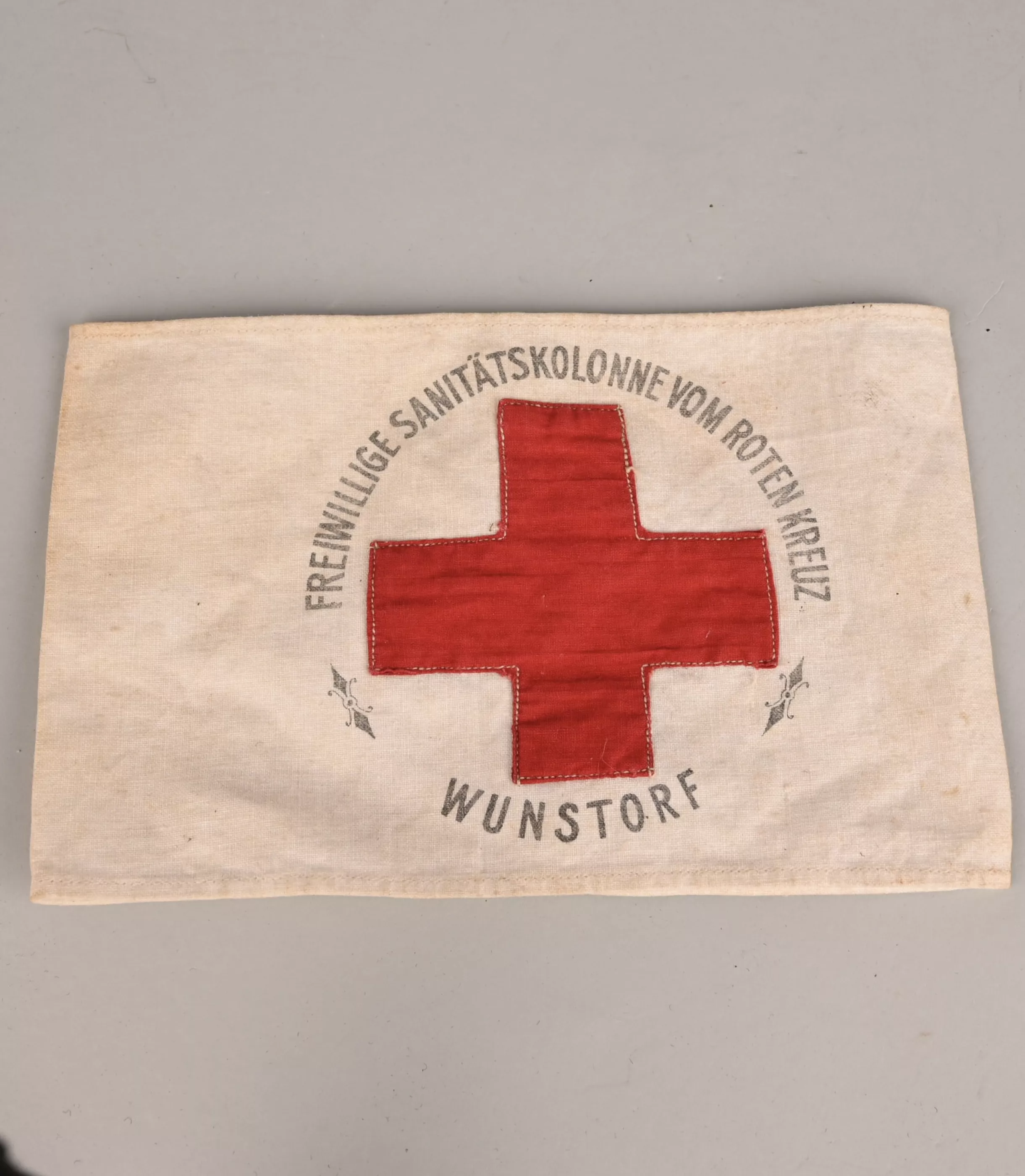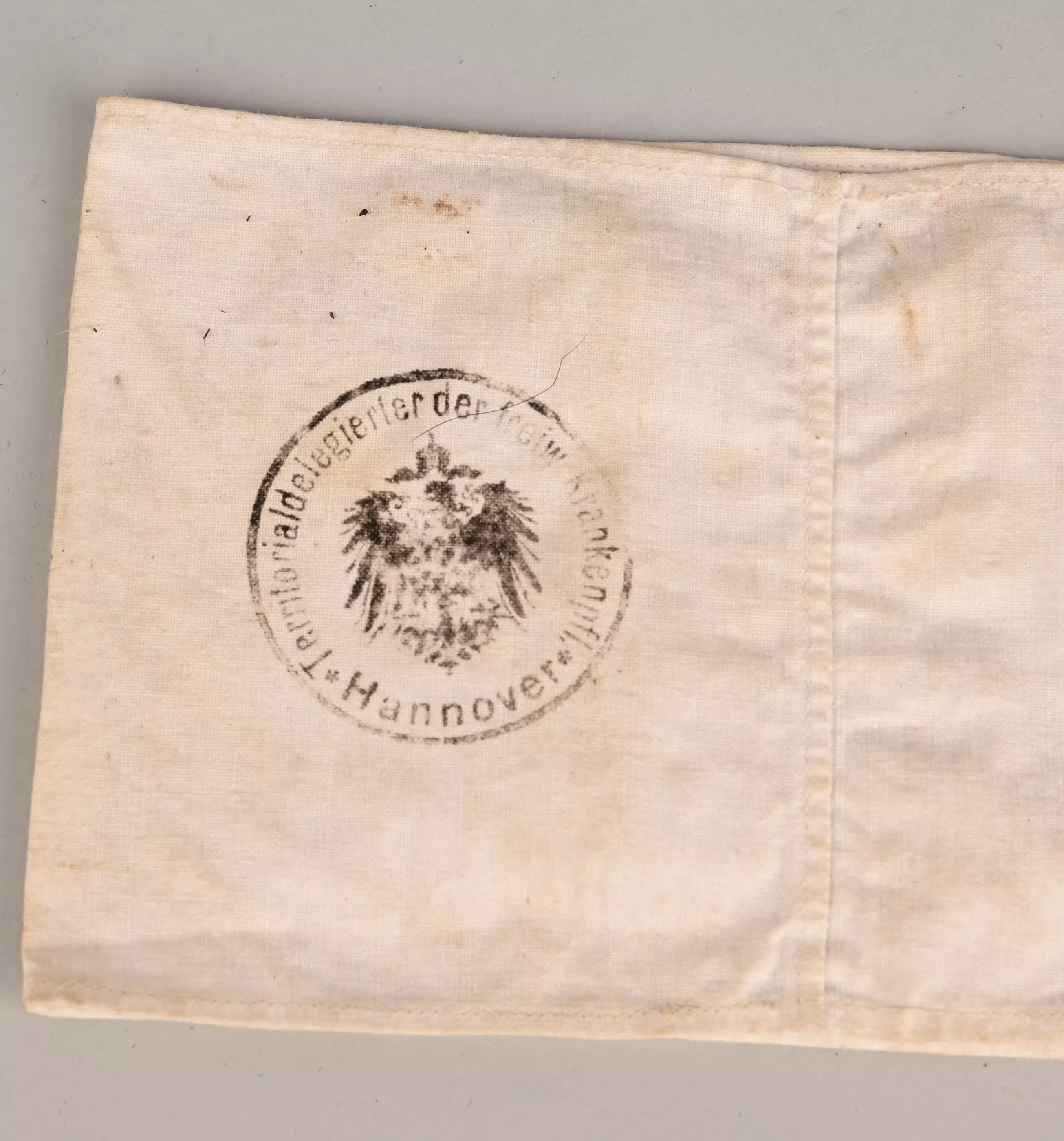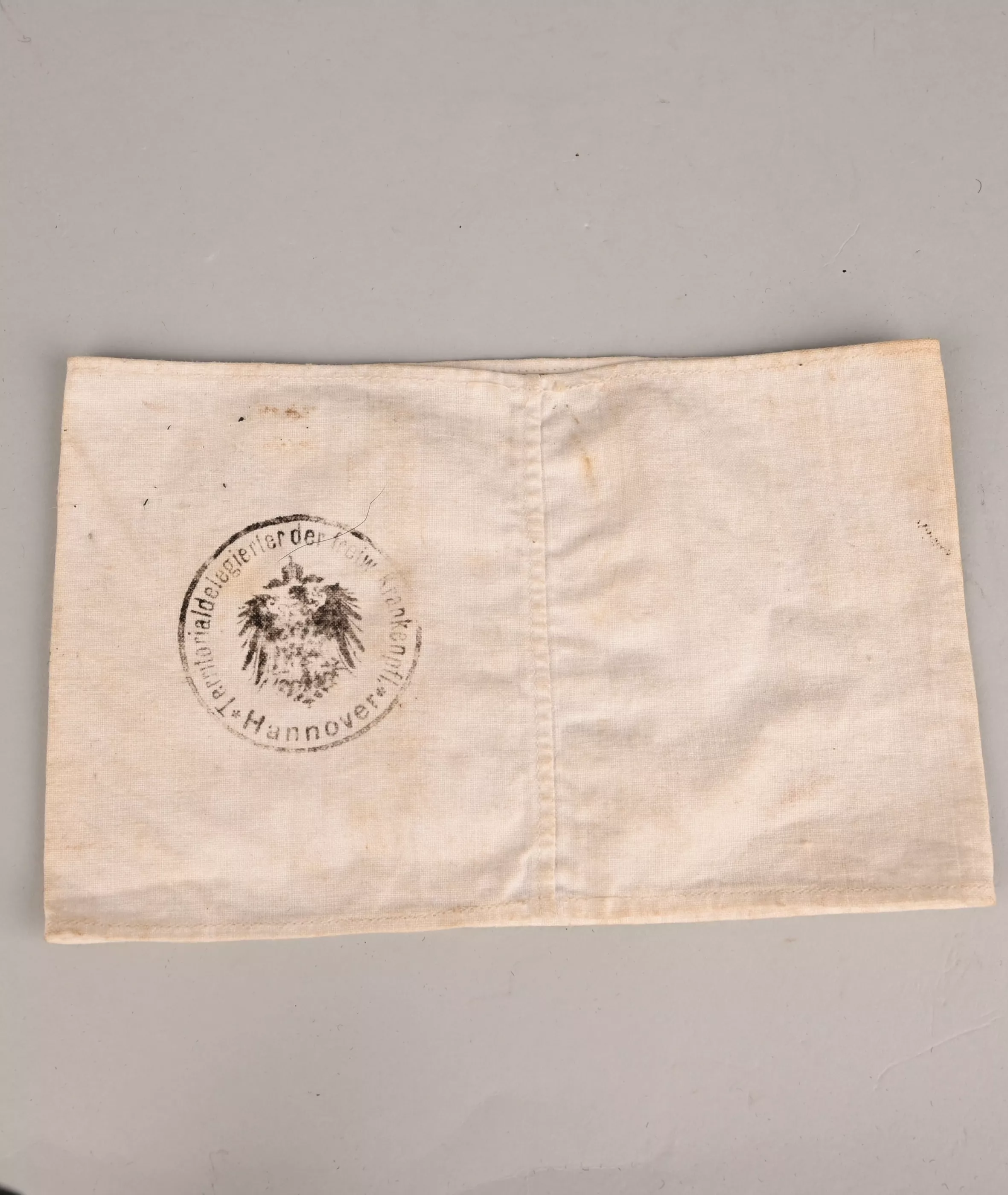 White cotton Armband Aprox. 190mm X 120 mm on one side. Marked "Freiwillige Sanitätskolonne vom Roten Kreutz" "WUNSTORF". Stamped on the back "Territorialdelegierter der Freiw. Krankenpfl. Hannover". Reichs adler in the center. Most likely worn by the the Staff.