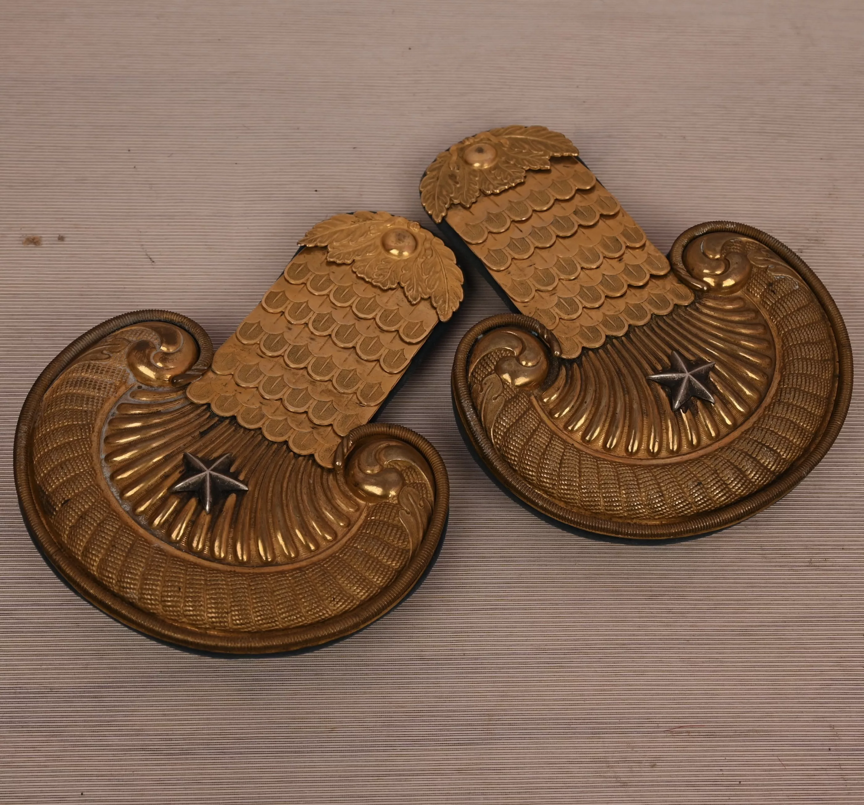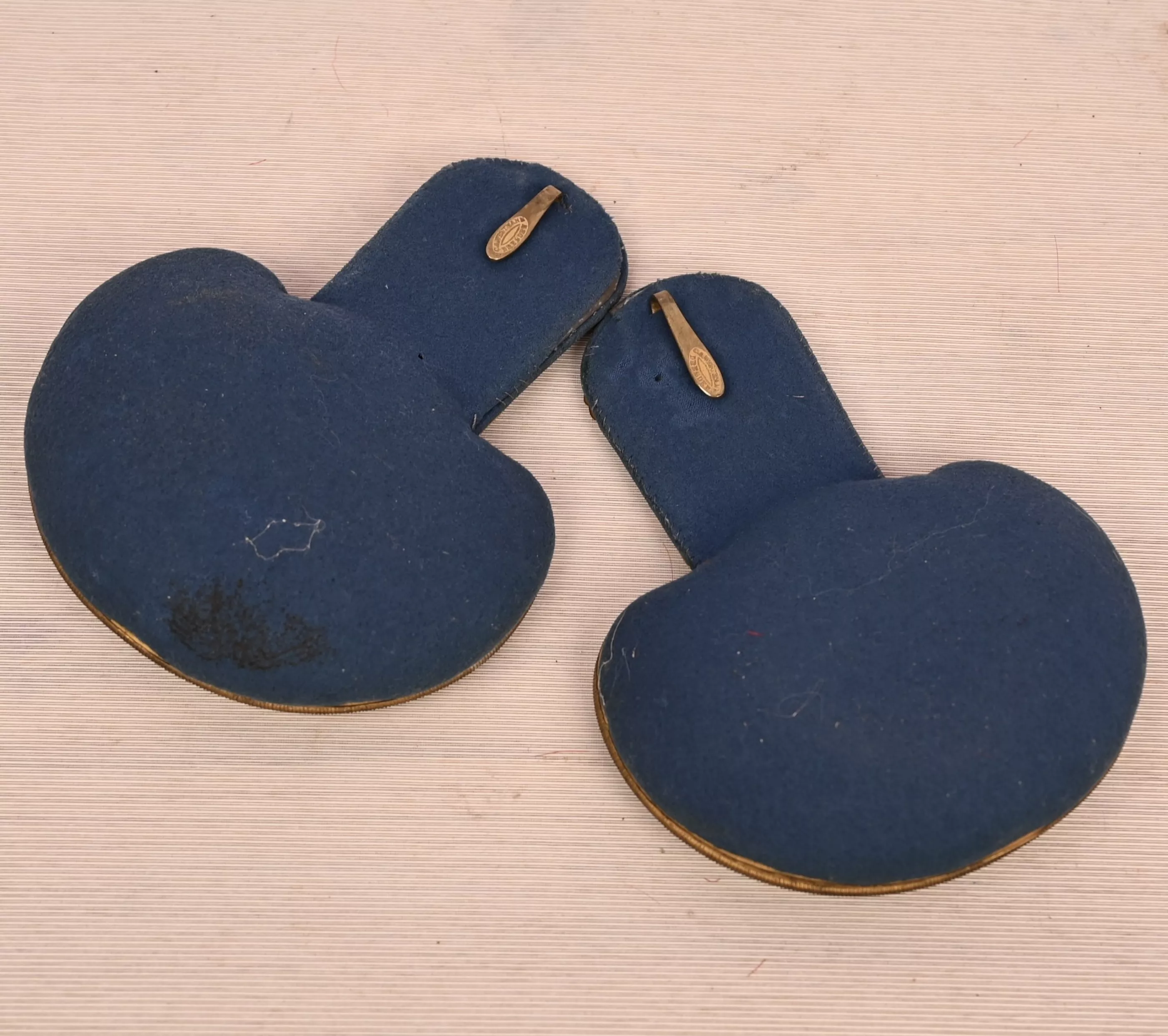 Beautiful set of Saxon Garde Reiter Epaulets for an "Oberleutnant" with beautiful gilt frosting remaining on the scales and one Silver Star for his rank. Lined in Corn Blue underneath with only one epaulet showing some minor loose stitching. Marker stamped by "Cawersmann Dresden".