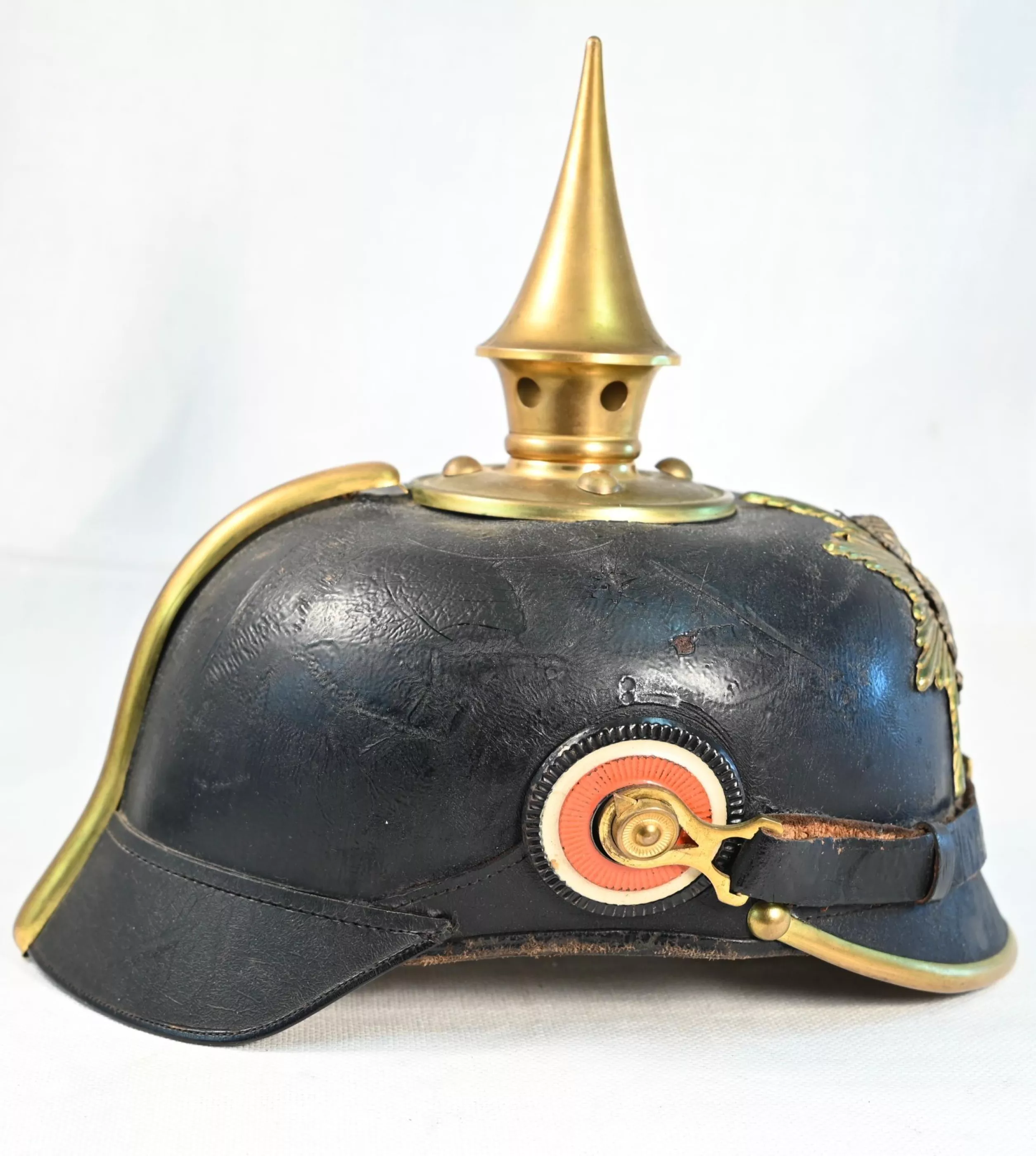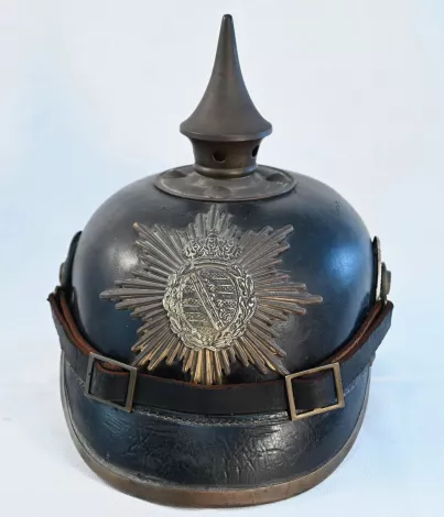 No extra holes in helmet body. Front plate is the Saxon fire gilt star and silver center device (one retaining screw missing). The trim including base/spike retains its fire gilting. Gold brads at base of helmet. The spike is removable. Beautiful and original NCO type leather strap (seems a bit of center, but also stuck to helmet body forever, we did Not try to remove it or center it). Special non-seratted Saxon and Reichs Enlisted/NCO cockades. This helmet is 100% original and untouched. Great WWI era Saxon NCO/Officers helmet difficult to upgrade.