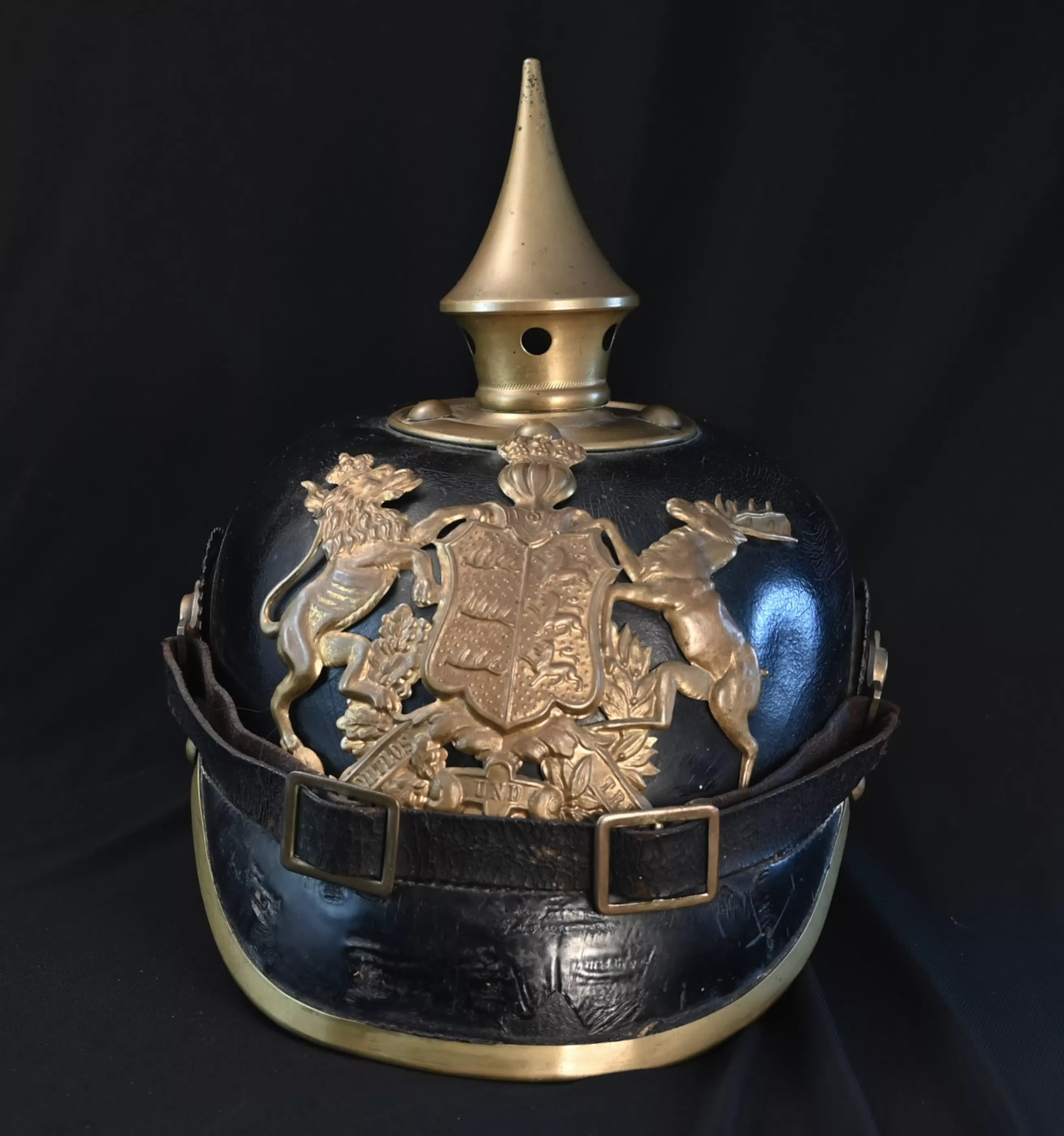 Wurttemberg Infantry Enlisted Man for Line Regiments Model 1891. Beautiful black lacquered helmet body with gold/brass trim. Helmet body has perfect form and firm stitching to back visor. Exterior lacquer has very good finish. The frontplate is the Wurttemberg crest with the "Furschtlos und Trew" bandeau, held by two posts with leather wedges. No extra holes. The Wurttemberg crest fits the helmet shell like a glove.