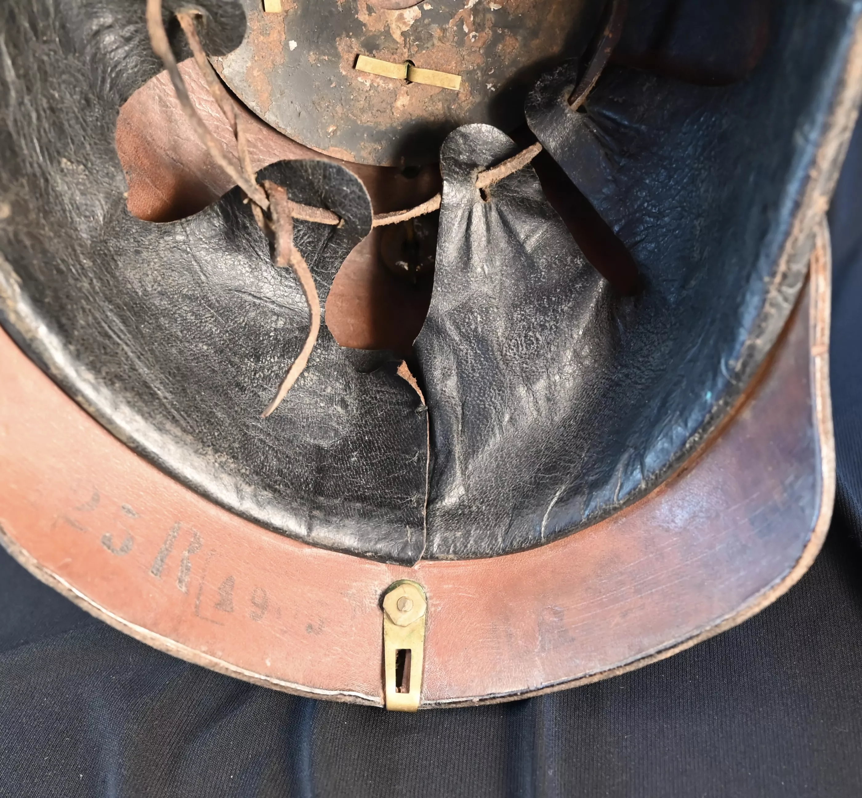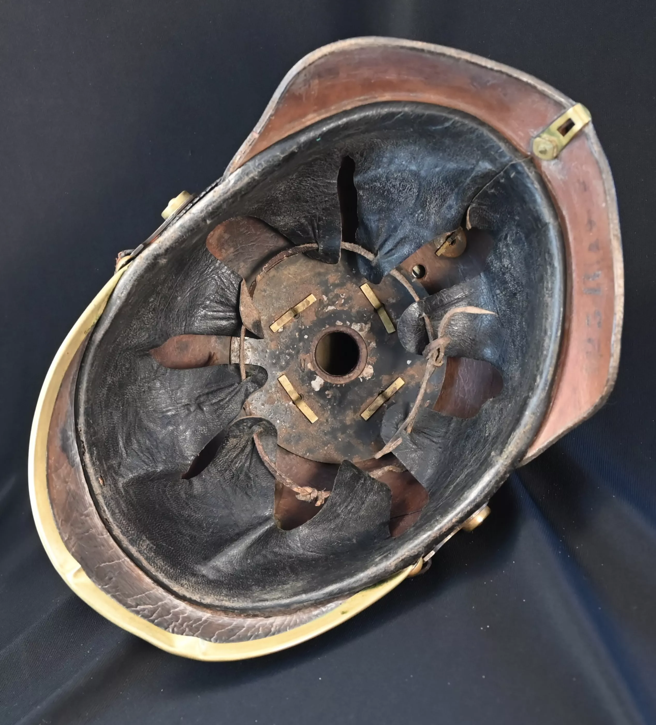 Enlisted style spike on round base with split brad retainers. Spike does not unscrew. Infantry back spine with ventilation slide/hole. Interior has black leather lining with 9 flaps in excellent supple condition. Original leather strap on M1891 style posts over a set of EM style Reich and Prussian cockades. Overall outstanding helmet with "Kammer" markings.