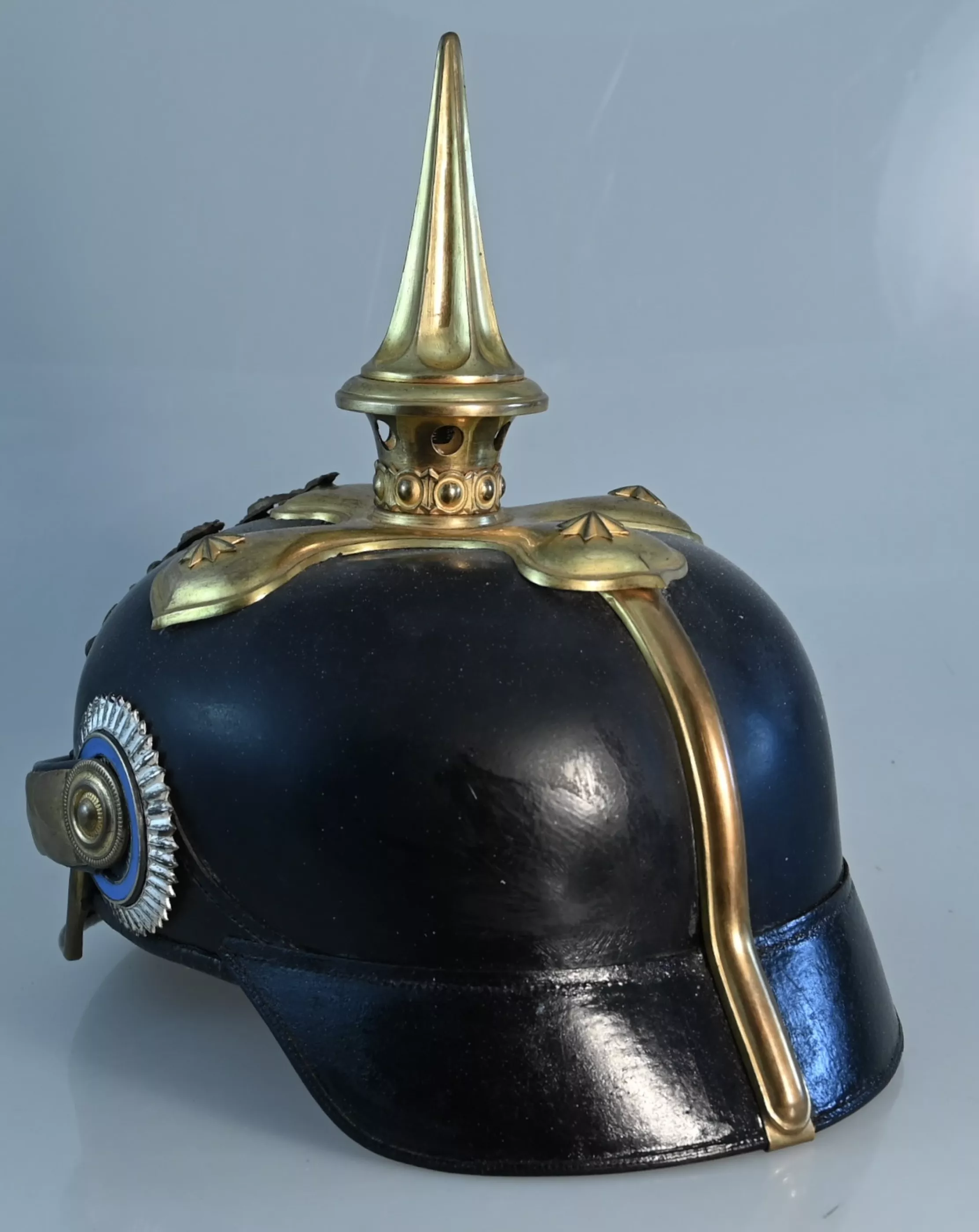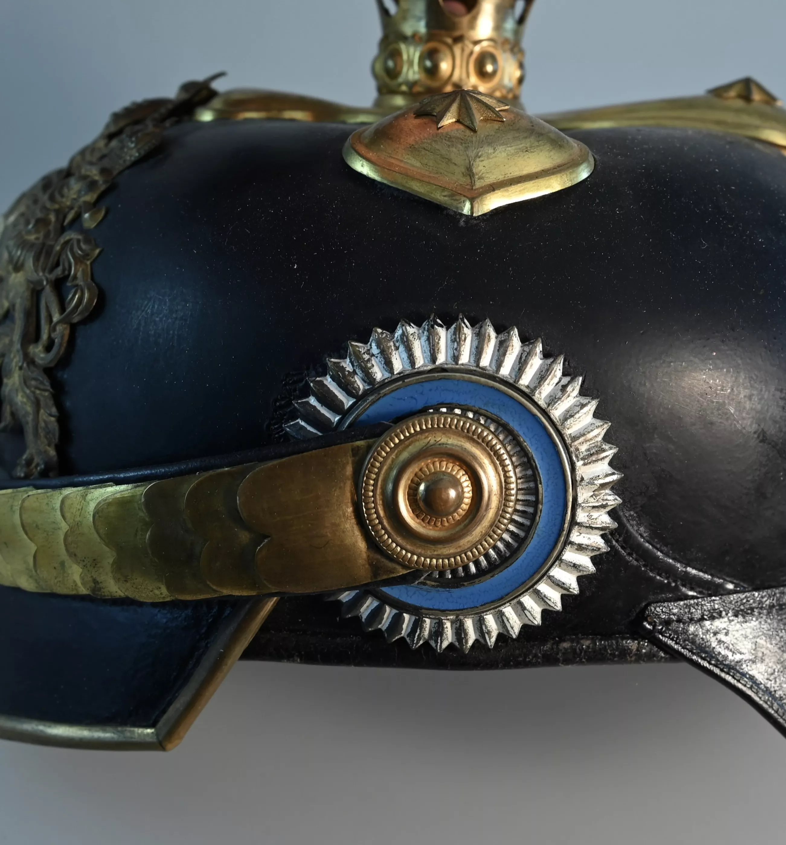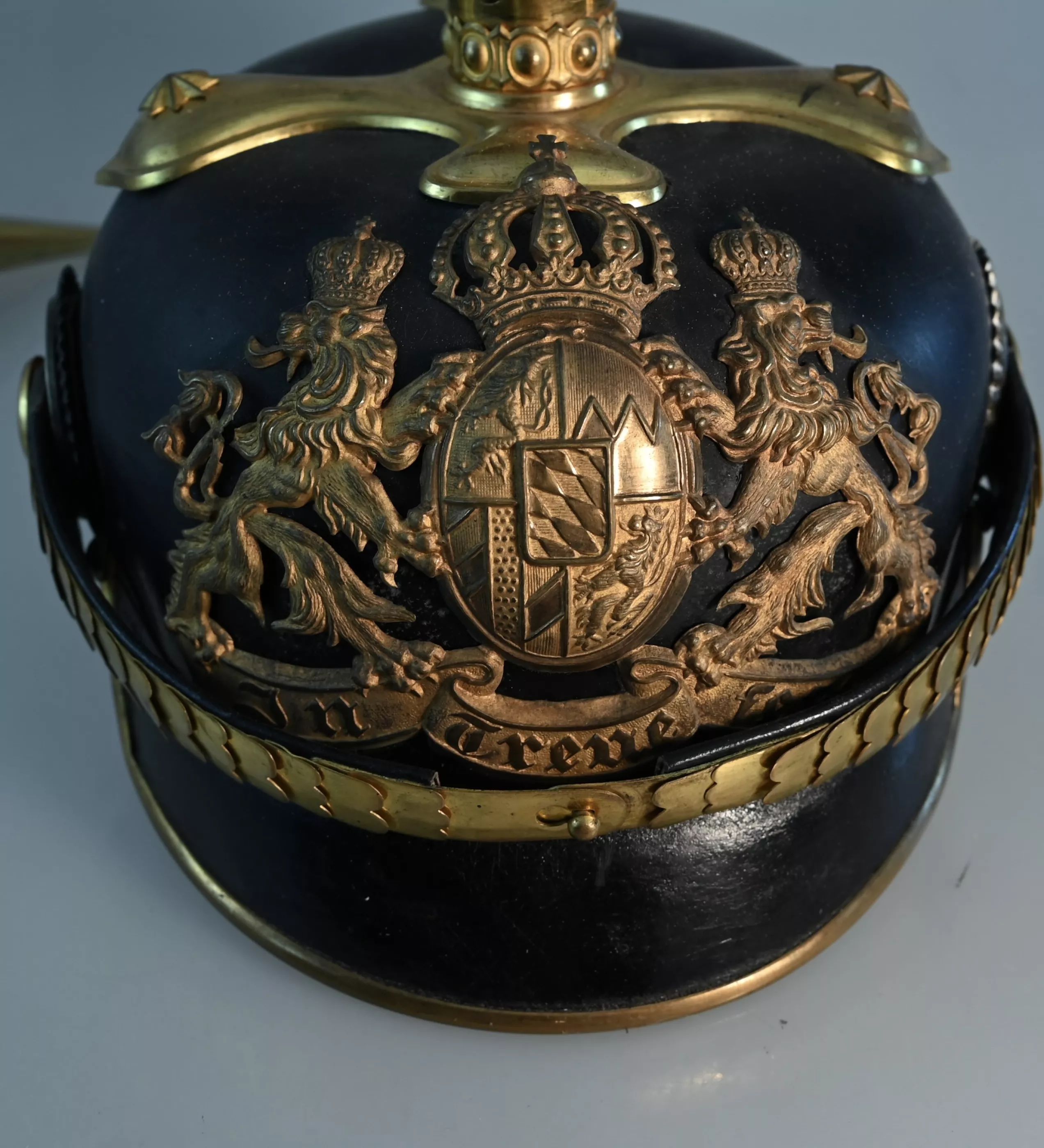 Officer style cross base with star retainers. Fluted spike is removable. The unique feature on this helmet is the base above the pearlring that has multipe aeration holes. Officer ribbed back spine. Flat gilt chinscales on rosettes. Officer Reichs and Bavarian officers cockades. Beautiful helmet in near mint condition.