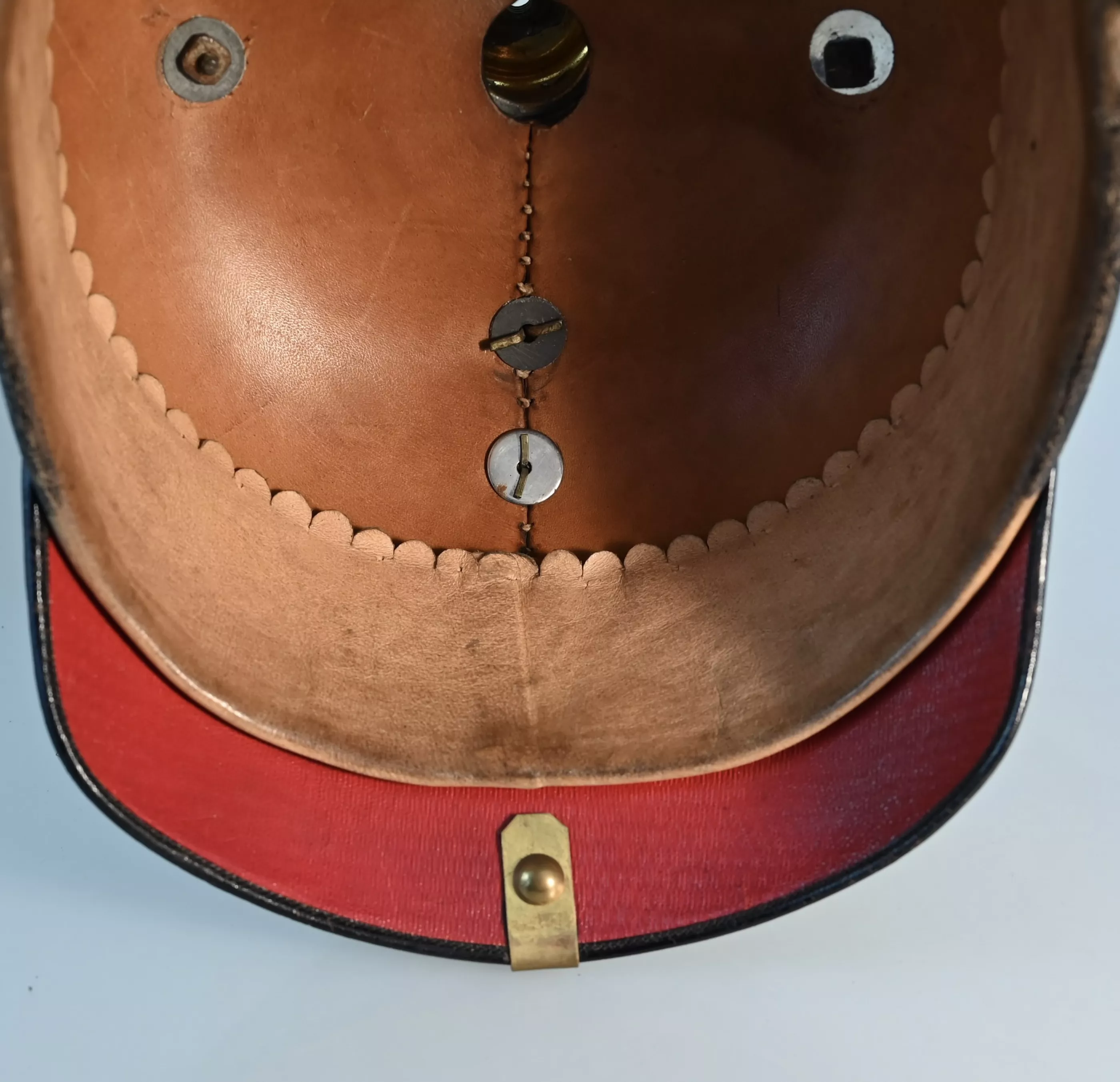 Interior has soft leather headliner and light colored and missing the silk headliner. Interior visors colored red and green as is proper for Officer helmets. The inside is in absolute mint condition with no wear.