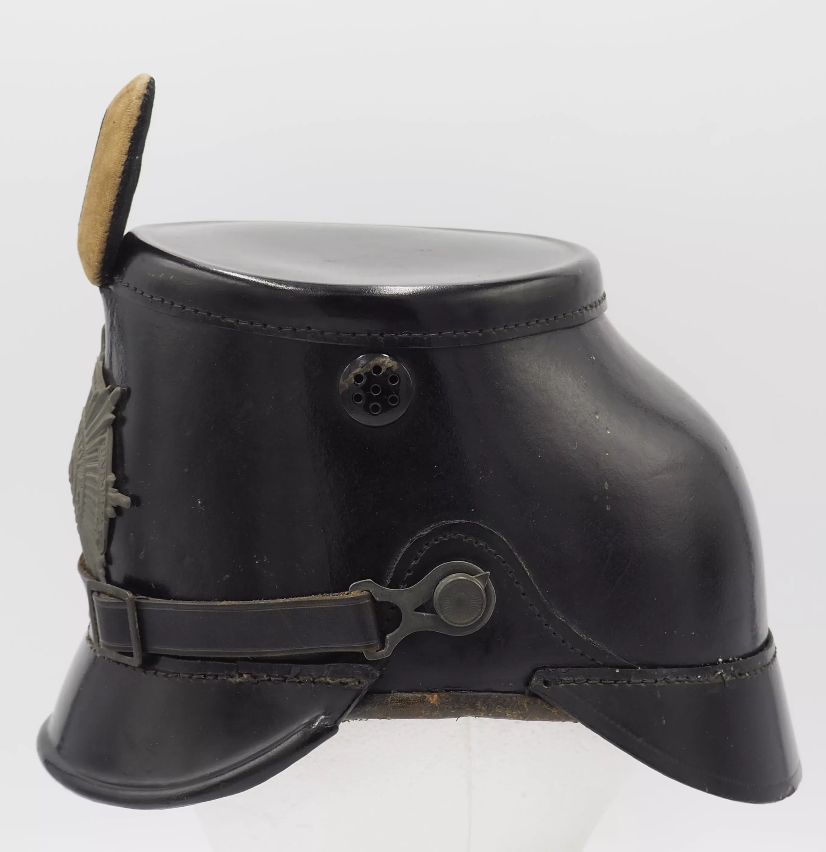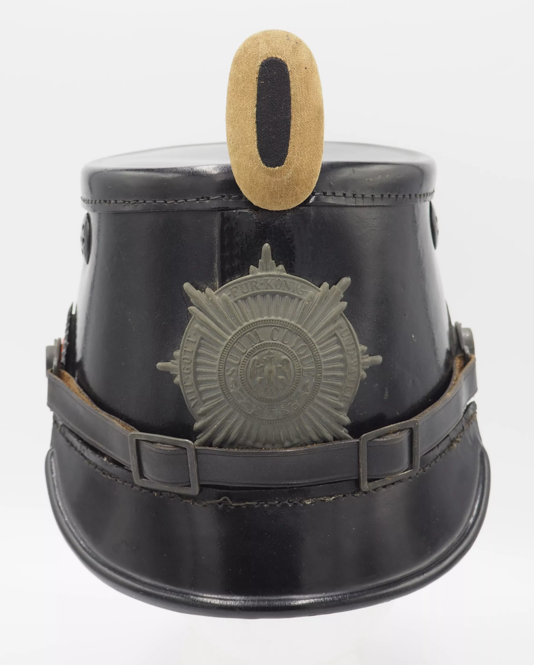 Prussian Guard Jaeger Enlisted man Model 1915. Black leather Shako body with field gray metal trim. The leather body has perfect form and firm stitching. Exterior finish is almost mirror finish. No extra holes. The Prussian Guard Star frontplate has the original leather wedges fixed to it. Leather EM style liner. There are numerous marks inside the helmet bell with a 1915 darwe. Original chinstrap & Reichs cockade. Original Prussian field badge. Beautiful wartime near MINT conditioned Jaeger shako.