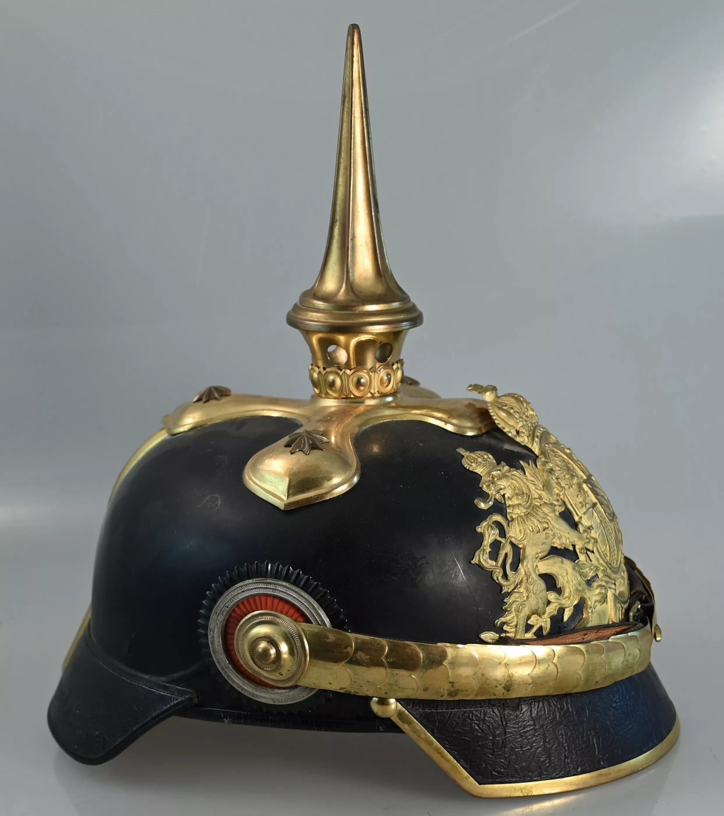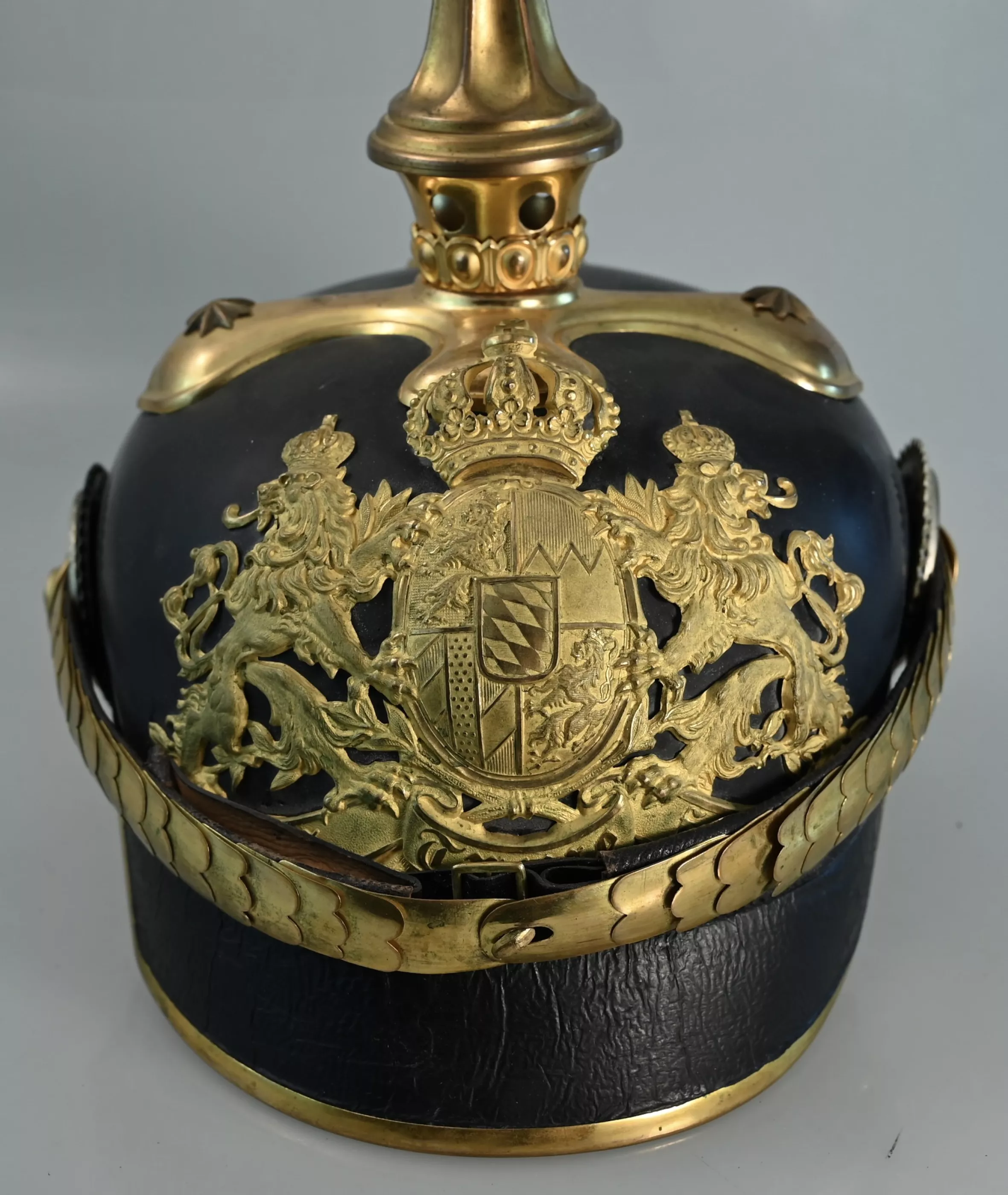 Gold frosted finish has definitely never been cleaned or polished. Fire gilt crossed spike base with officers pearlring and removable fluted spike. Frontplate is the Bavarian Gilt Frosted Wappen surrounded by two Lions with the "In treue fest" banner. Rounded gilt chinscales with rosettes. Officers Reichs and Bavarian cockades. Pristine Helmet, exceptional to find in today's market place. Absolutely 100% Original and Untouched helmet.