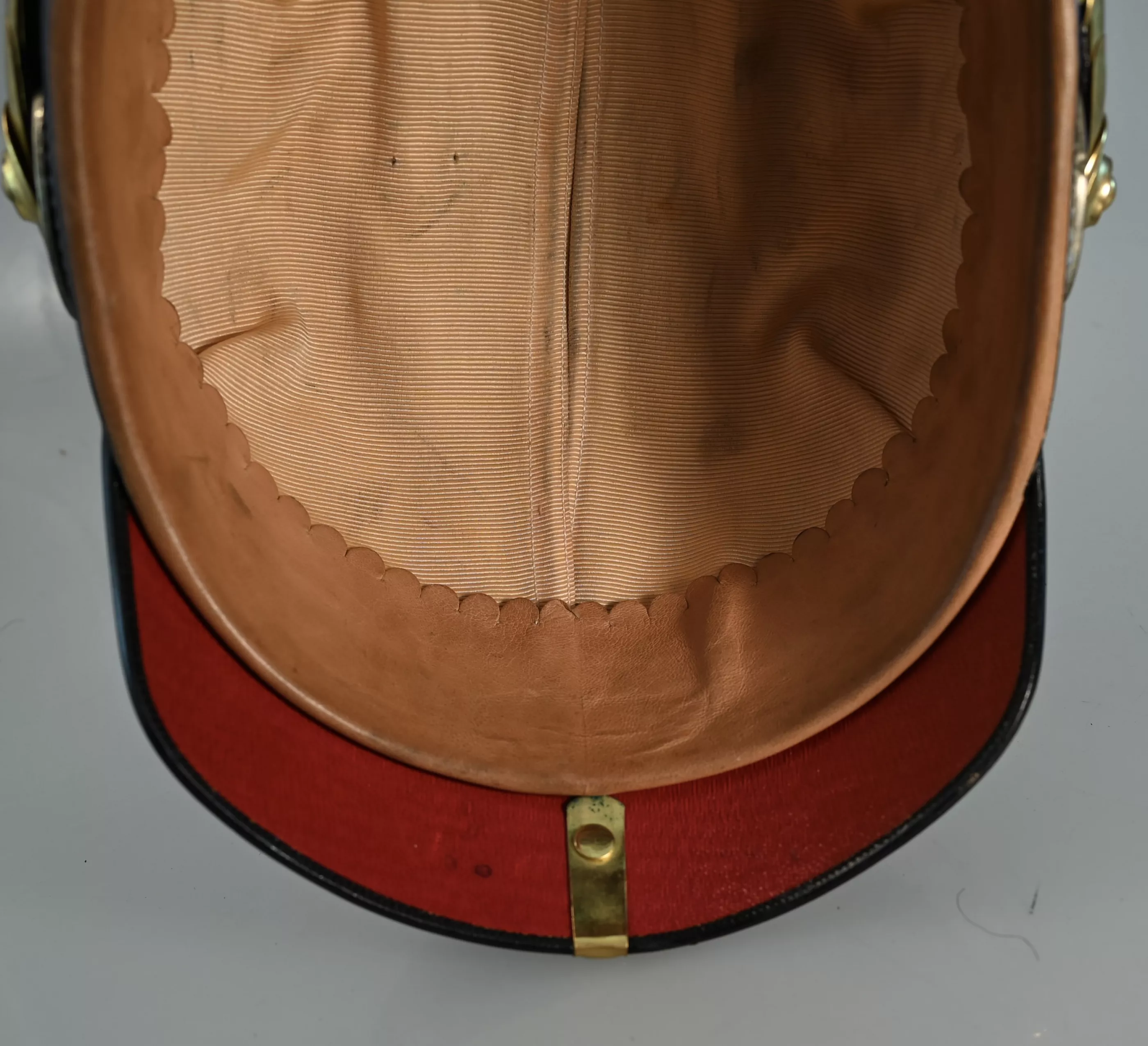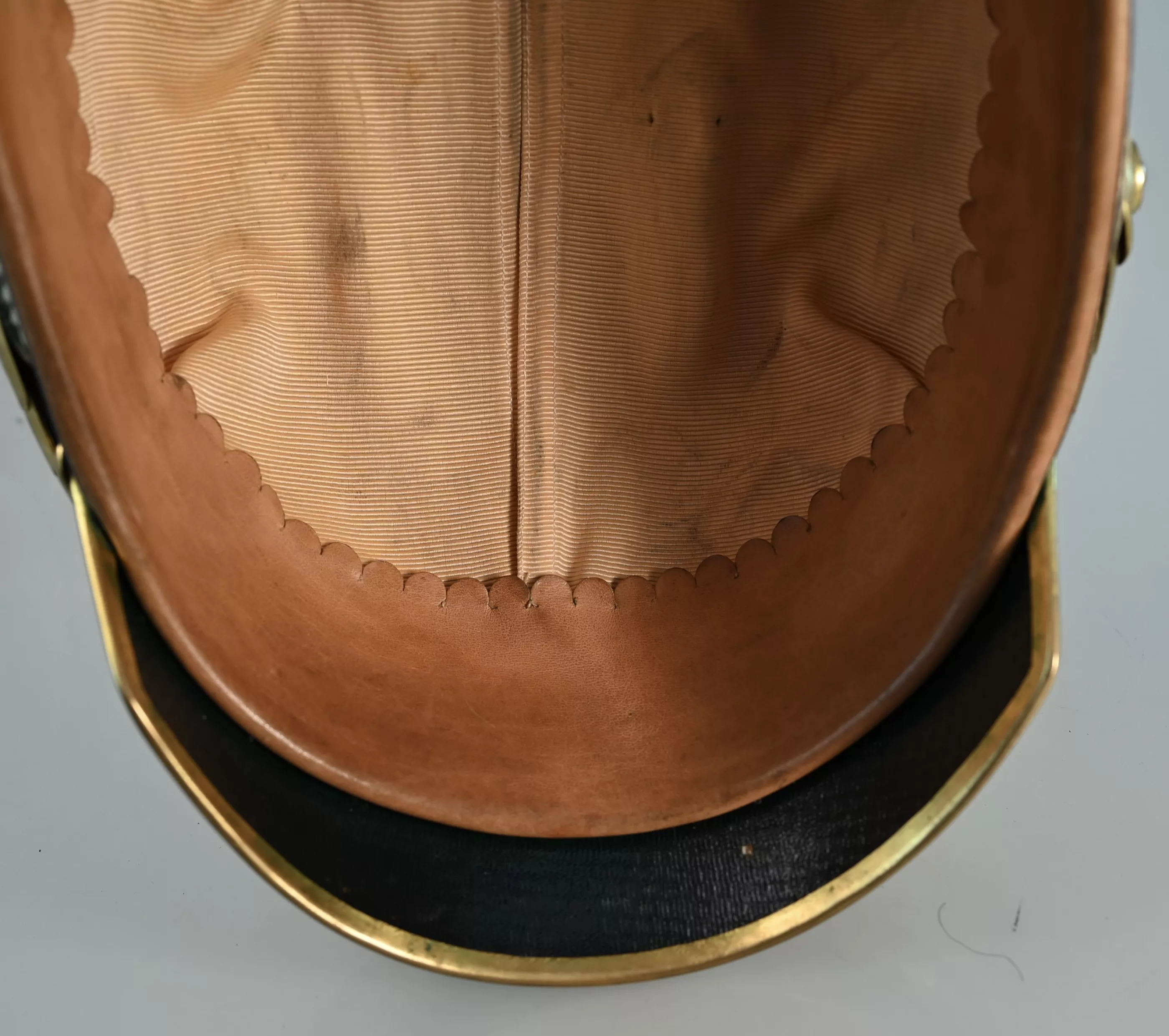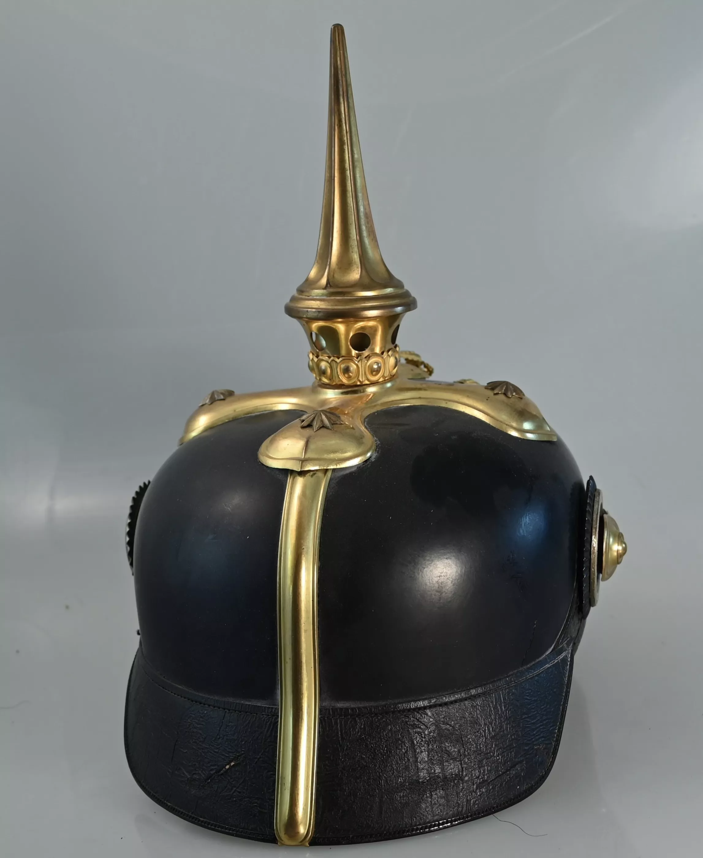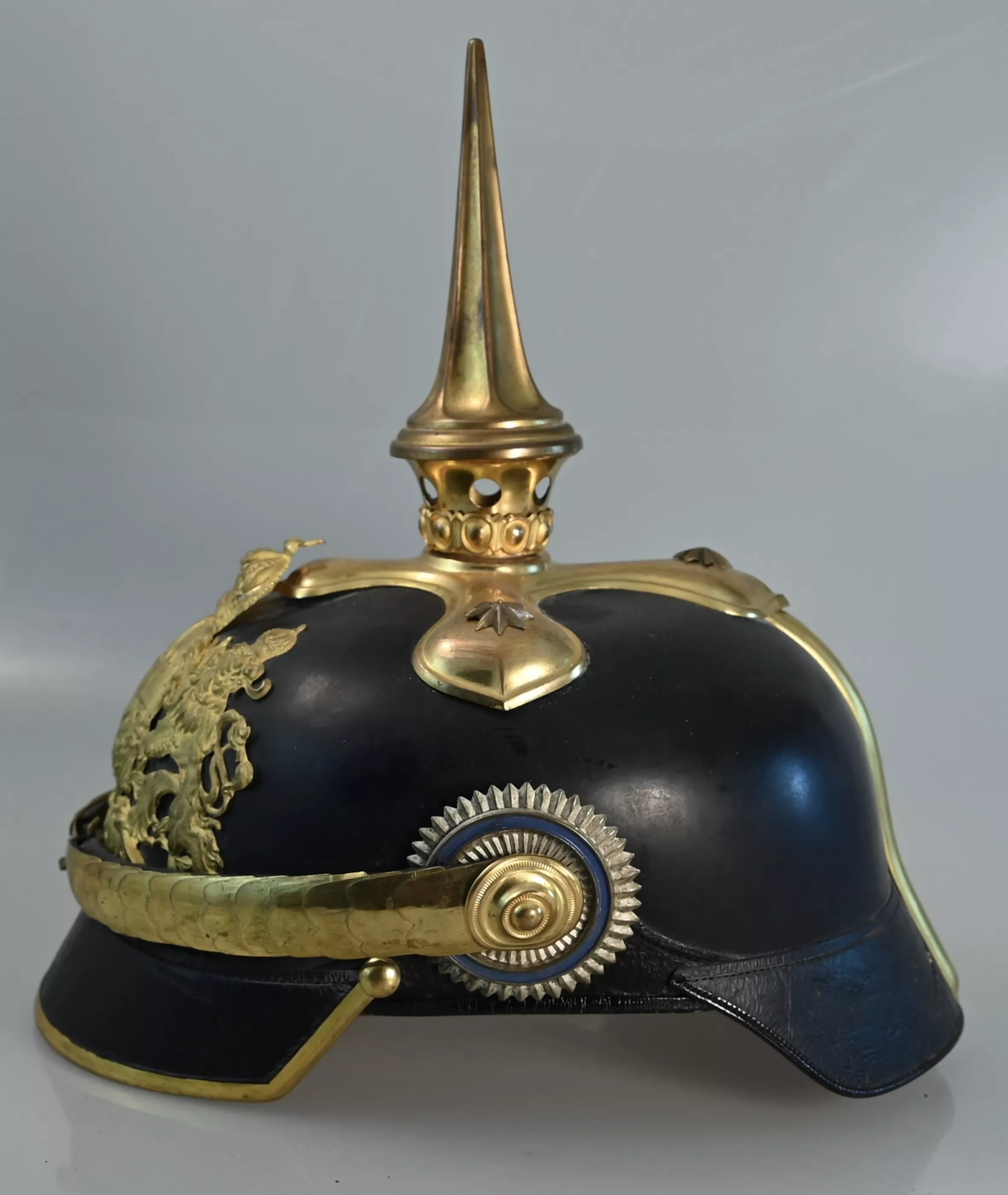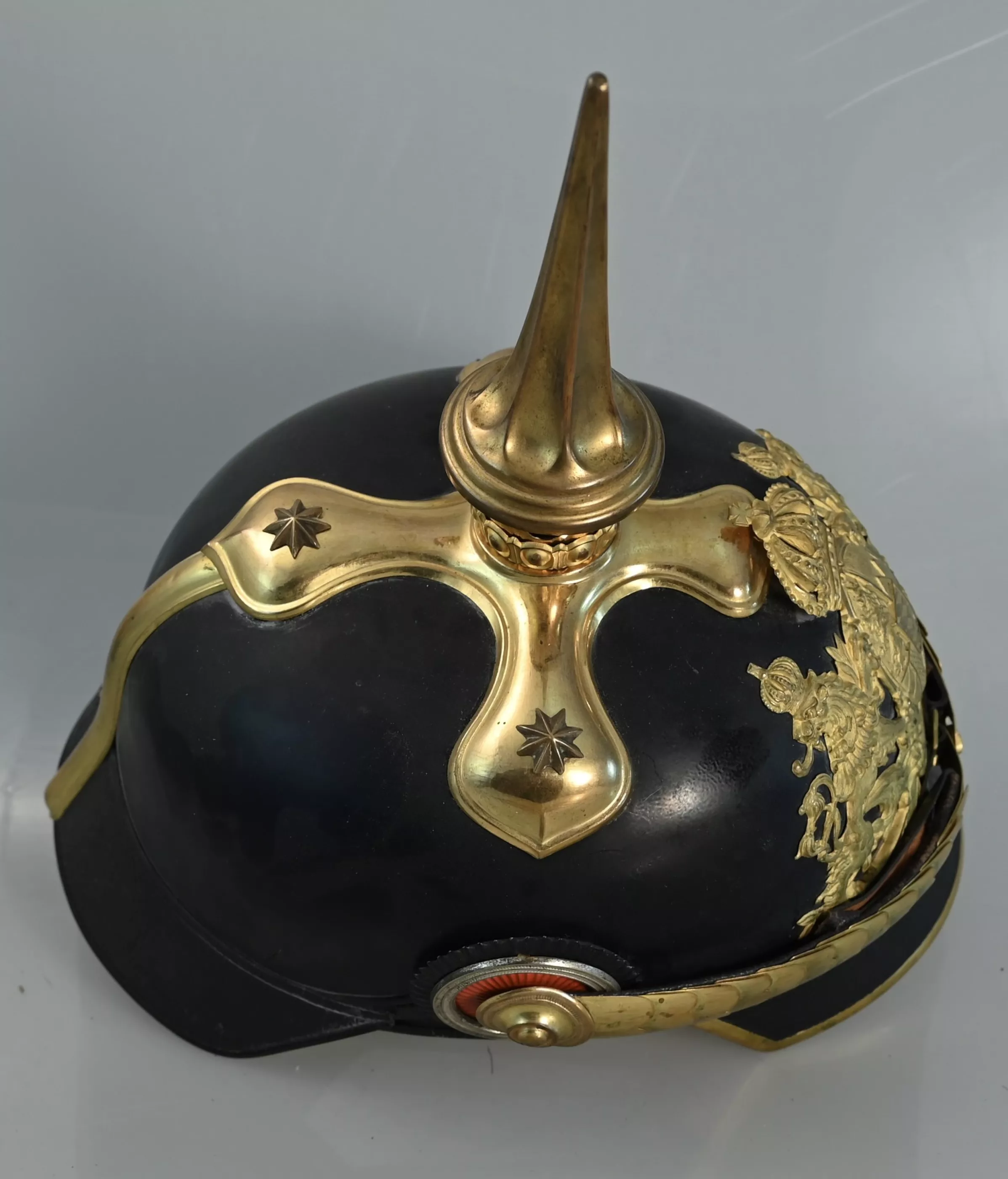 Bavarian Cavalry Officer Model 1897 Pickelhaube. Beautiful and absolutely virgin and untouched. Black lacquered leather helmet body with fire gilt trim. Helmet body has excellent form and firm stitching. Exterior lacquer still has its polished sheen in MINT condition. Interior has the officer sweat leather and beige colored silk headliner in absolute MINT condition. Square front visor lined in green, back visor lined red. No extra holes in helmet body.