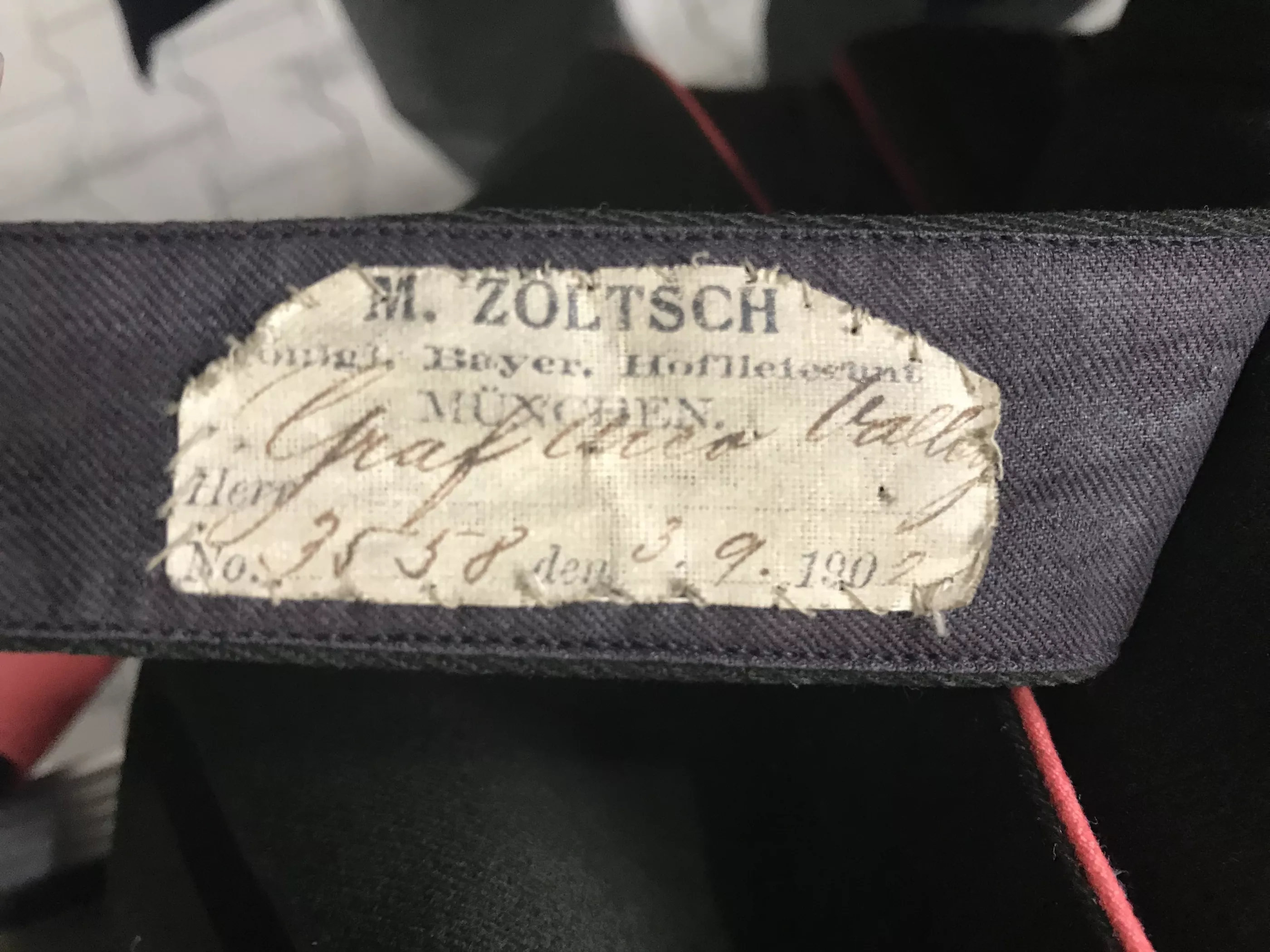 This helmet was purchased from a private collector that sold it along the Chevau-Leger Uniform from Graph von Arco auf Valley - the name tag from the unifom we could take a picture, unfortunately the uniform and pants were already commited to another buyer! Wikipedia states he was in the Bavarian Leib Regiment...well we took this picture from a Chevau-Leger Uniform. Note that the name tag is pictured only for info. Not part of this auction.