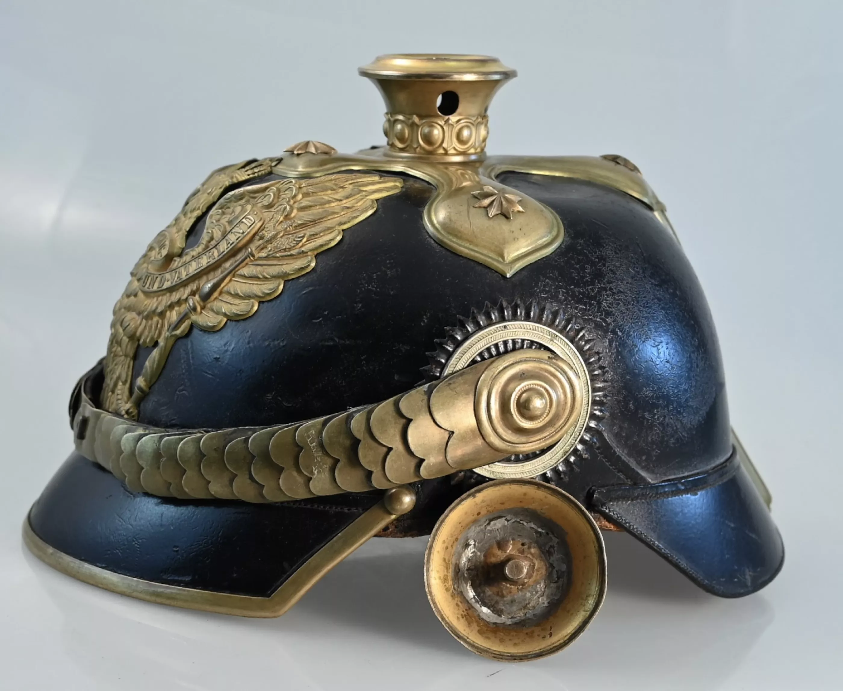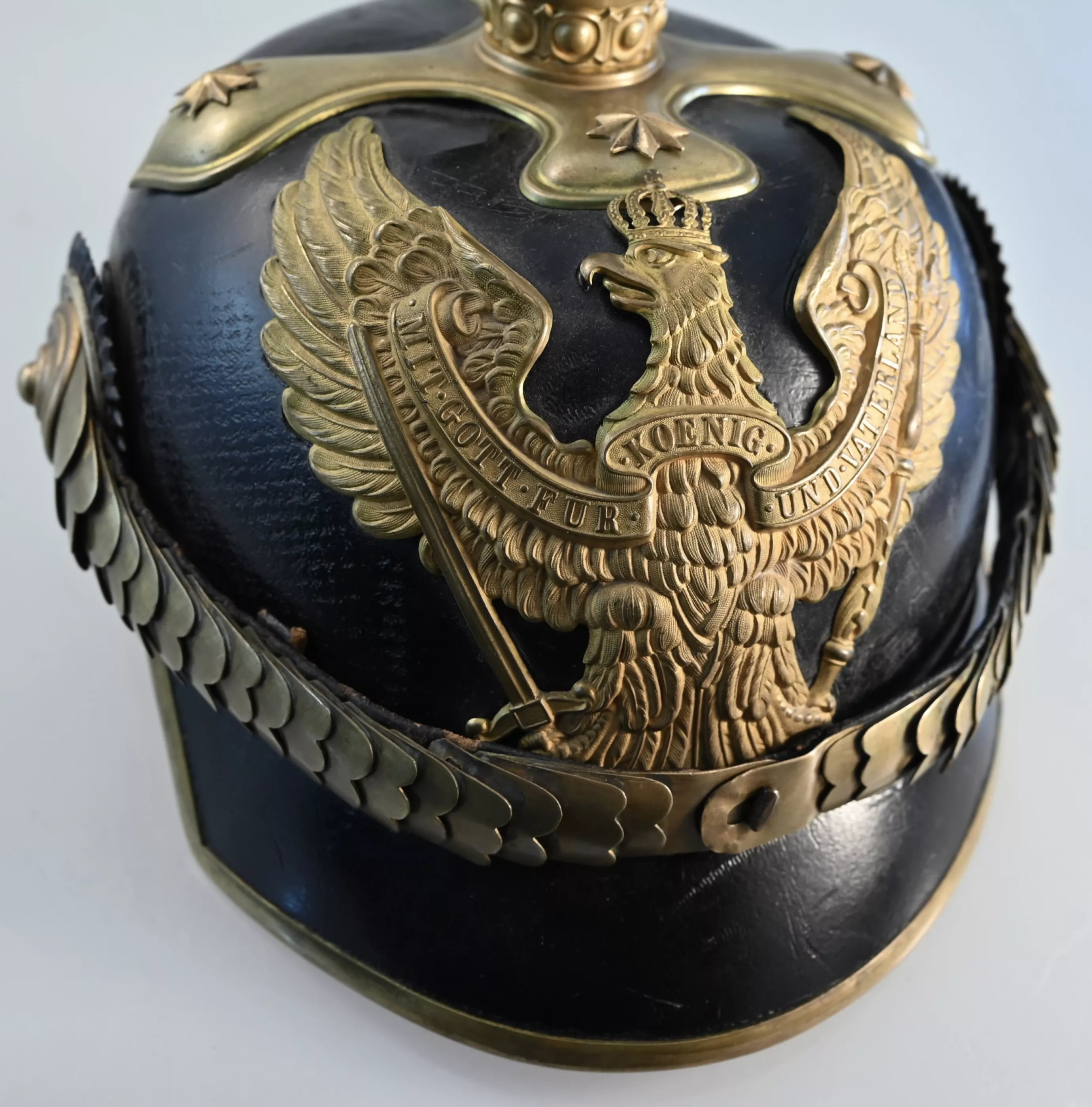 No extra holes in helmet body. The frontplate is the standard gilded Prussian Dragoon style Eagle with its original fire gilt frosting. The front plate fits the helmet to a perfect fit and left deep marks in lacquered leather. Fine brass crossed spike base fiited with a smooth spike that unscrews for parade. Heavy rounded chinscales on rosettes. Both Prussian and Reichs Officer cockade. Beautiful fine quality Dragoon Officer Pickelhaube.