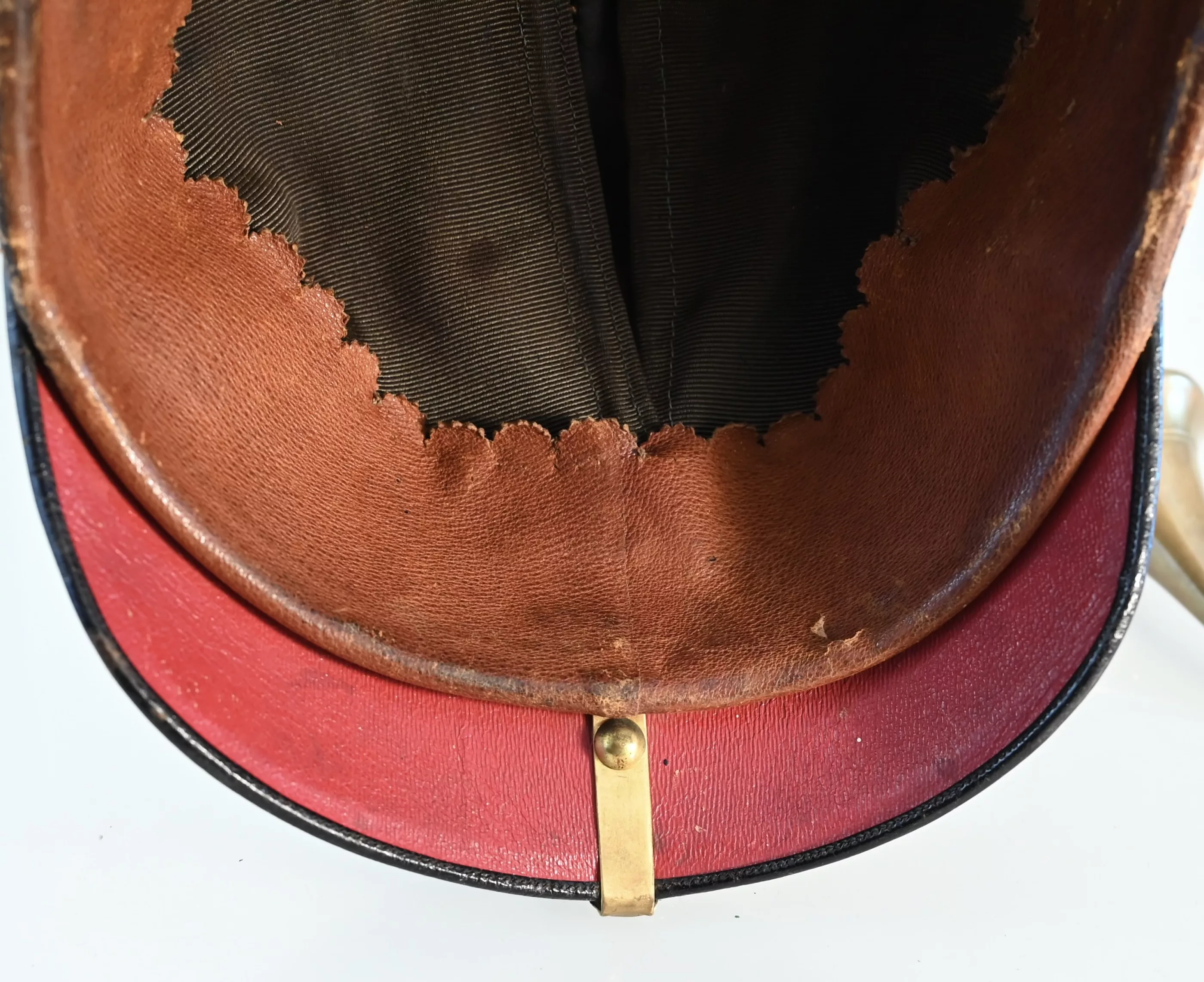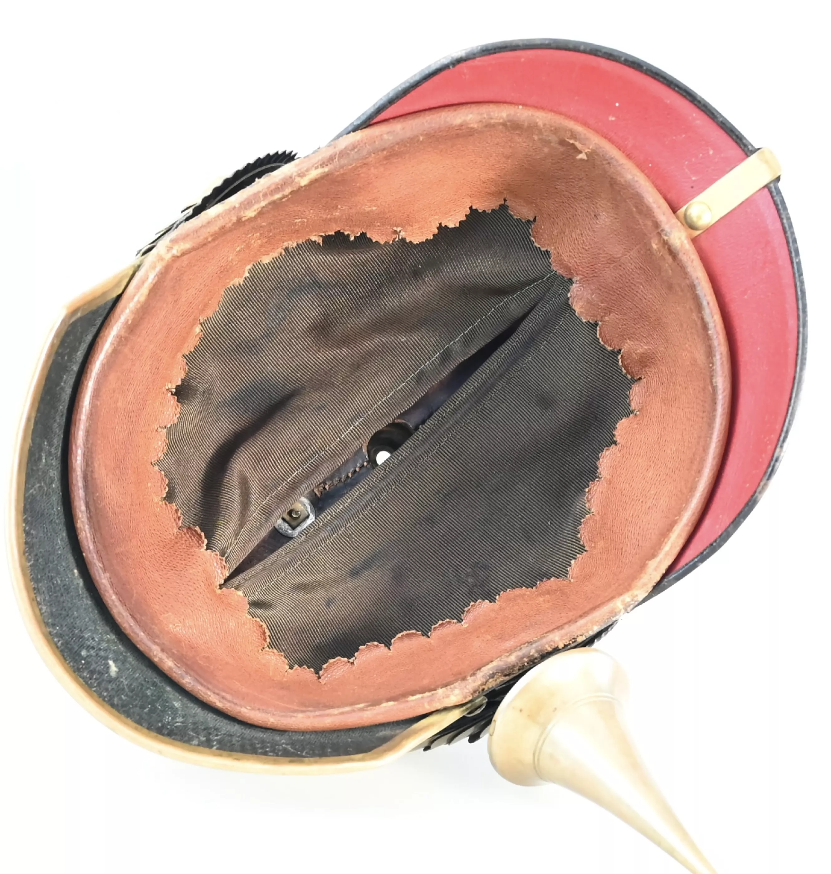 Prussian Dragoon Officer model 1871/97 for Line Dragoon Regiments. Fine heavy leather construction with gild frosted brass trim. Leather helmet body in excellent condition with perfect lacquer finish and firm stitching. Interior has the sweat leather band and silk lining. Interior visors are colored red and green as is proper for Officers model helmet.