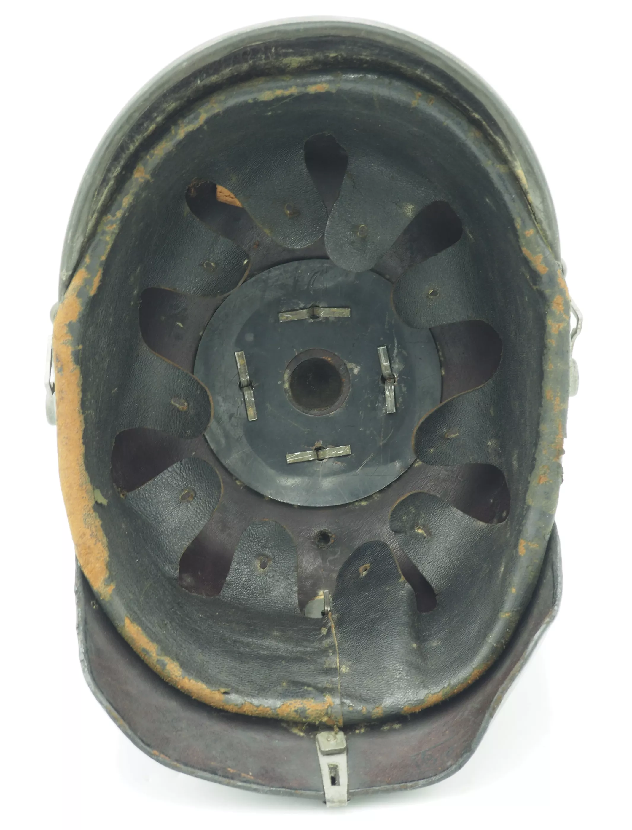Saxon Infantry Enlisted Mans Helmet Model 1915. From the New England Collection. Black lacquered leather helmet body with field gray trim. Helmet body has perfect form and fine stitching. Exterior lacquer has soft age-related sheen but no cracks or damage. Interior of helmet has pre-war quality black dyed EM style leather liner that is still soft. Liner. The liner has scuffing around the ear area but no other damage. Inner visors are natural colored. There are marks or issue stamps on the inside of the back visor, but they are not legible.