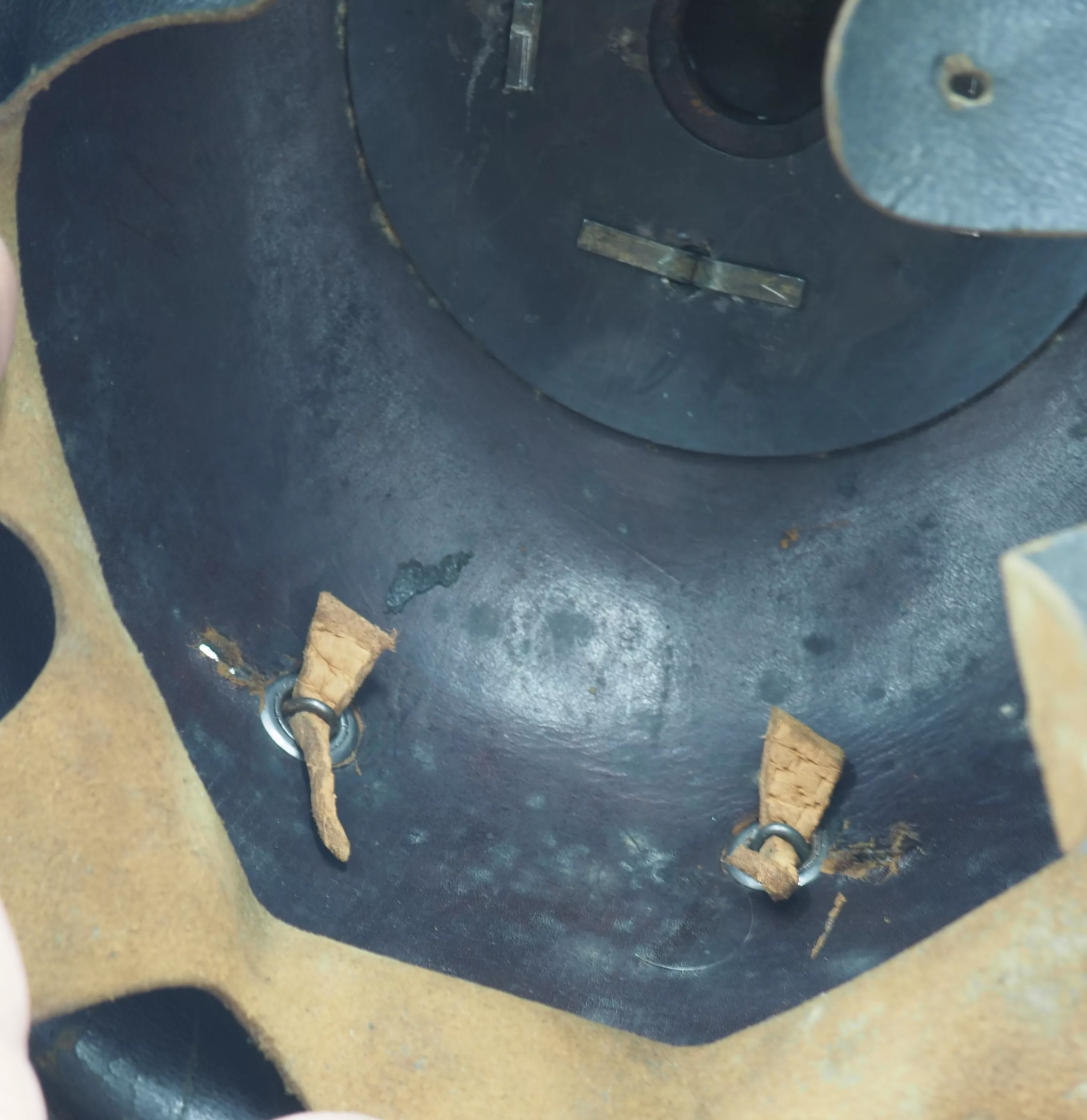 Frontplate is the Saxon star and center device that are one piece and in field gray metal. The frontplate is held to helmet with original leather wedges through grommeted holes. There are small puncture holes outside of the grommets, but they have not been used. All metal trim including base/spike, back spine, side lugs and front visor trim are matching field gray in color. Original leather chinstrap holders over the M91 side lug but the leather strap is missing. Original Non-Serrated Reich and Saxon cockades. This helmet is 100% original and untouched. Great WWI era Saxon helmet. Bargain for the collector to complete with a chinstrap.