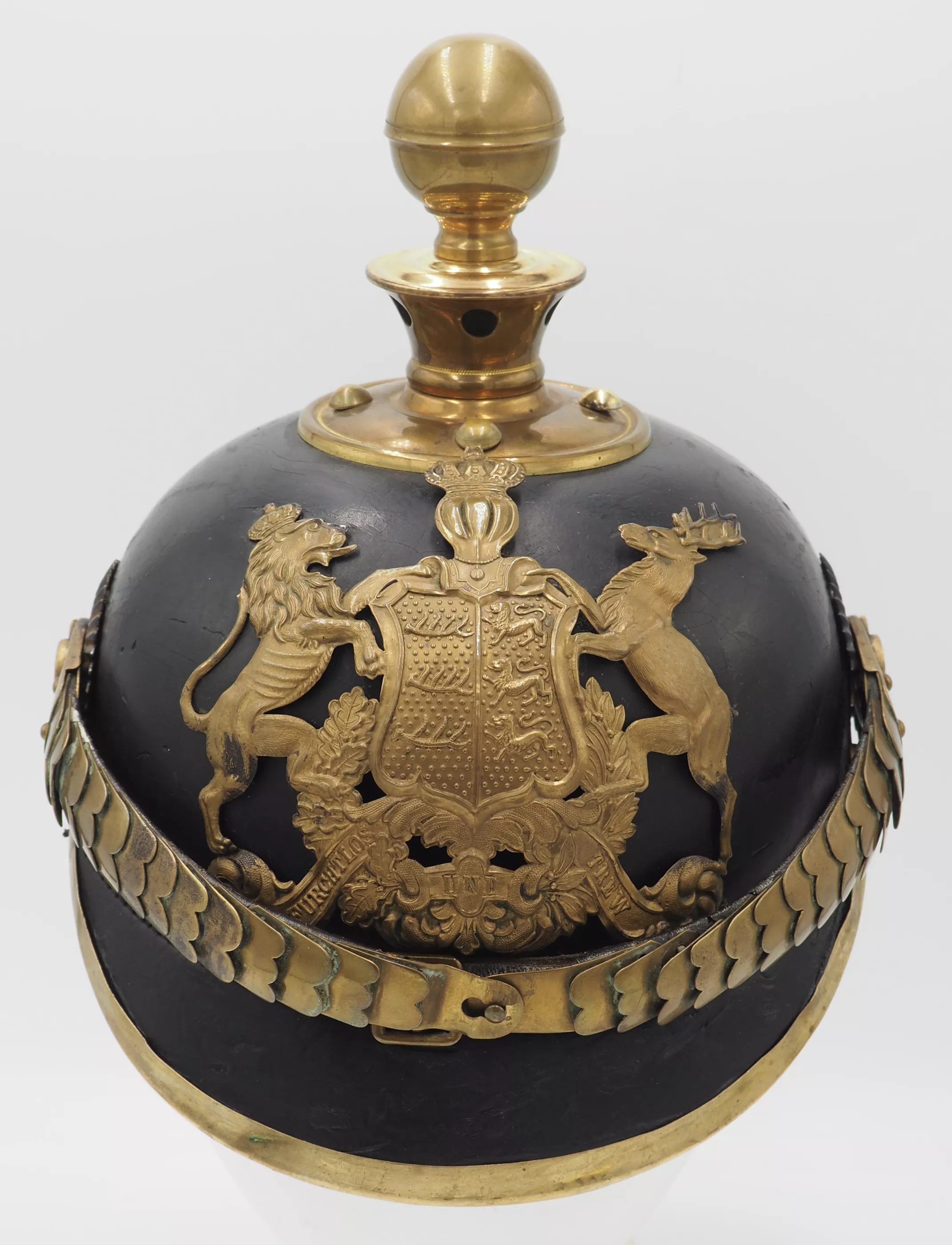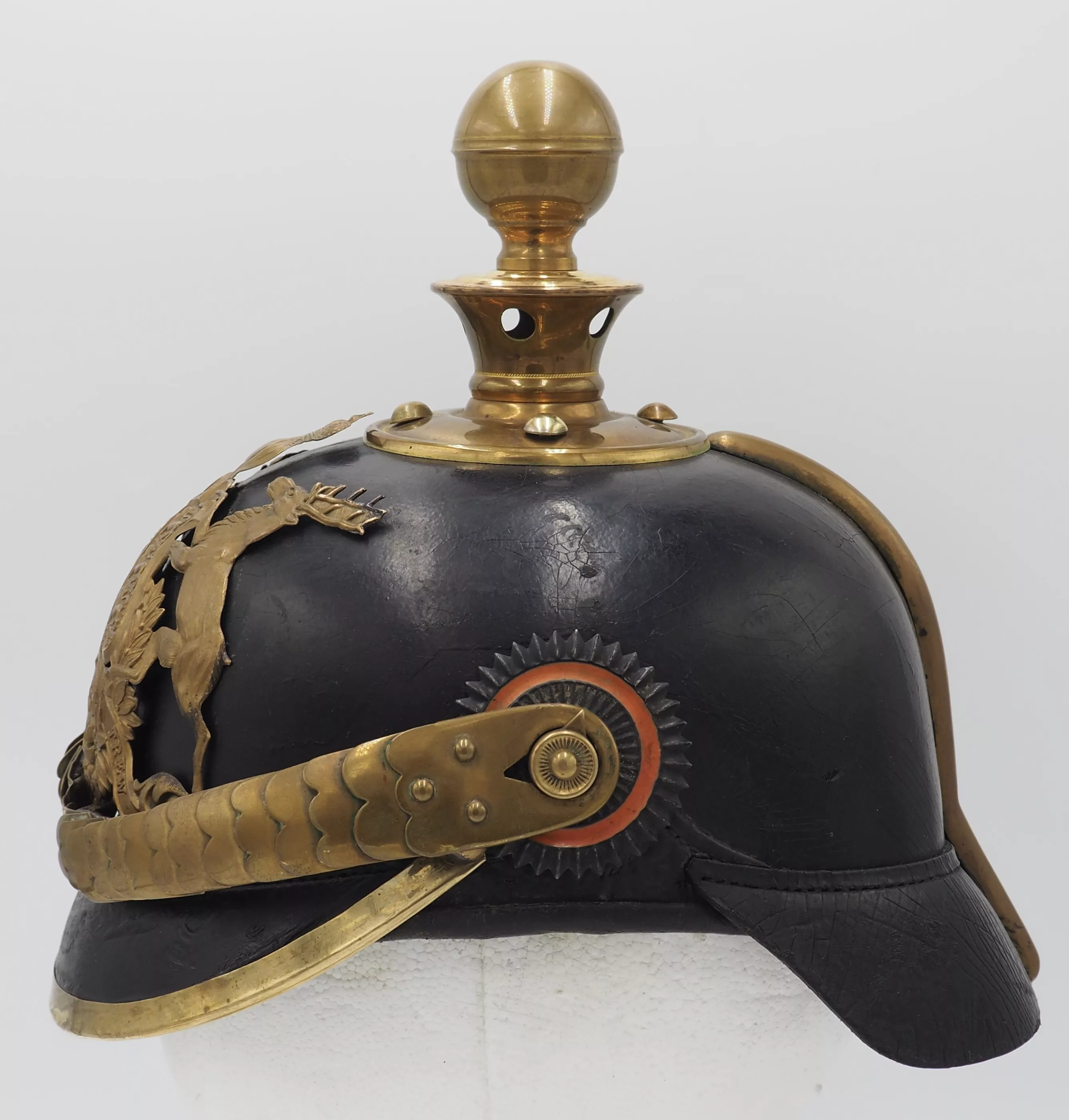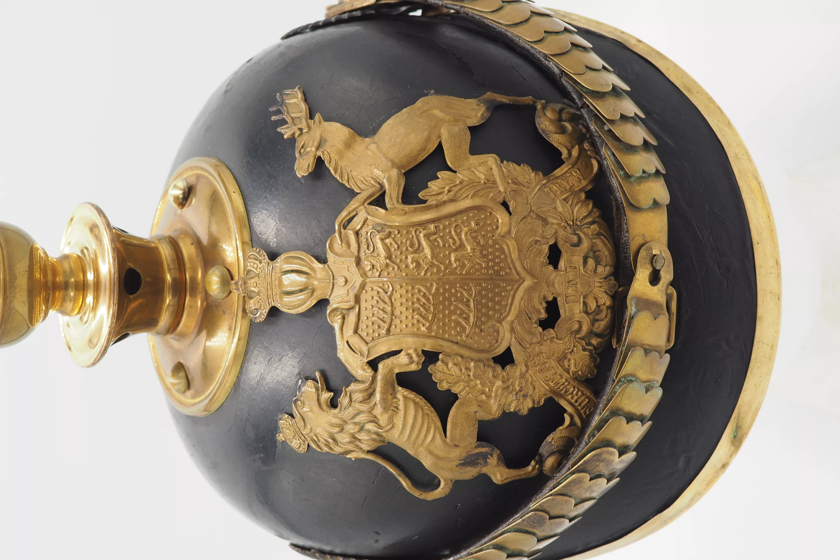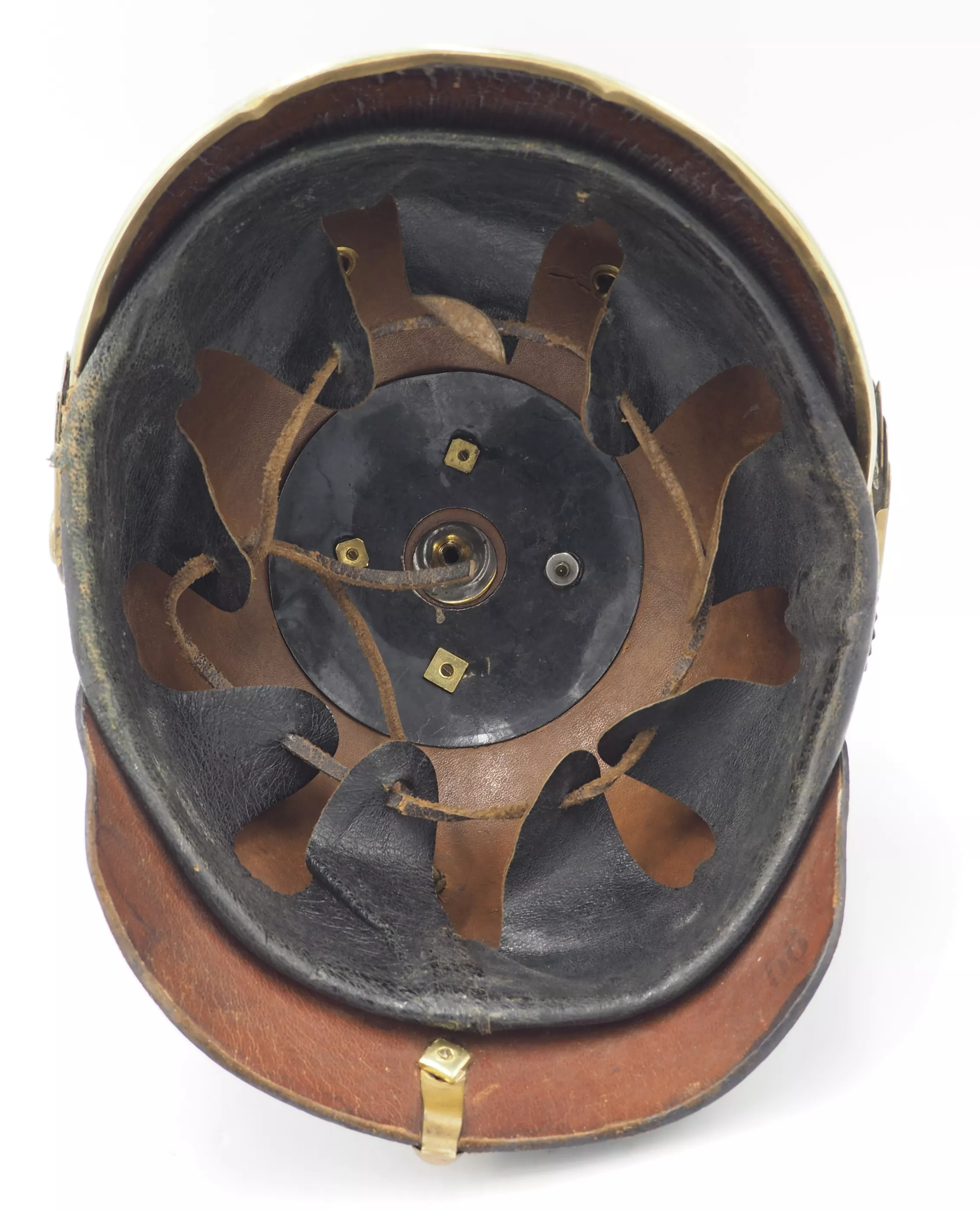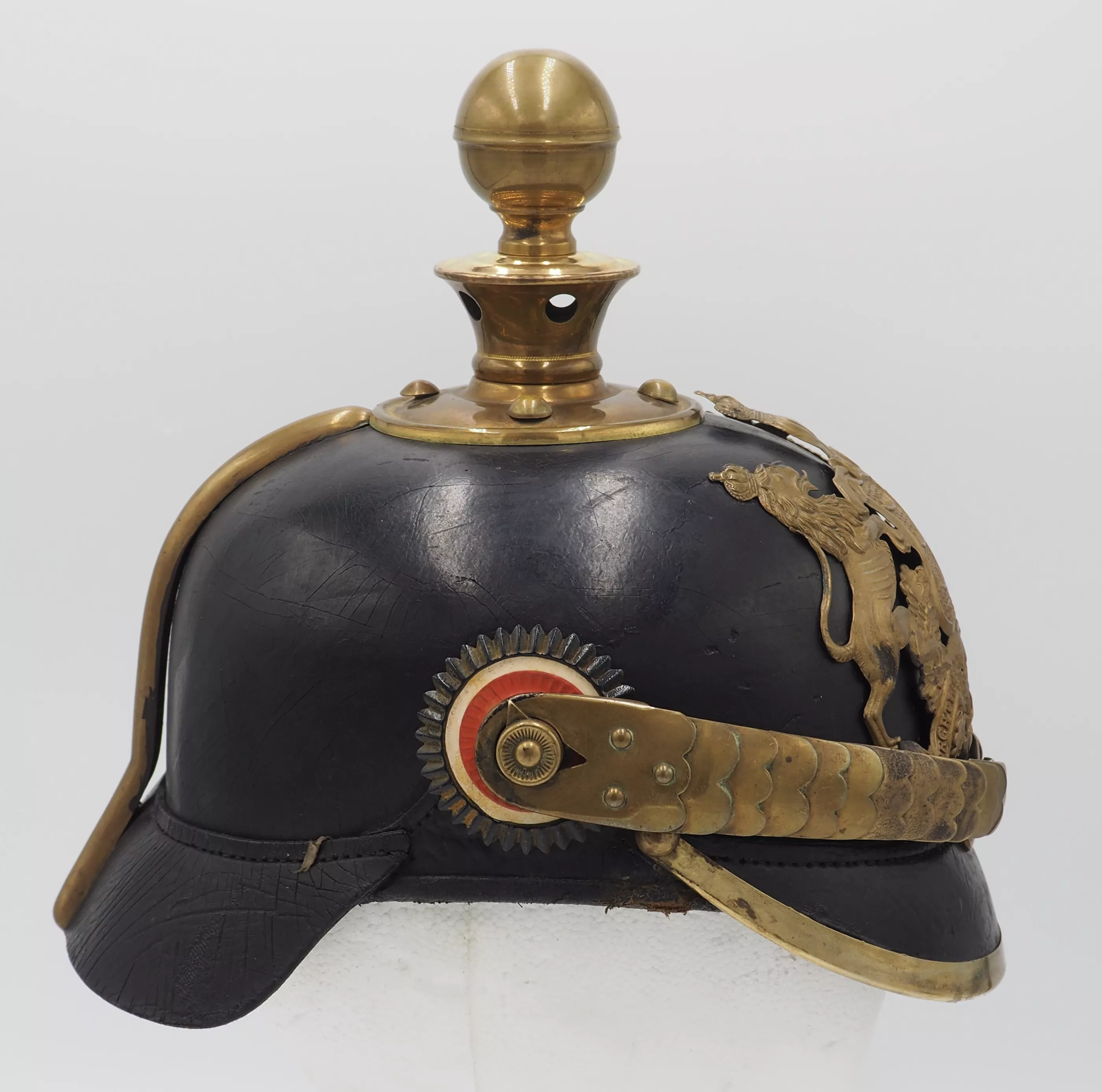 Wuerttemberg Field Artillery EM (Private Purchase) Model 1895. Black lacquered leather helmet body with fine quality brass trim. Helmet has perfect form and firm stitching. Leather helmet body has fine exterior lacquer. Interior liner is the classic EM black tongue liner that is still supple with age. Interior visors are plain leather with no markings. No extra holes in the helmet body.