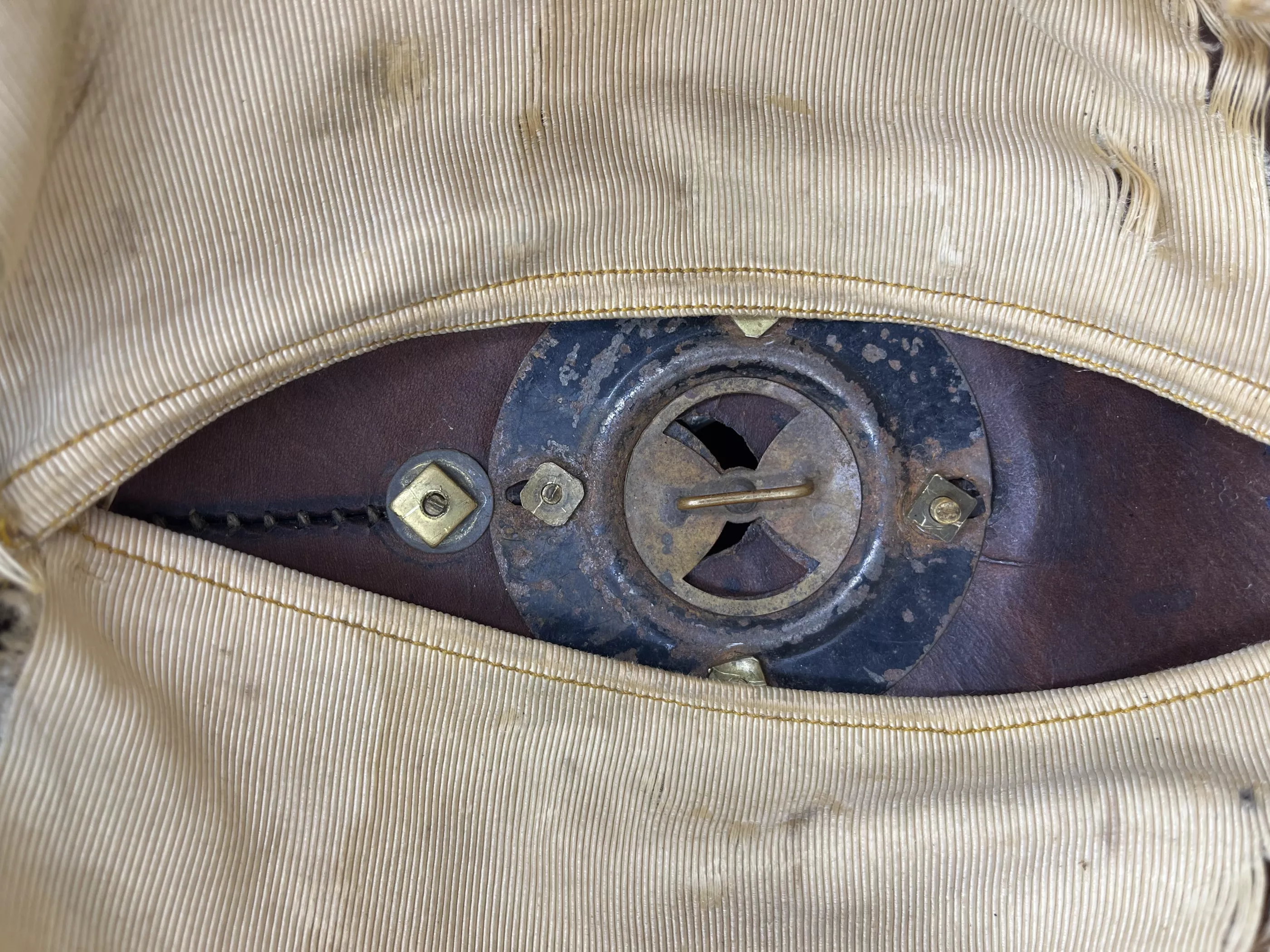 The helmet metal trim is generally discolored with all the metal being “oxidized brown” in color. This is especially noted in the color of the frontplate (see photos). This may have been a helmet used during wartime that was exposed to chlorine gas. We have seen other brass helmet that become brown after exposure to gas. Otherwise, this is an original and very attractive rare regimental helmet.