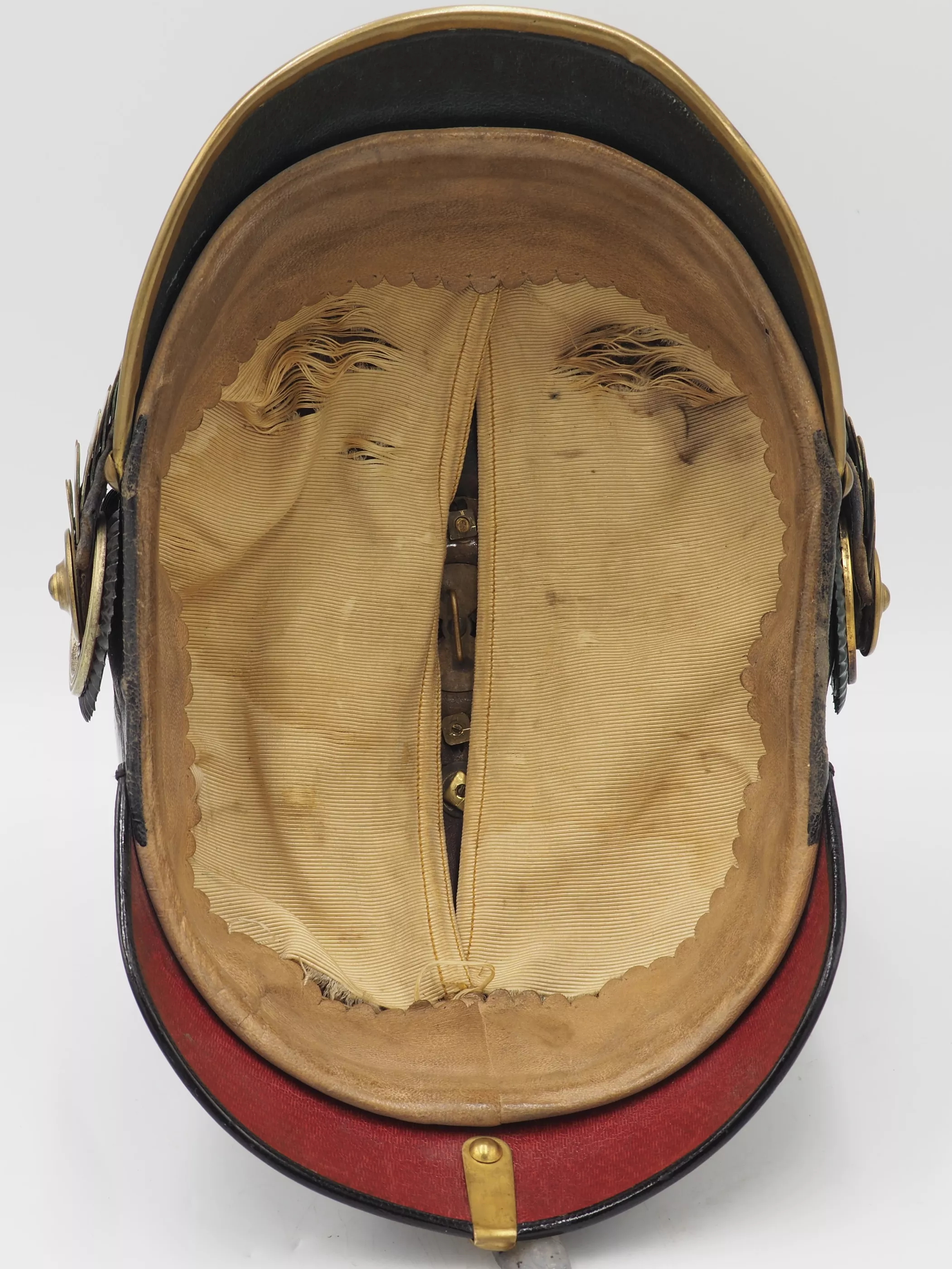Saxe-Weimar 94th Infantry Regiment Officer Model 1897 that was probably used during WWI. Black lacquered leather helmet body with gilded brass trim. Helmet body has excellent form and firm stitching. No extra holes in helmet body. Exterior lacquer excellent. Interior has sweat leather and officers silk headliner that has some tears but is overall in very good condition. Green and Red lined front and back visors respectively. Both visors with firm stitching.