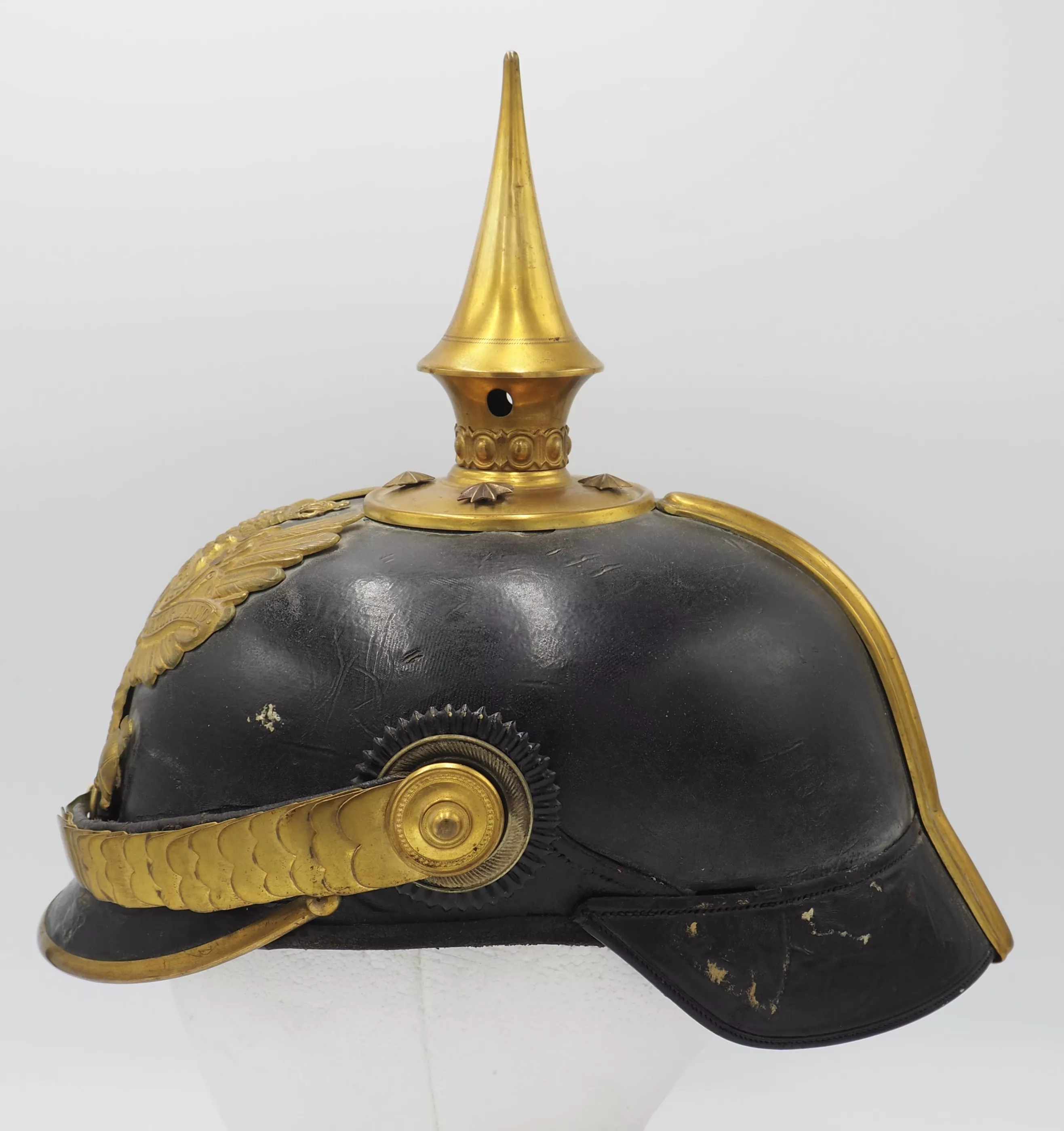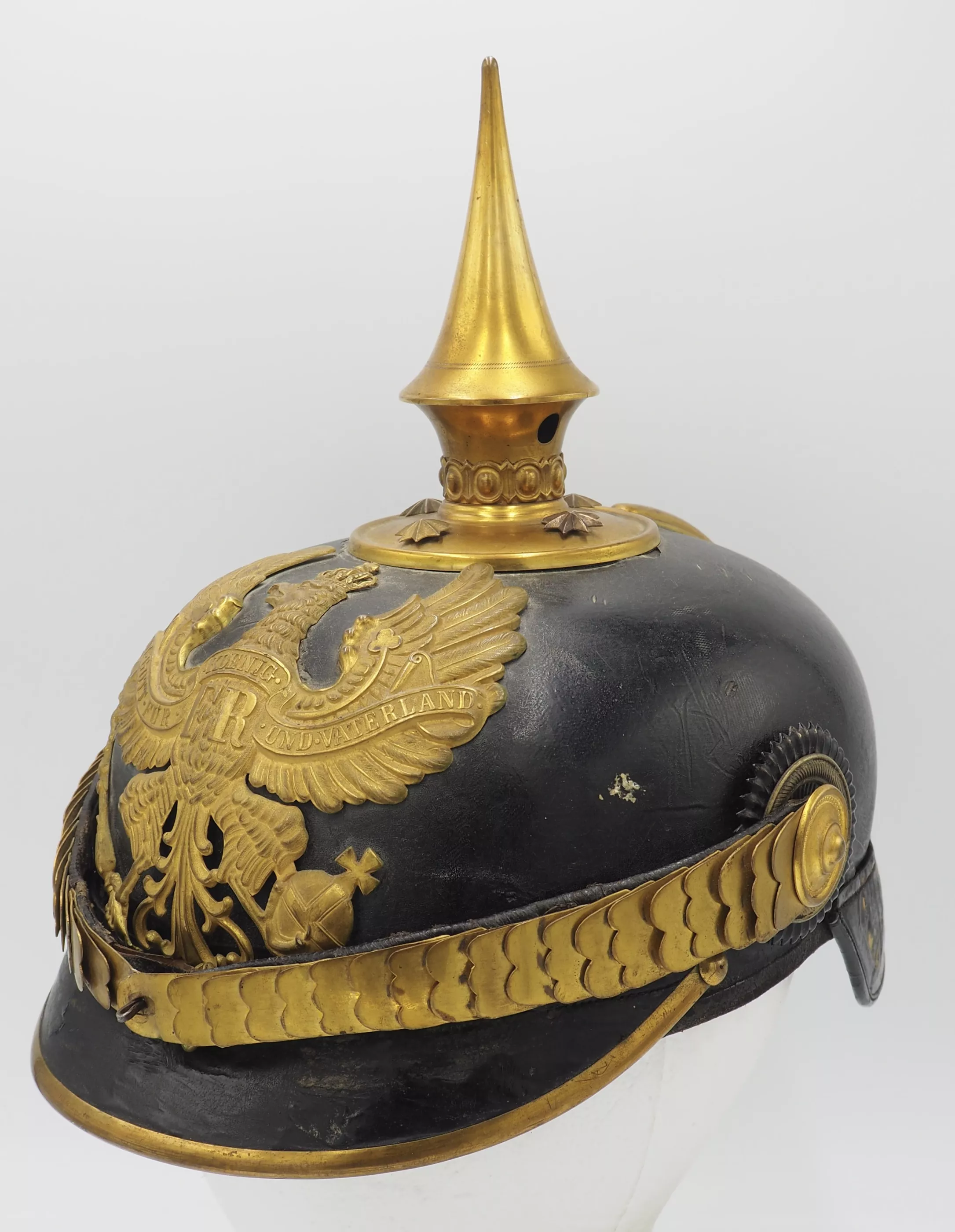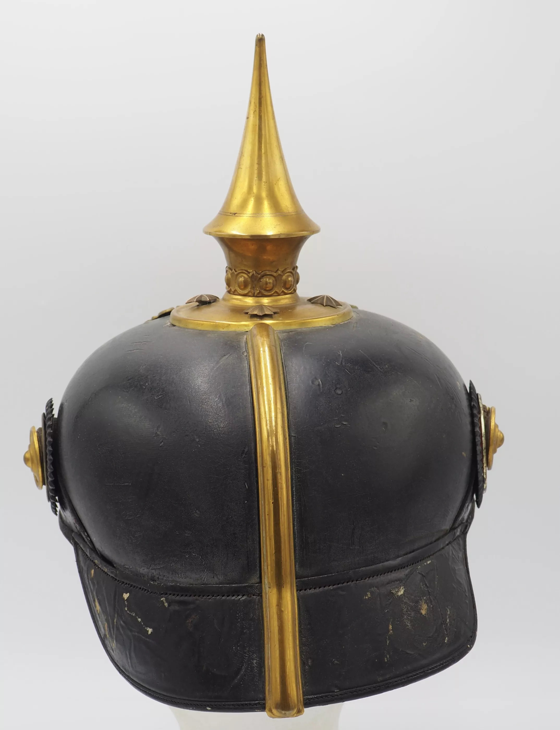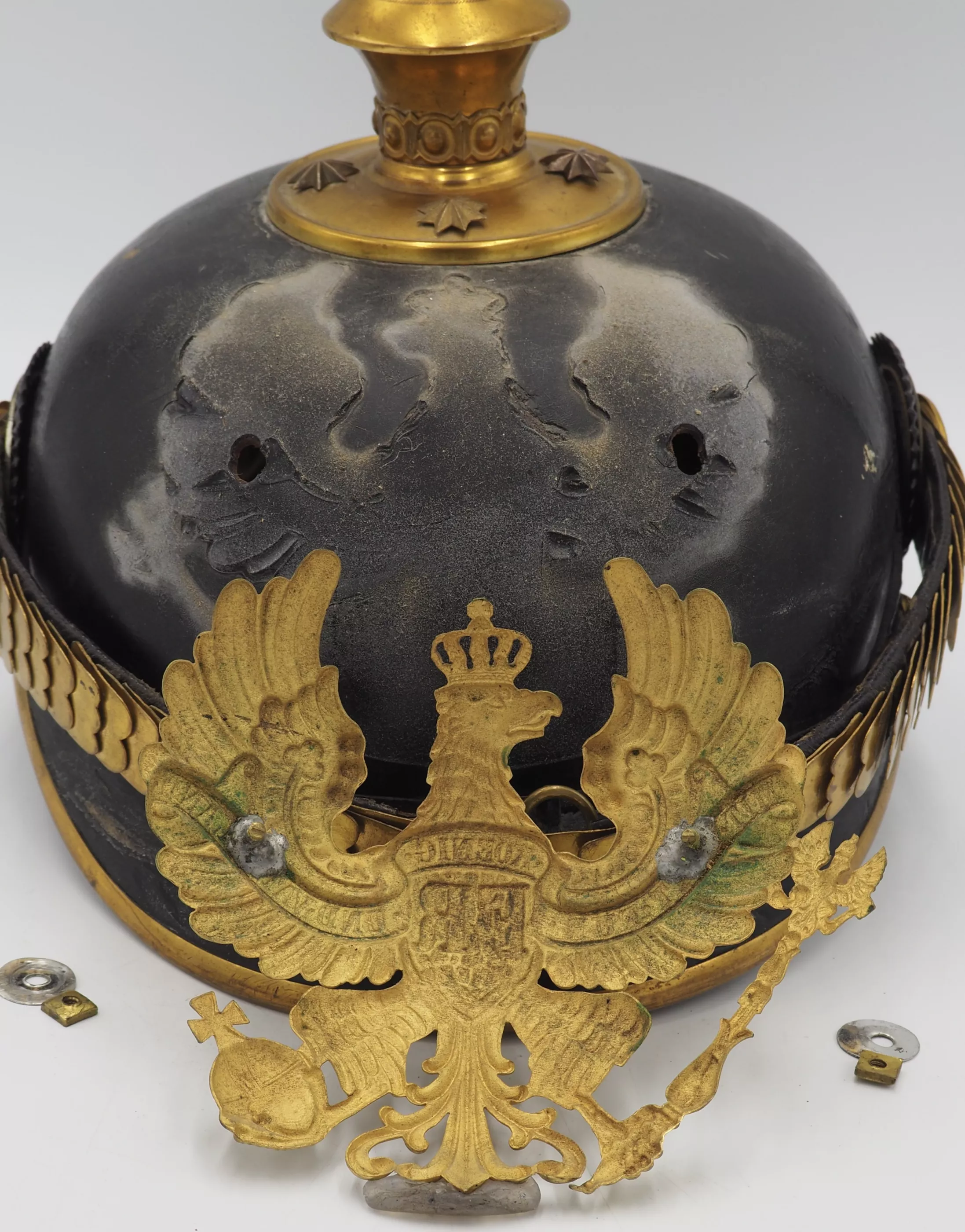 Prussian Line Infantry Officer model 1897. This helmet was recently found at a militaria show in the US. Black lacquered leather helmet body with gilded trim. Trim is an absolut perfect match of a high redish gold colour. The helmet body has excellent form and firm stitching. No extra holes in the helmet body. The interior has sweat leather and silk headliner. Interior visors colored read and green.