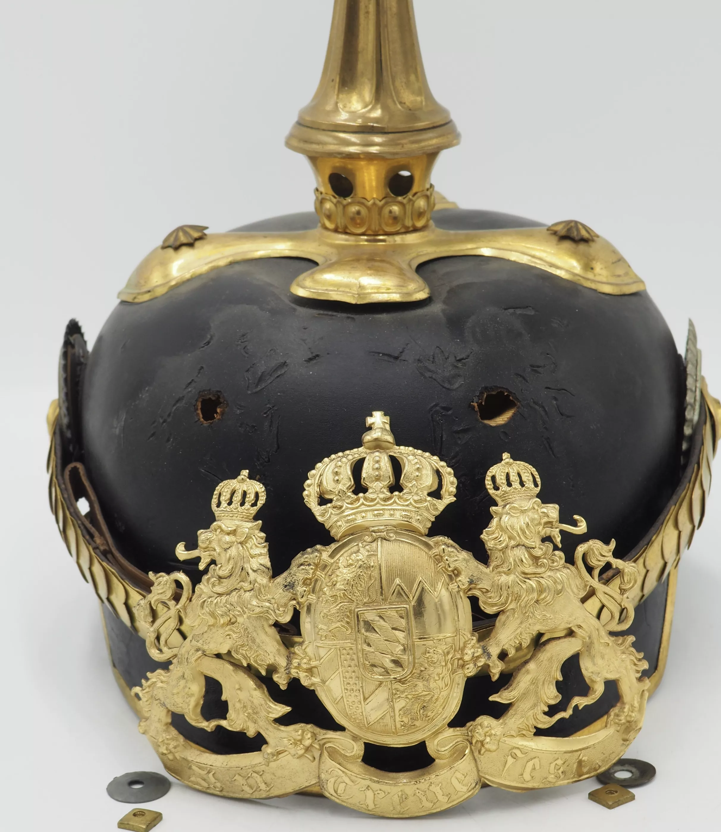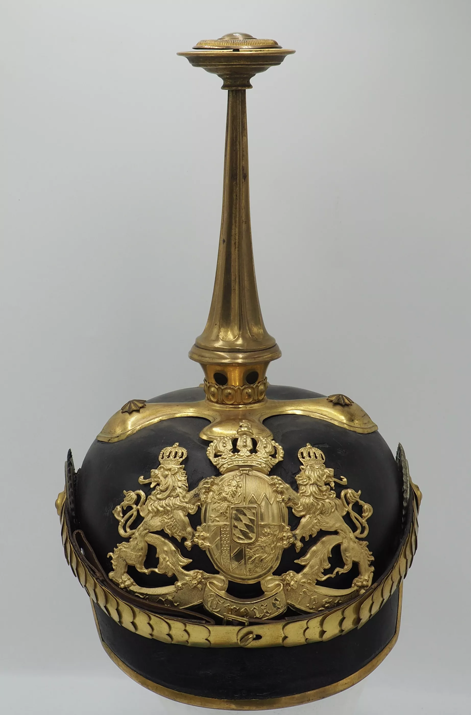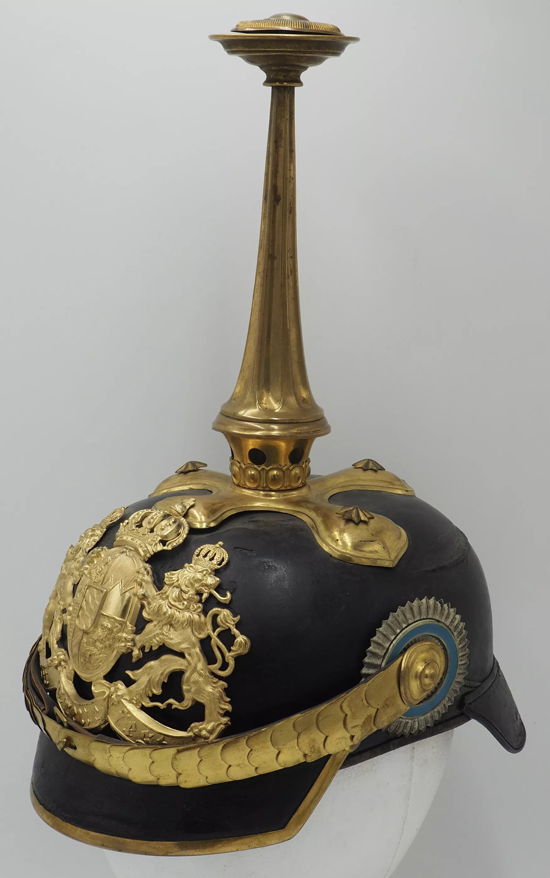 Gold crossed spike base with officer pearl/diamond ornamentation at base of spike. Fluted and tall removable plume that is mounted with a fine Yak hair parade plume. Large gold stars retain cross base to helmet. The Frontplate is the large gold Bavarian crest. The frontplate is beautifully fire gild. Original set of convex rounded gold chinscales with a gold officer rosette. Original officers Reichs and Bavarian cockades. Beautiful and impressive helmet.
