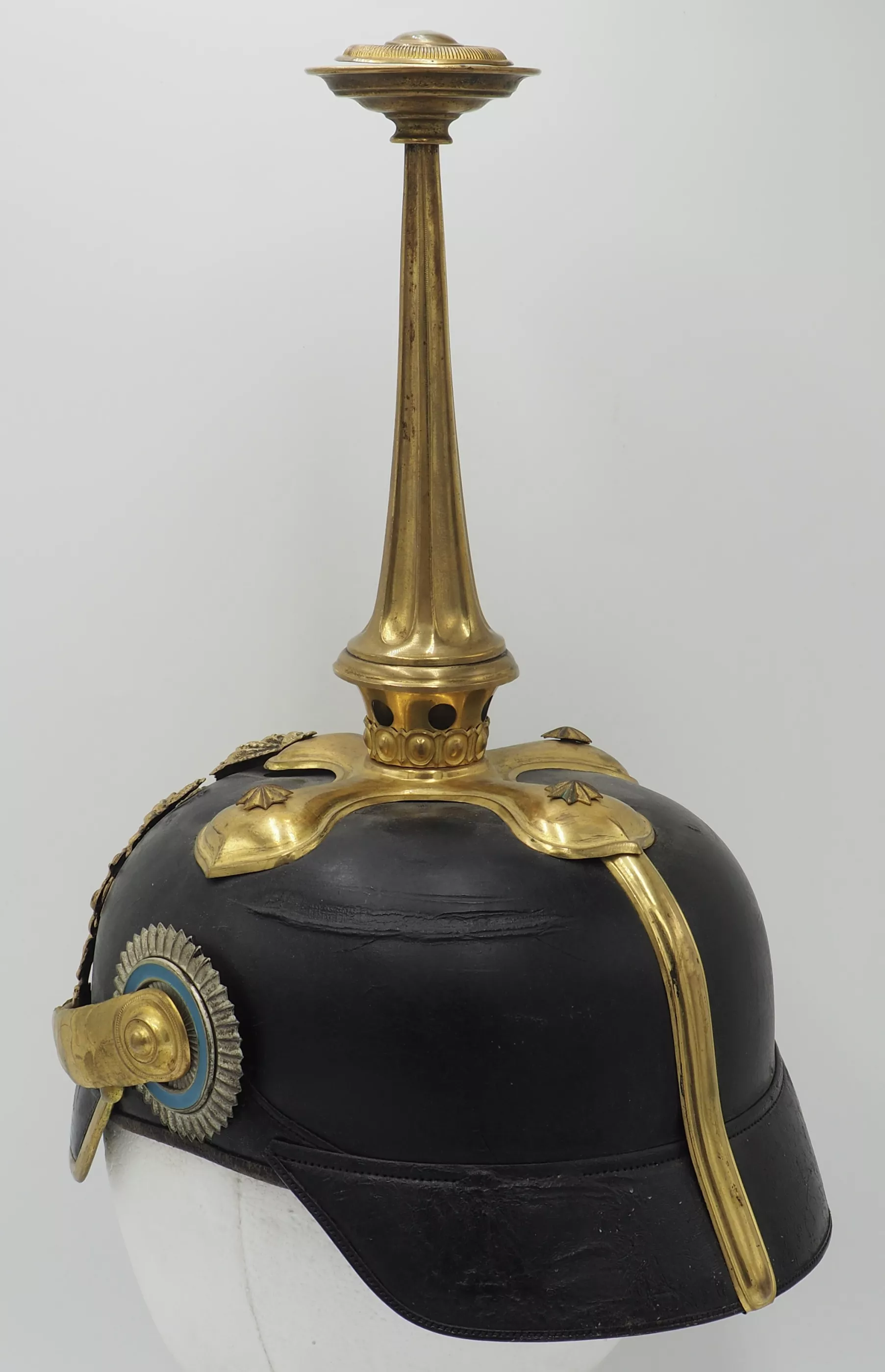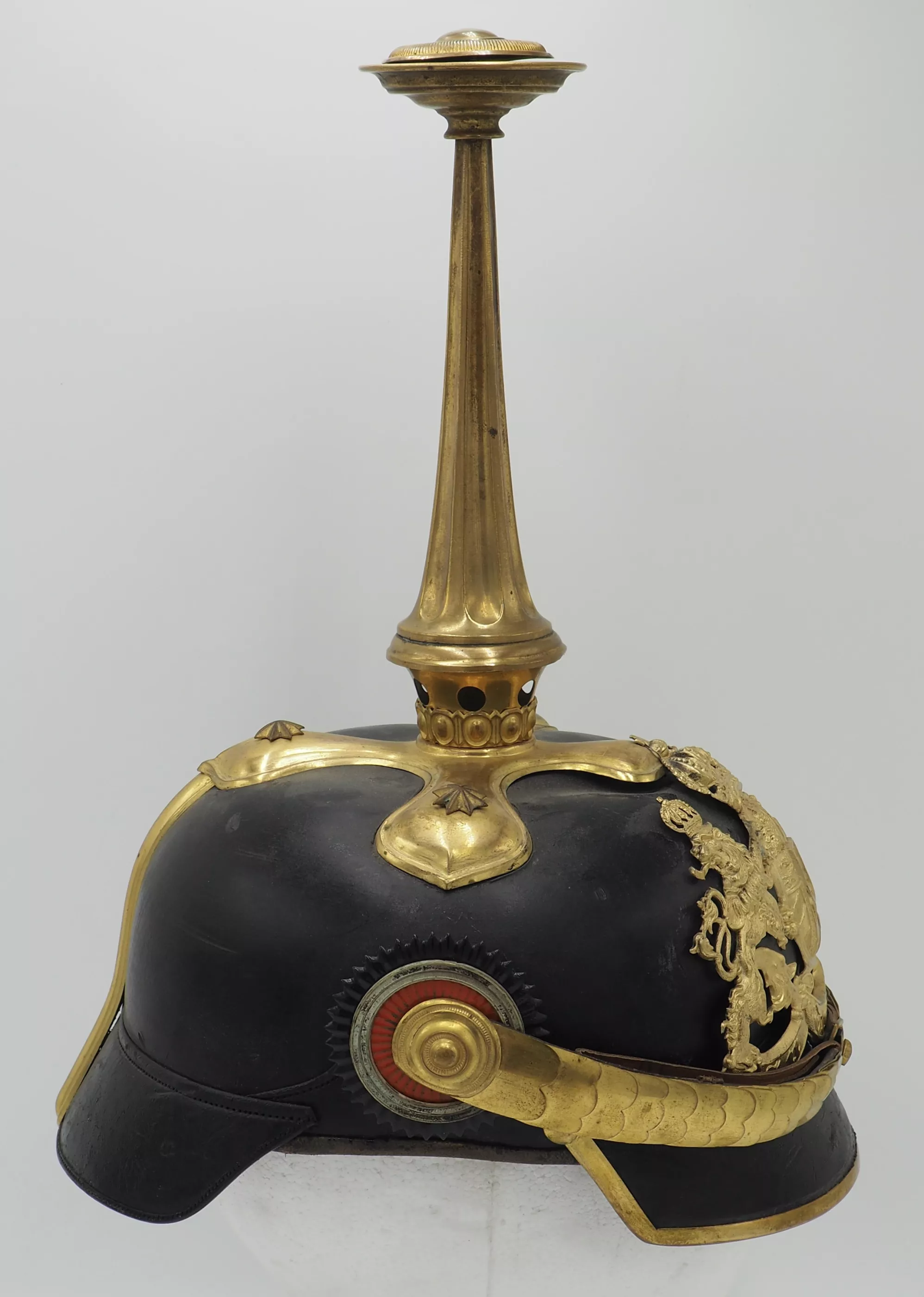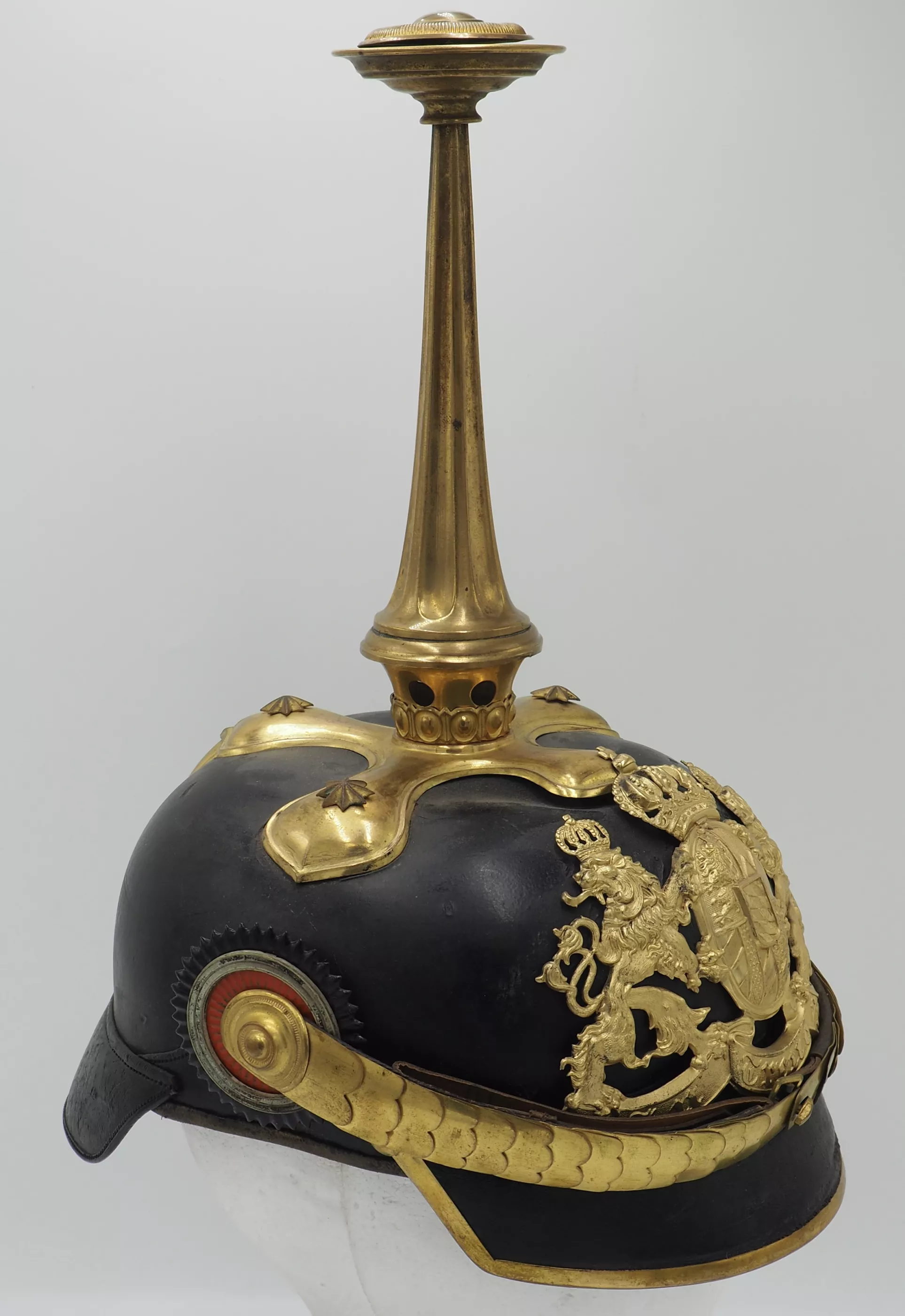 Gold crossed spike base with officer pearl/diamond ornamentation at base of spike. Fluted and tall removable plume that is mounted with a fine Yak hair parade plume. Large gold stars retain cross base to helmet. The Frontplate is the large gold Bavarian crest. The frontplate is beautifully fire gild. Original set of convex rounded gold chinscales with a gold officer rosette. Original officers Reichs and Bavarian cockades. Beautiful and impressive helmet.