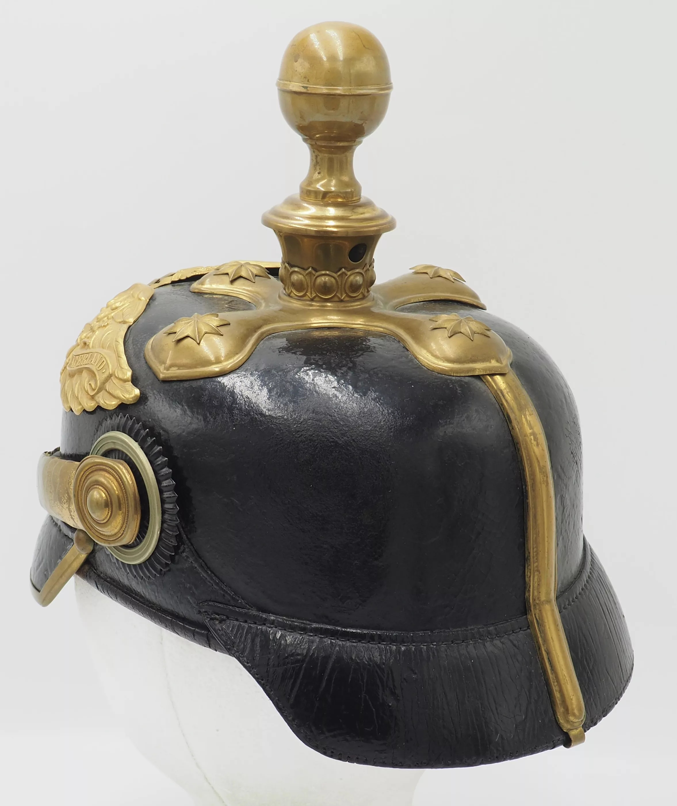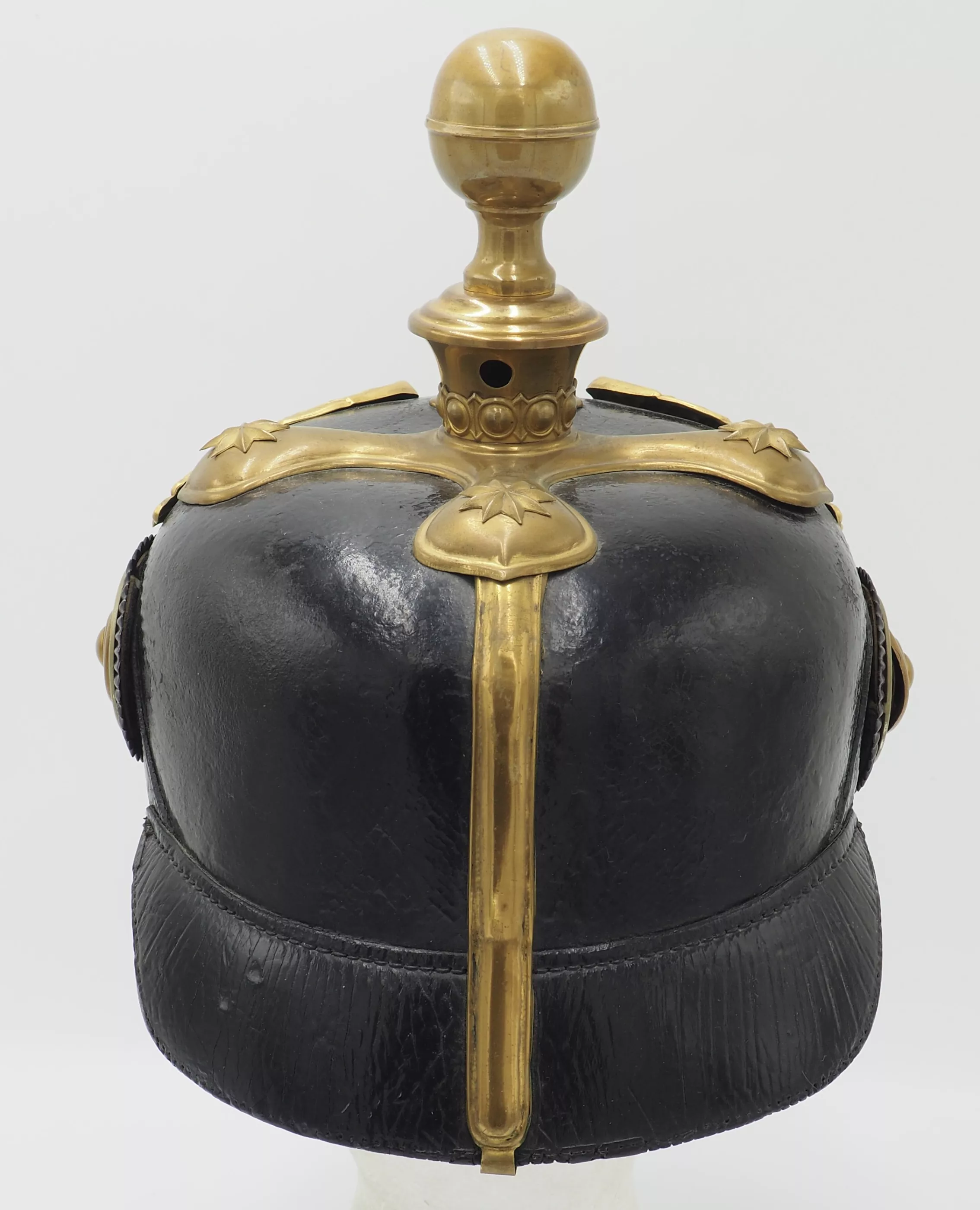 Prussian Artillery General - Model 1897. The helmet is uncleaned and unpolished. Black lacquered leather helmet body with gilded metal trim. The helmet has fine form and firm stitching. External lacquer is lightly crazed due to age but no lacquer loss. There are no extra holes in the helmet body. The helmet interior has soft sweat leather and silk headliner. The sweat leather has a tear in the back (see photos).