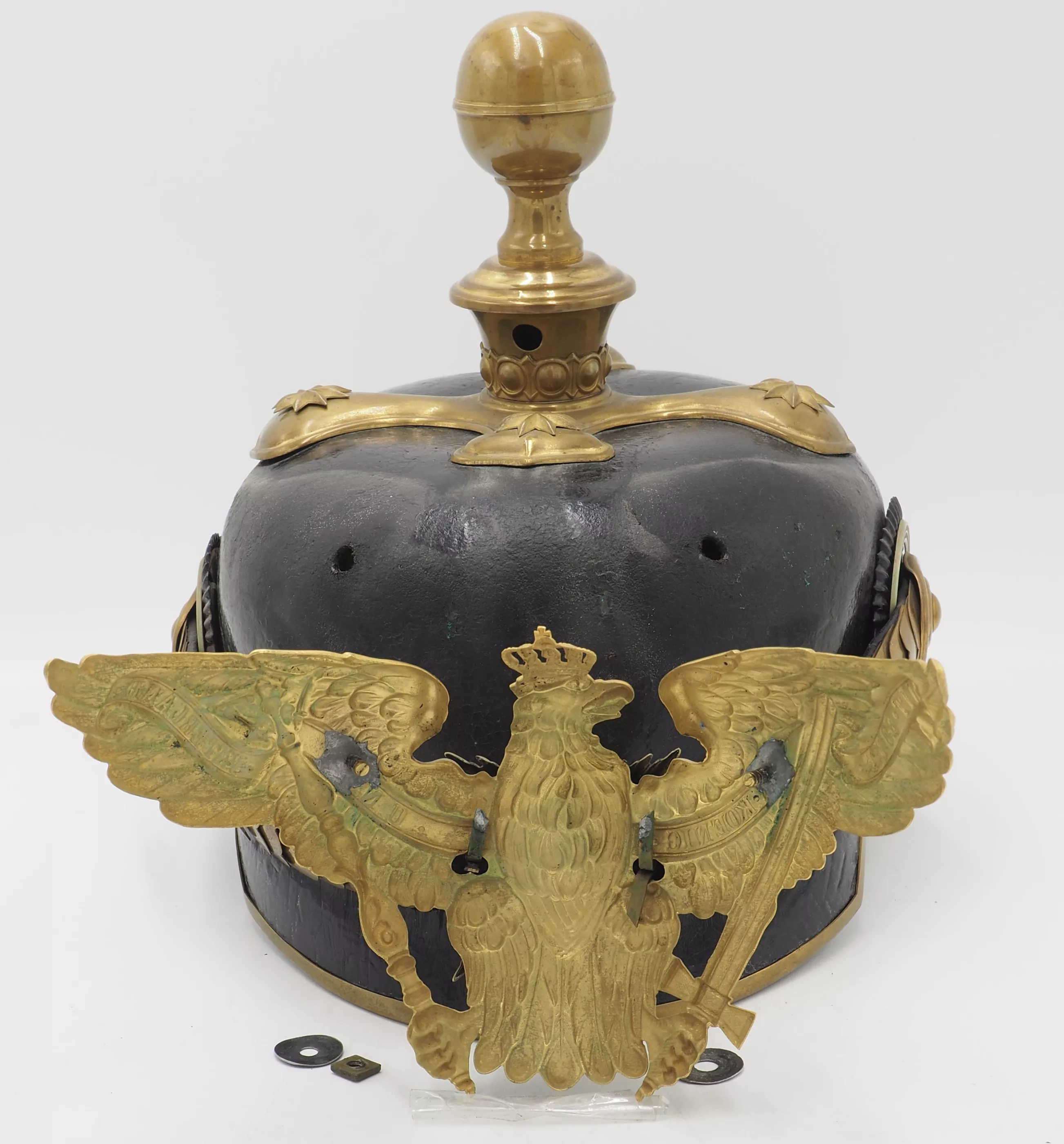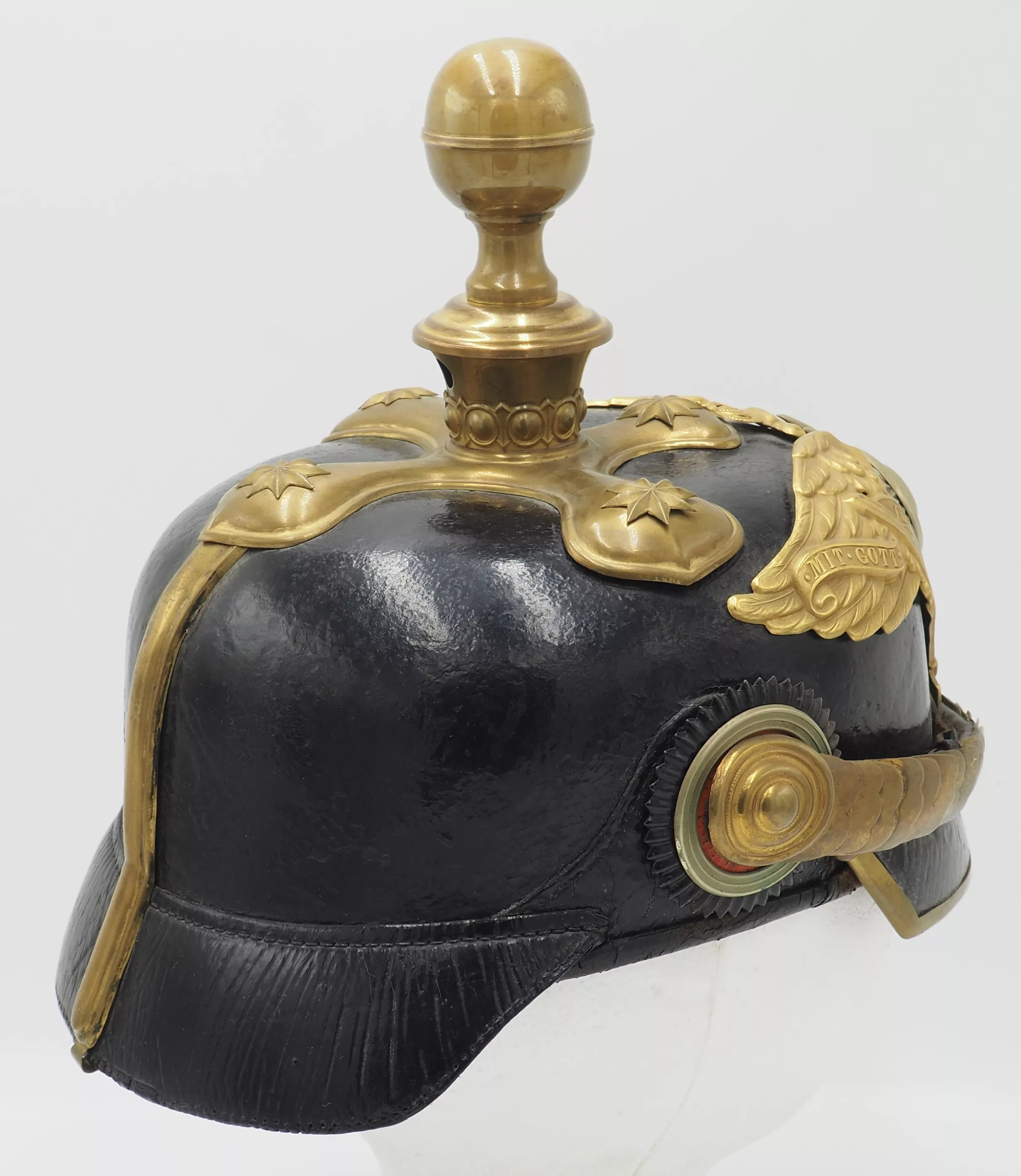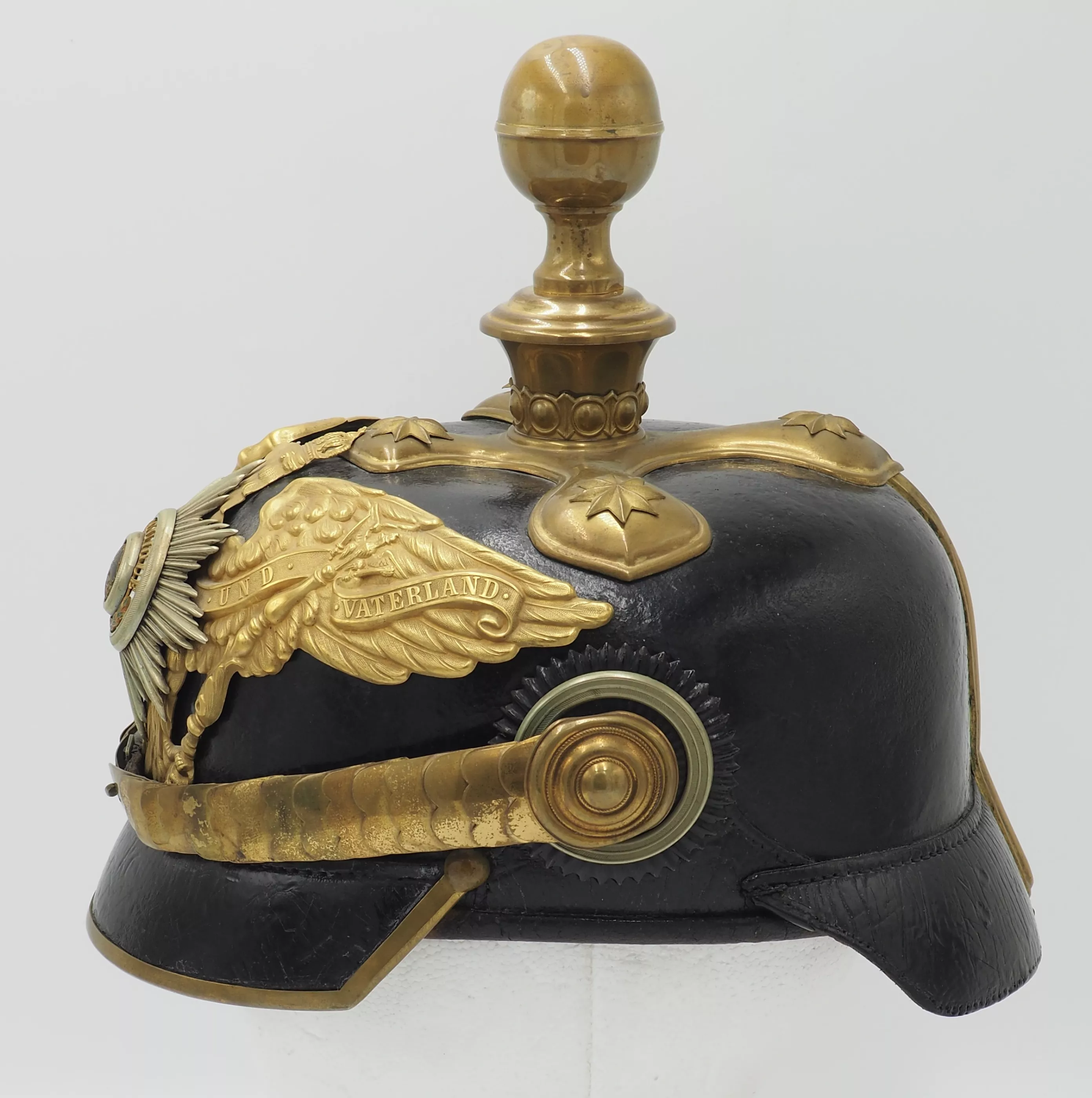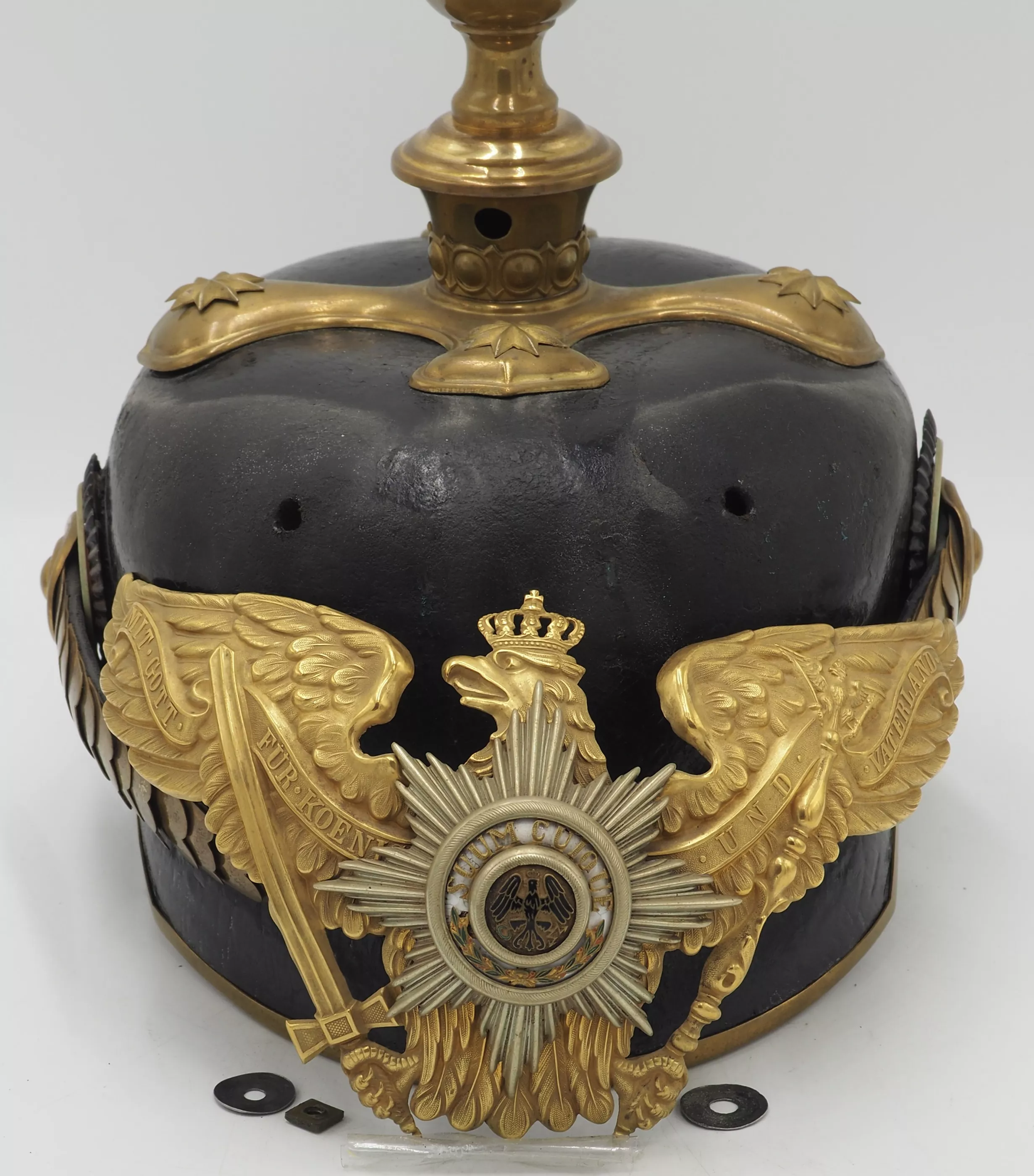 Inner visors color red on back but white on front. Inside the helmet bell is the makers label "WSH Marke" with an Imperial 3 color flag and the size 59 1/2. Crossed spike base with artillery ball top (see photos). The base has gold star retainers. The frontplate is the massive, fired gilded Prussian Guard eagle with enameled Guard star on the breast of the eagle. Rounded gold chinscales on rosettes. Officer Prussian and Reichs cockades. Outstanding Prussian Artillery General.