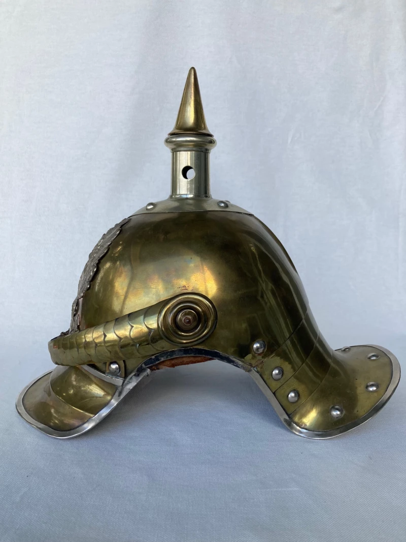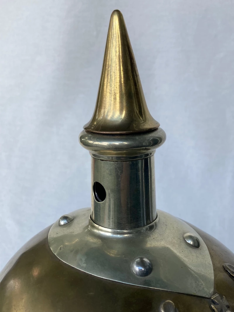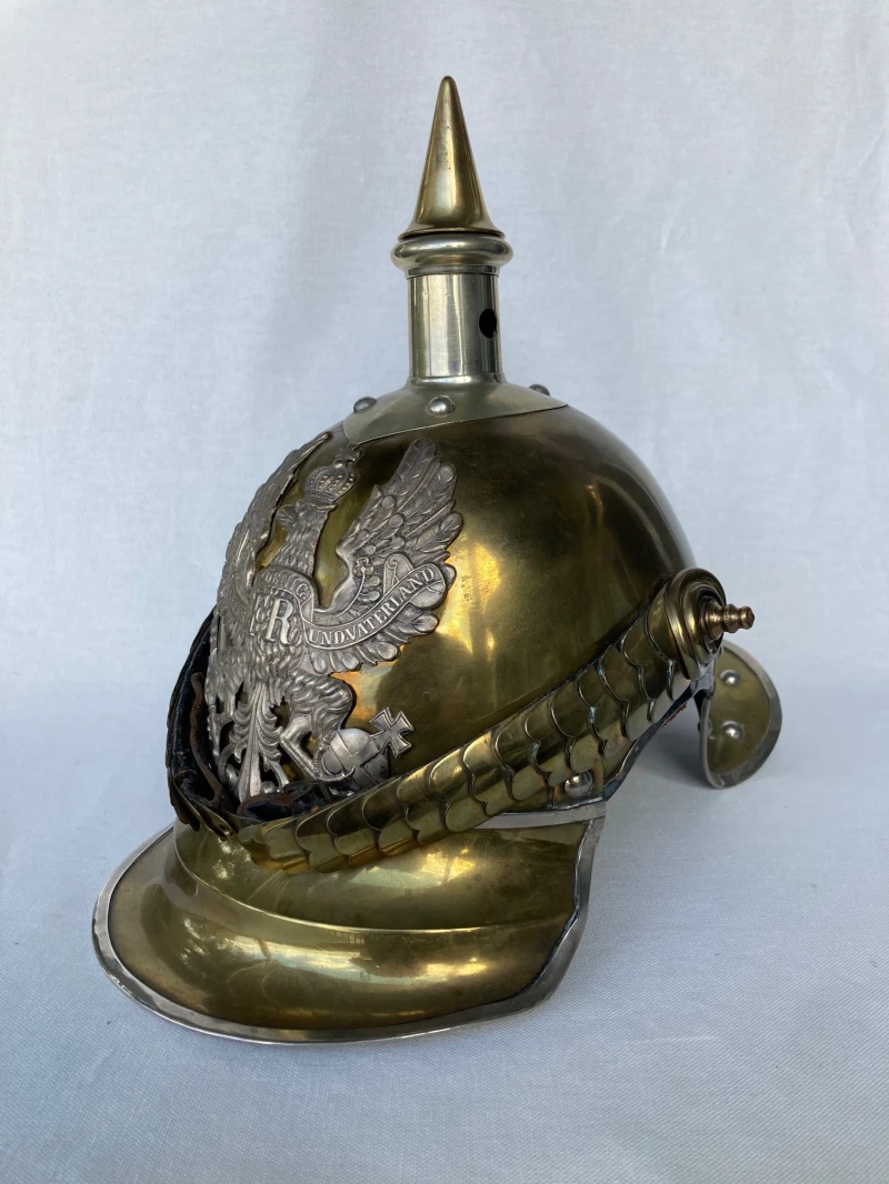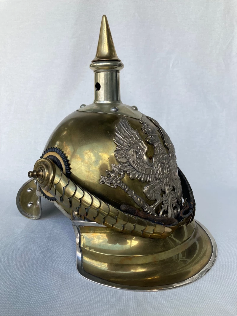 The helmet spike is the very tall first version which immediately makes the helmet appealing. It also has the distinctive “ovoid” egg shape to the shell. The eagle is the 1842 eagle shape (Schwarzenegger arms) adopted in 1842. However, it has the mandatory 1860 Fatherland Bandeau. That makes this eagle a very scarce pattern, as it is a one piece stamping. Usually after 1860 the 1842 eagle had an FATHERLAND Bandeau soldered on top of it. Note: Preussen did not adopt the Metalheme until 1843, but the eagle was the 1842 pattern.