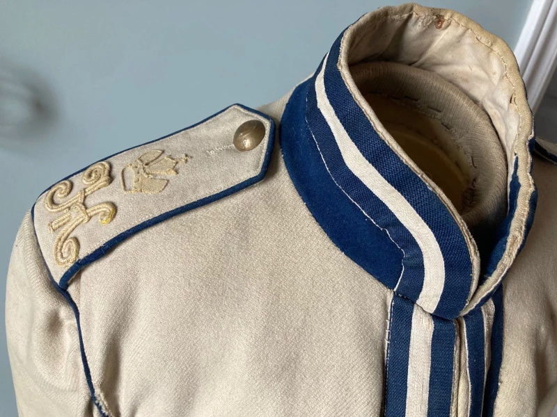 Now to this wonderful Koller for Kürassier-Regt. Kaiser Nikolas I. von Rußland. It is Kammer issued and dated 1890 officially making it my earliest Kammer issued uniform. A Kammer is a clothing depot, or in English, a Quarter-Master. The high collar with its distinctive curve, the cuffs, seams, and piping on the front opening and rear skirt of the Koller were piped in the regimental facing color. Note the bottom is just cut without him. This is a distinctive Preussen characteristic. Shoulder straps were white and also piped in the Regimental color, while officers wore epaulettes. For KR6 the Regimental colour was Russian Blue with the cypher of Kaiser Nikolas I in yellow cord. The Koller border (Kollerborte) was white fabric edged in Regimental facing colors, and ran the entire length of the front, collar, and cuffs The front is closed with sixteen alternating hook and eyes the entire length of the front, plus two on the collar.