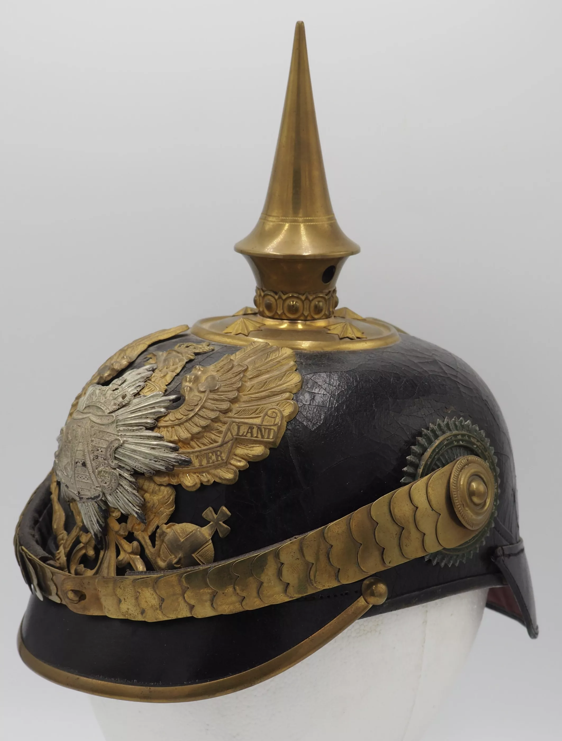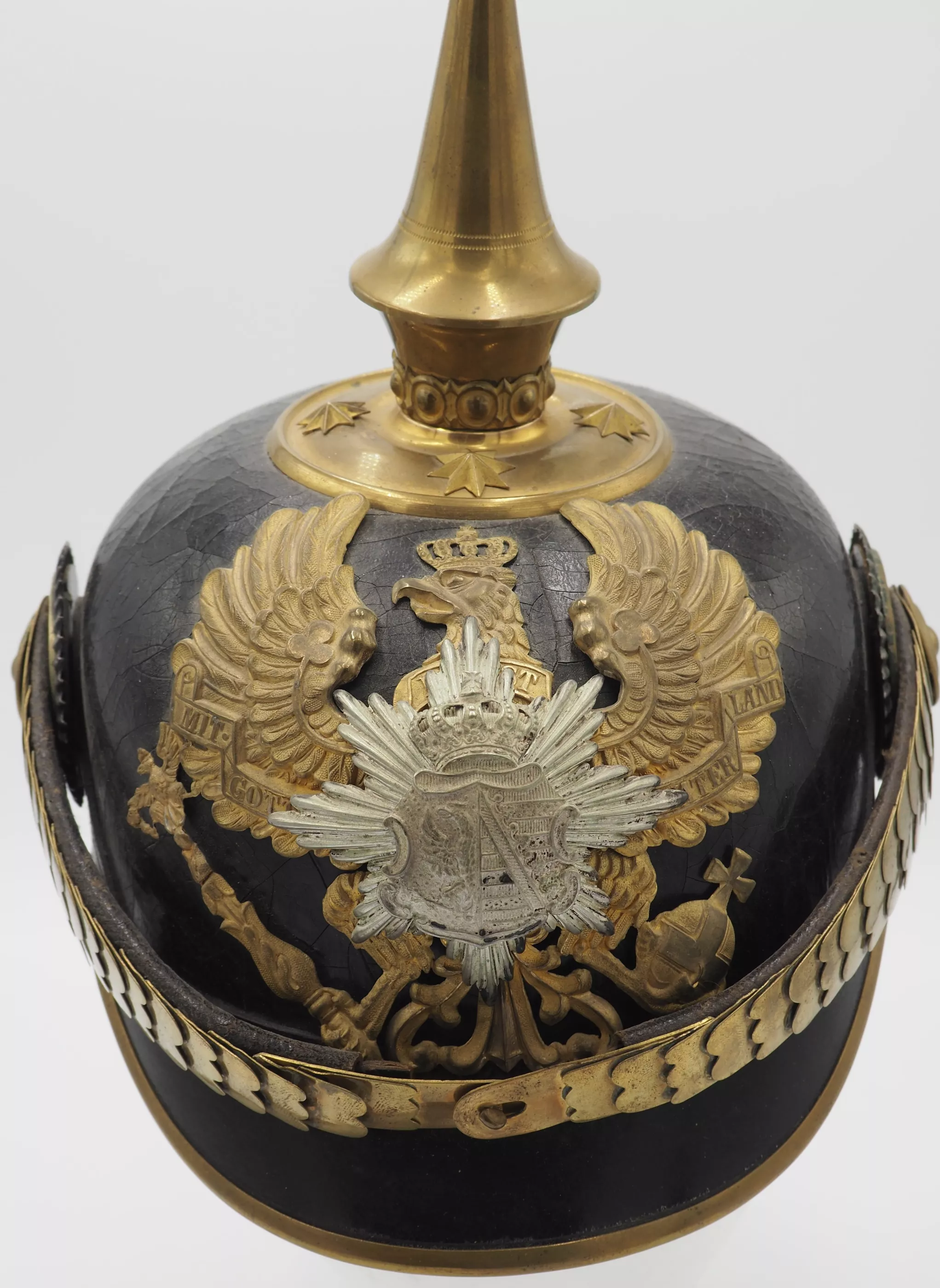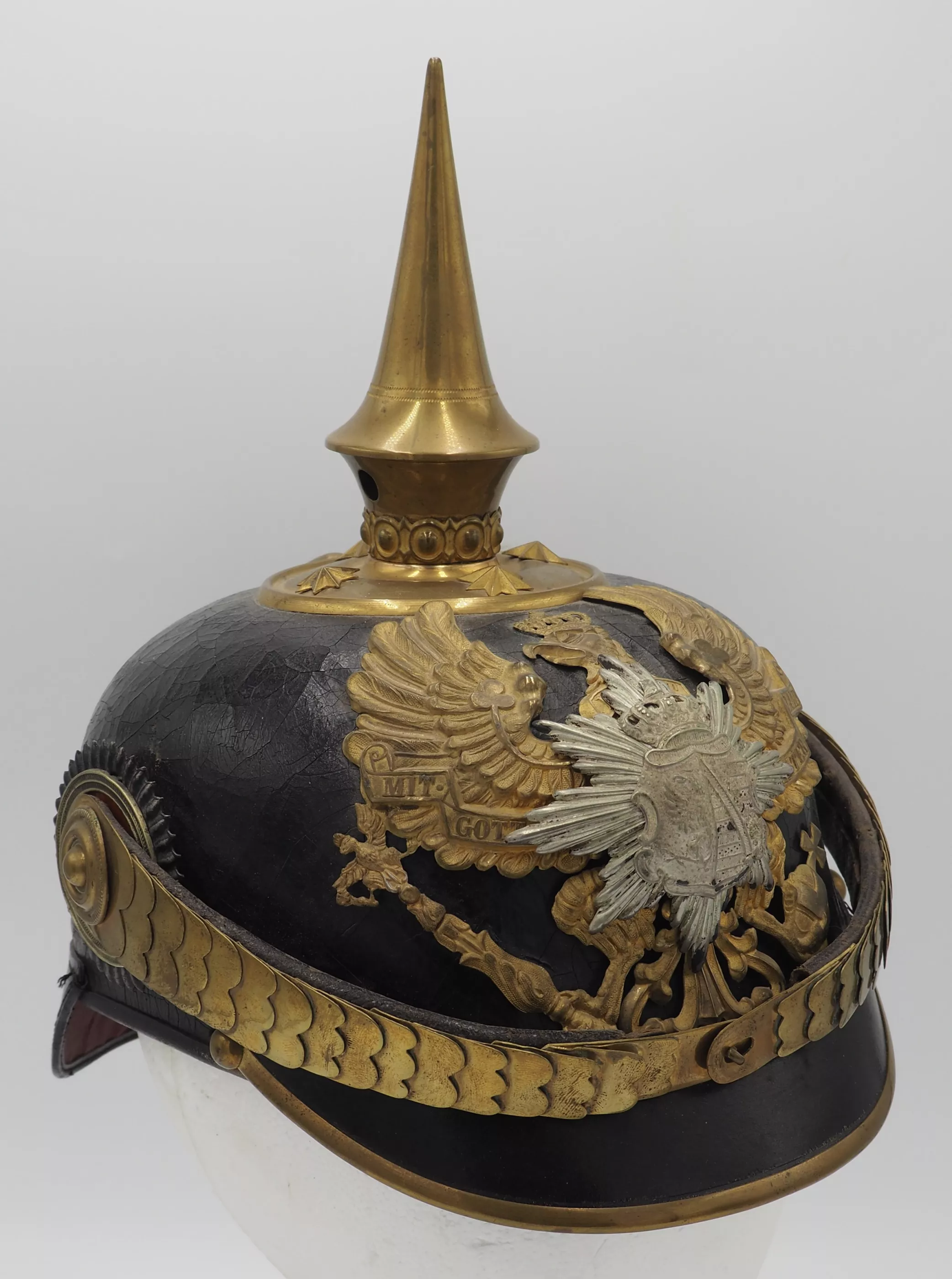 Anhalt 93rd Infantry Regiment for an Officer - Model 1897. This helmet has not been cleaned or polished. Black lacquered leather helmet body with fire gilded brass metal trim. Helmet body has excellent form and firm stitching. The exterior lacquer is uneven but has no lacquer loss (see photos). No extra holes in the helmet body. Interior has sweat leather and silk headliner. The liner shows use and age but is in good condition.