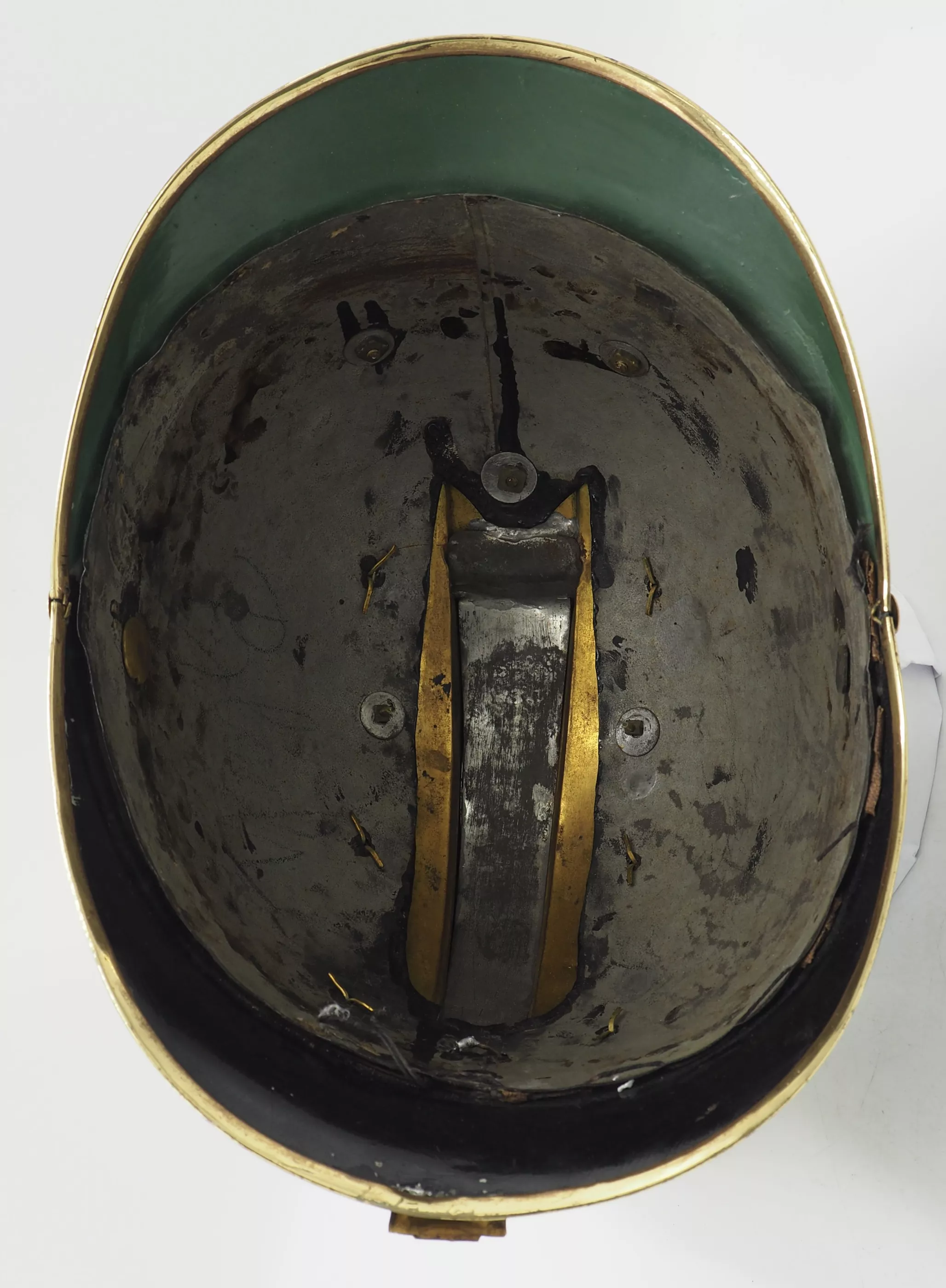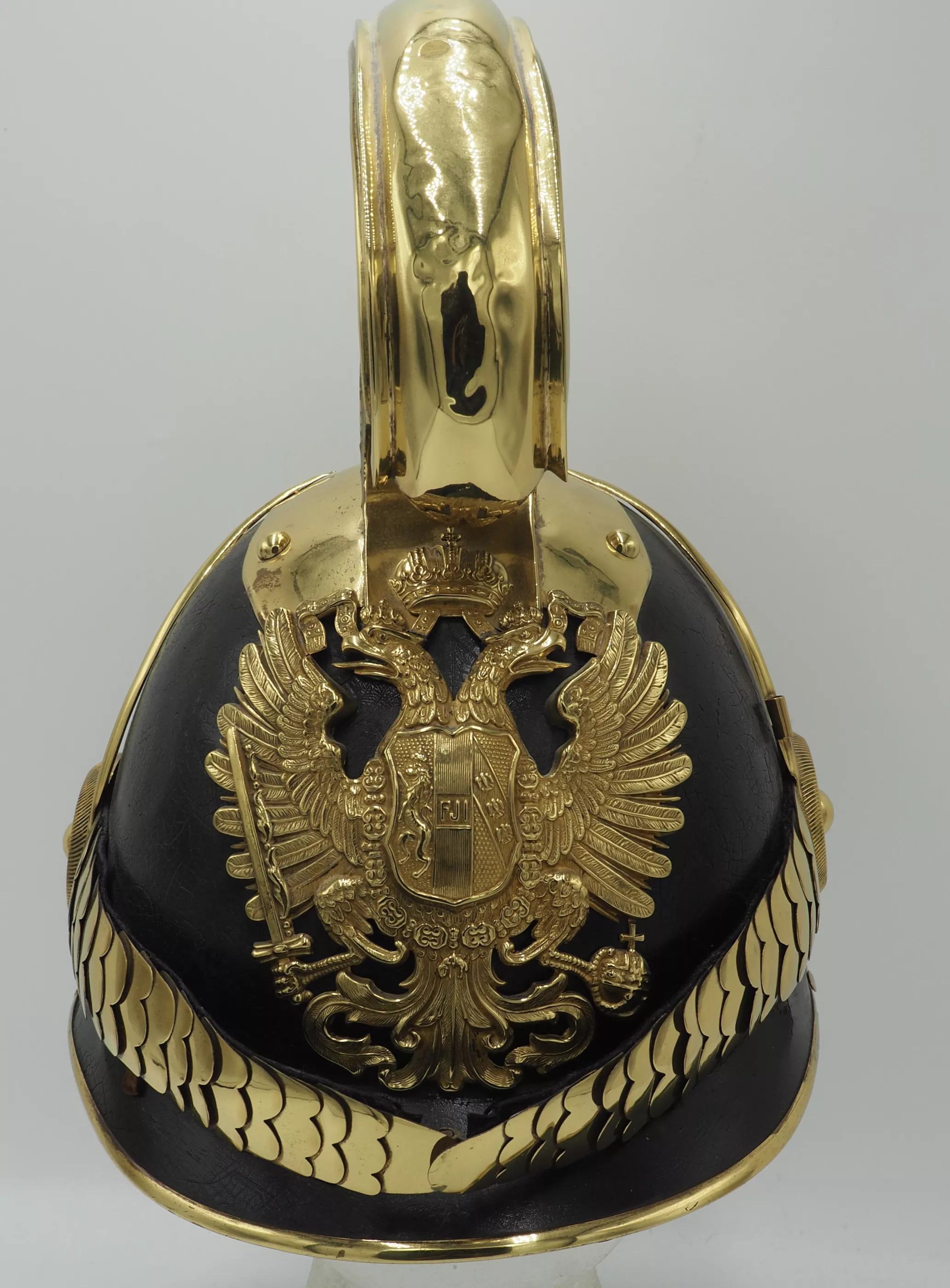 Black lacquered metal helmet shell in excellent overall condition with only minor flaws. Tall Brass Cimier held to helmet with split brads. All brass trim including side protectors and visor trims. The Austro-Hungarian double headed eagle with the JFI on its breast for Franz Joseph 1st.. Beautiful set of original convex chinscales attached by a fancy NCO rosette. No liner. We have often encountered Manschafts or Officers helmet form this Unit...but this is our first NCO dragoon.