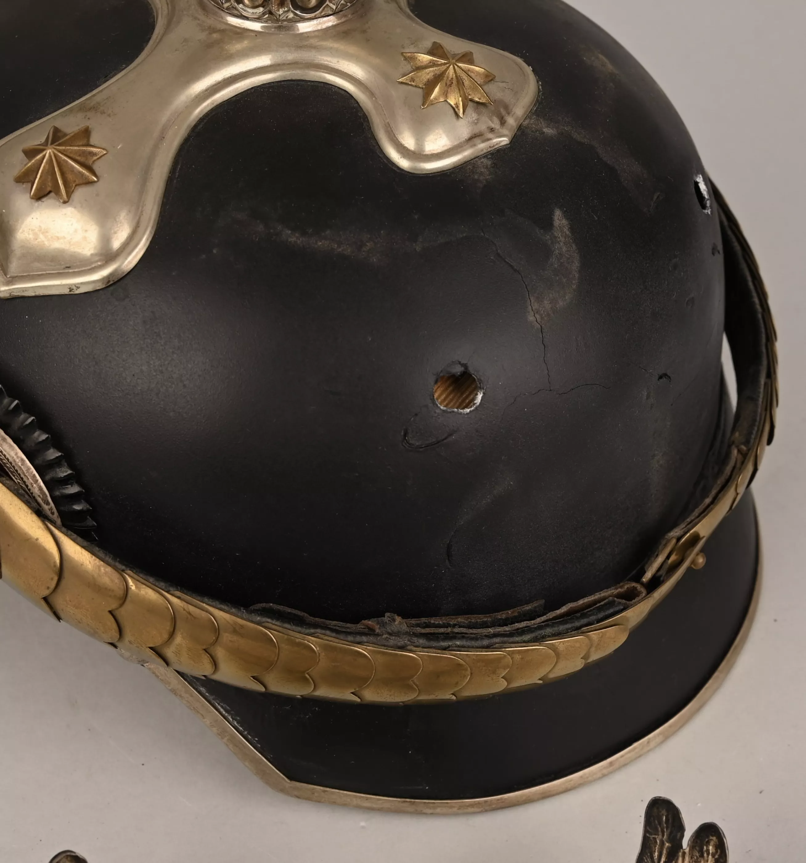 Metal trim is beautiful silver that has never been cleaned or polished. Crossed spike base with removable "extra tall" spike secured by gilt officer stars. Front plate is the Baden Griffen with the "Mitt Gott F. Fuerst U. Vaterland" bandeau. The Baden plate left deep marks in the helmet body Rounded gold chinscales with silver rosettes. Officer 2-piece Reichs and single piece non-serrated Baden cockades. Extremely rare find in today's market place. Absolutely 100% Original and Untouched helmet.