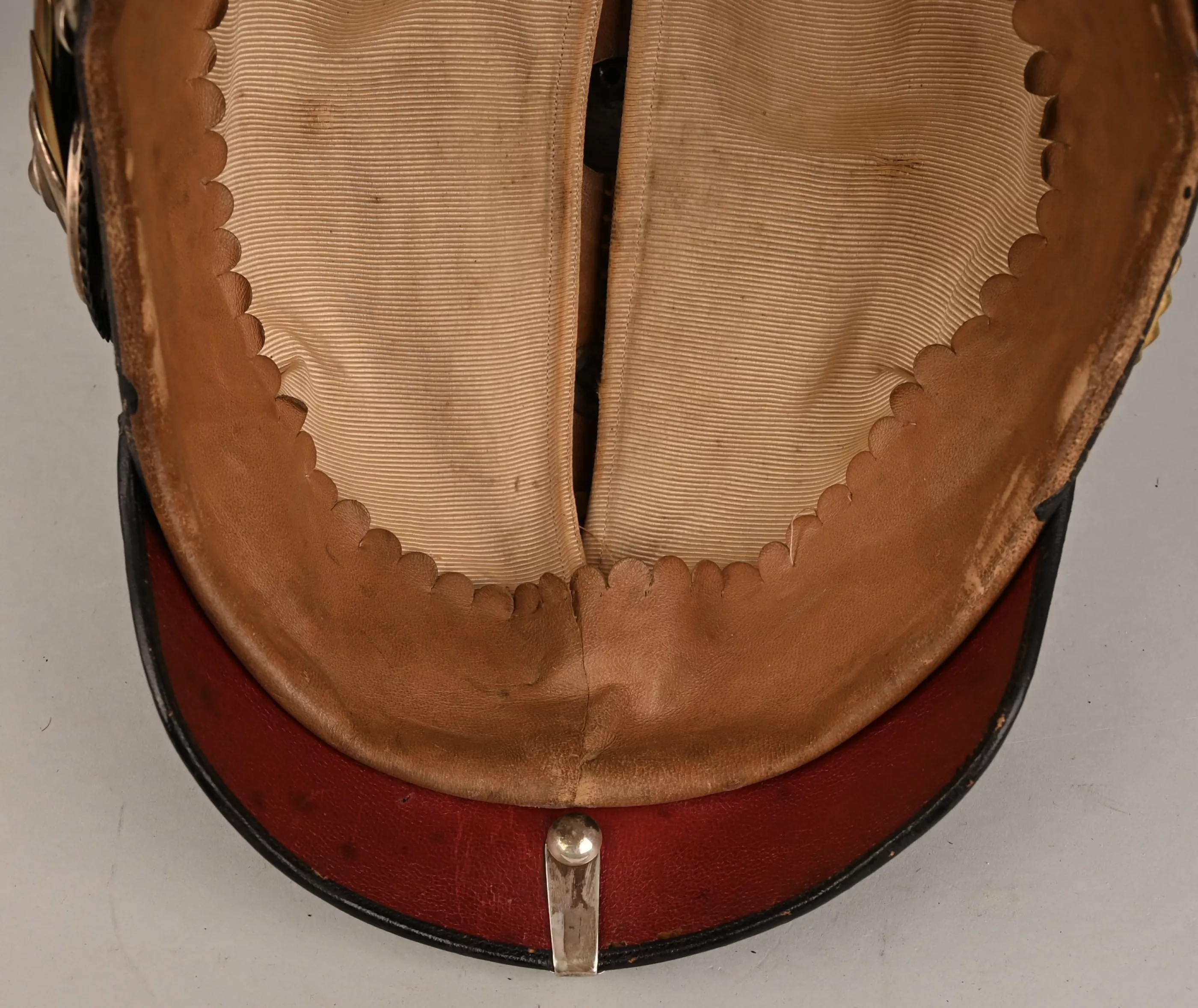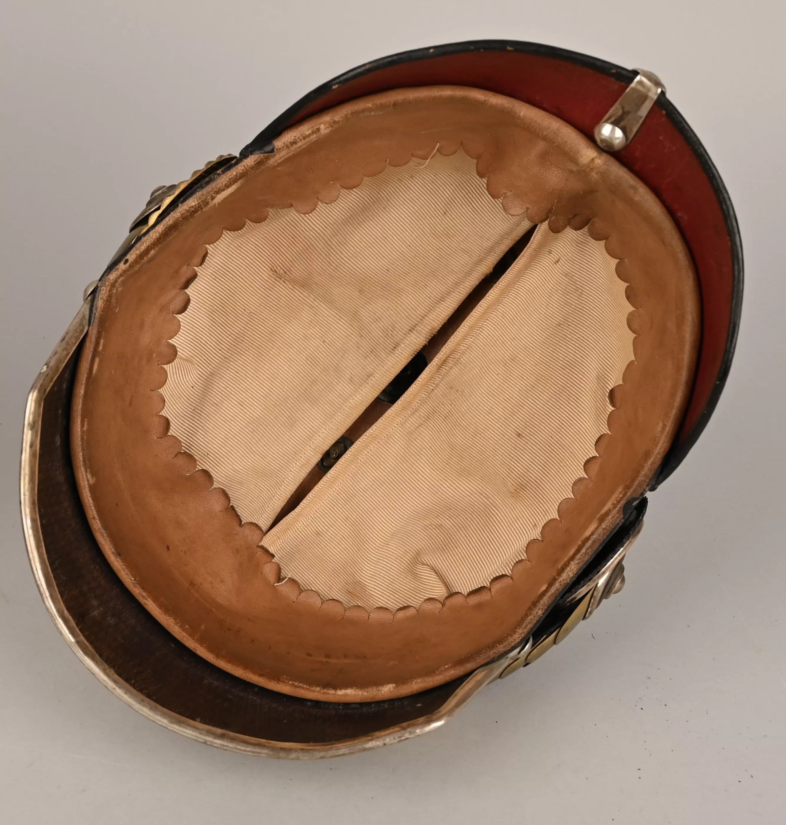 Baden Dragoon Regiments (20,21 and 22) Officer Model 1897. Black lacquered leather helmet body with silver trim. MINT Helmet body has excellent form and firm stitching. Exterior lacquer still smooth with beautiful finish and absoluteley no flaws or cracks. Interior has officer sweat leather and silk headliner in perfect condition with no tears. Silk headliner is near prefect. Interior visors are red and green as appropriate for officer. No extra holes in helmet body.