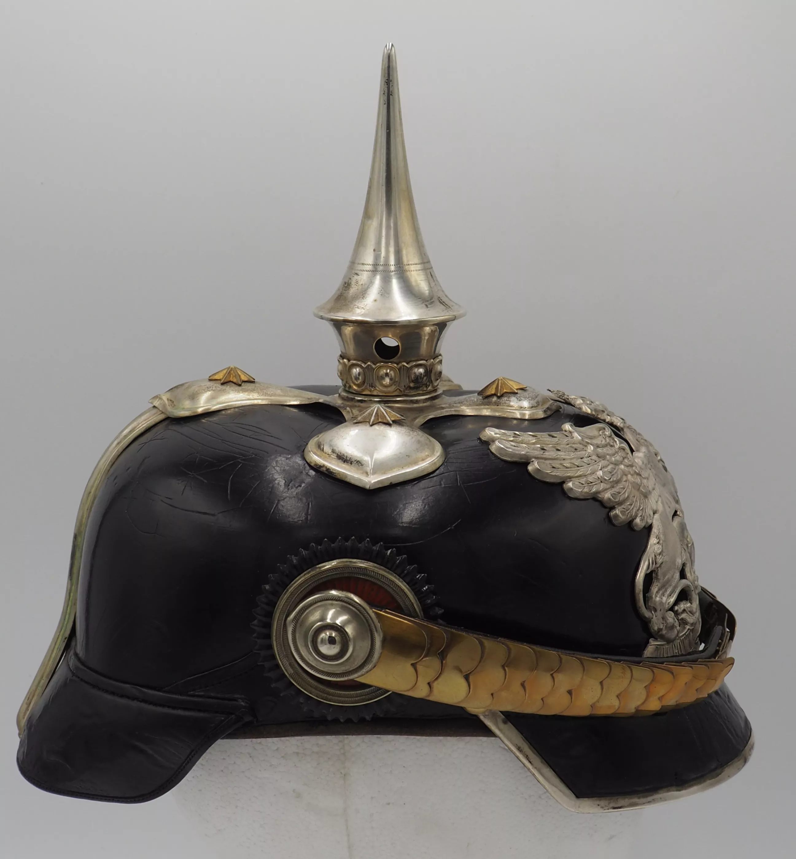 Interior visors are lined with Green and Red for Officers. The polished silver trim is high-quality. All the metal trim matches in color 100%. The spike base has crossed base and officer pearl ring with a removable tall spike. The base is held to helmet body with brass/gilt stars retainers that are split brads. The frontplate is the silver frosted Baden Griffin that has split brads retainers. Rounded gilt chinscales on silver rosettes. Officer style 2-piece Reichs cockade and furled non-serrated Baden cockade. The helmet retains its original fire gilding.