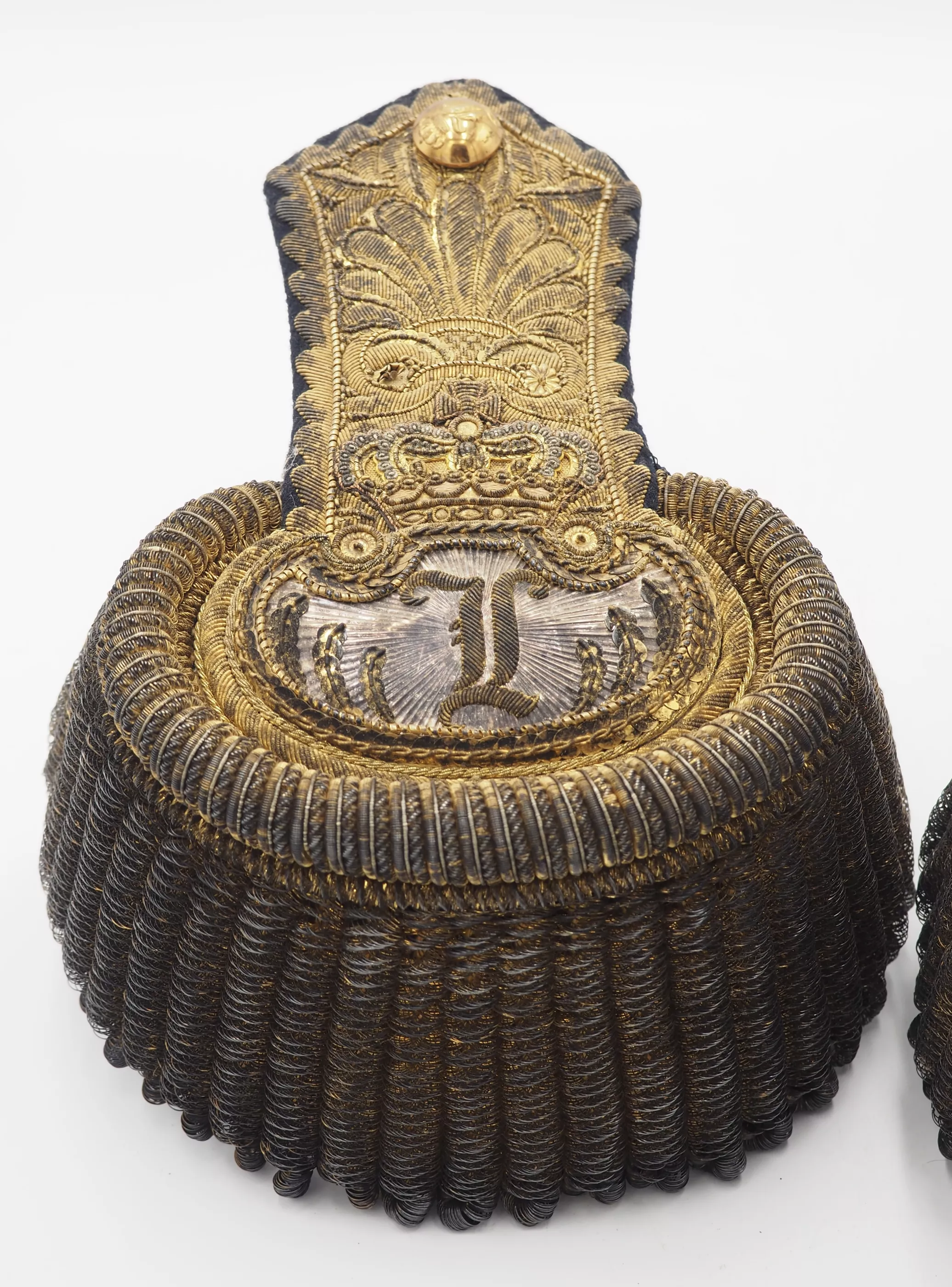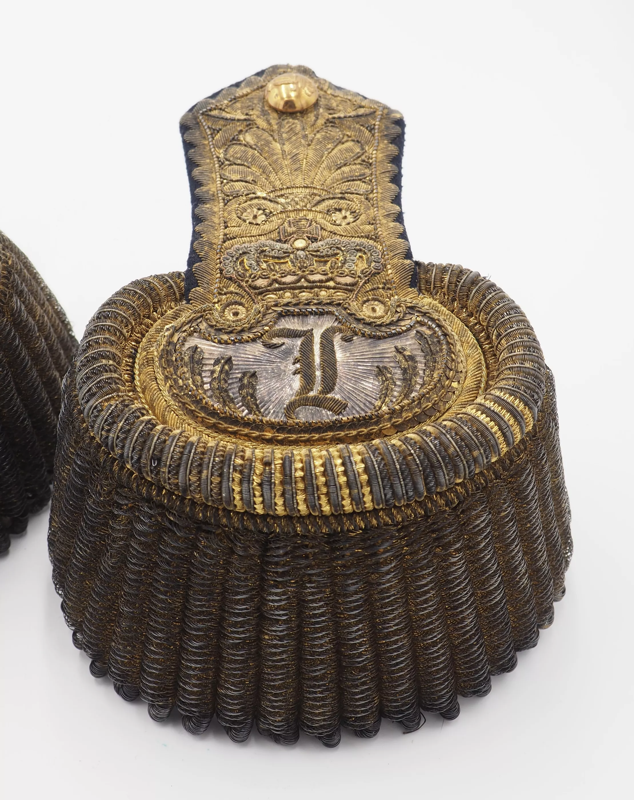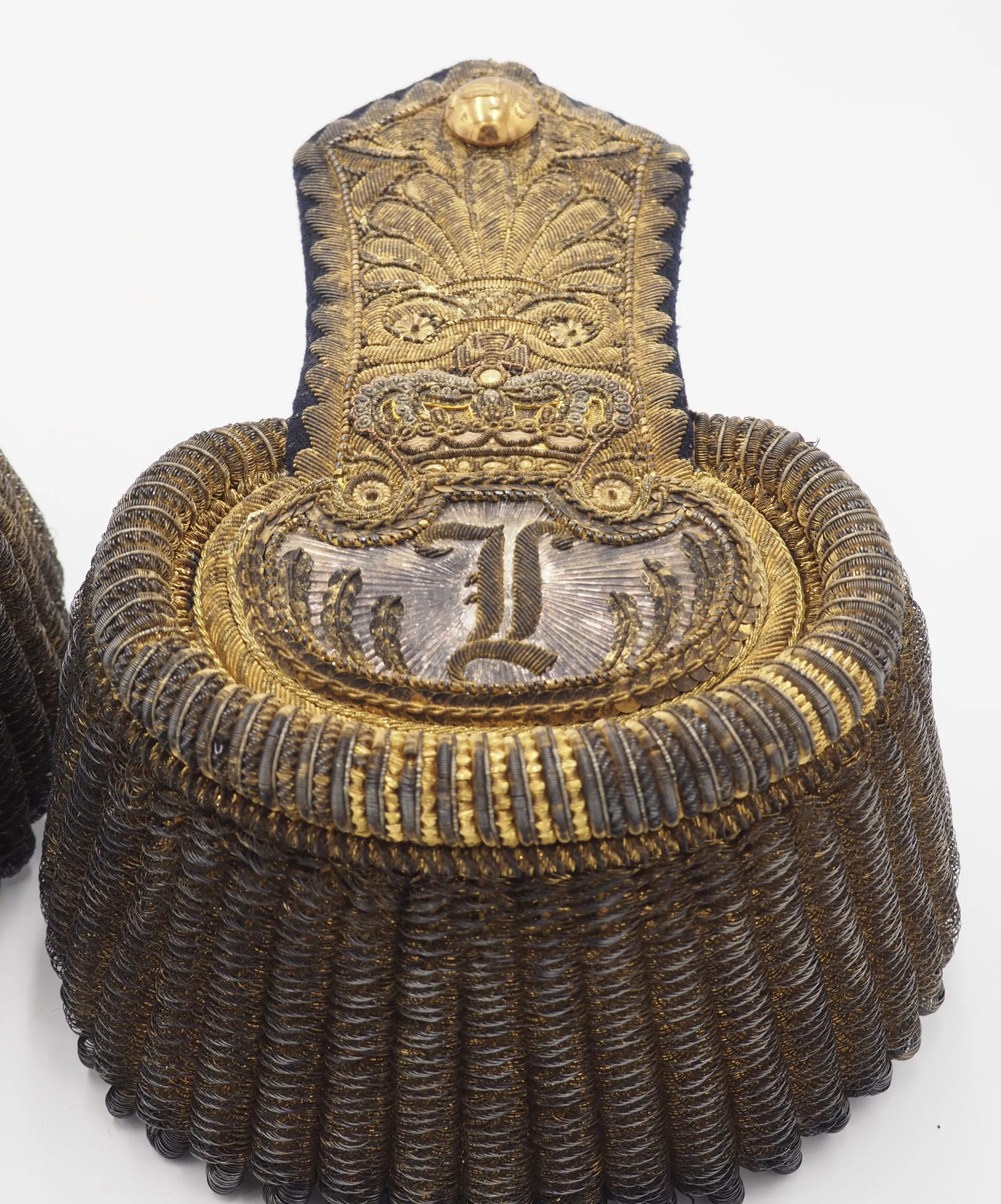 Bavarian Circa 1913. Large epaulettes with finely fluted gold fields and Gold Bullion moons. Hand-embroidered with the "L" for Ludwig the 3rd and Bavarian Crown in the center. Dark blue backing surrounding. Overall Near Mint to Mint condition.
