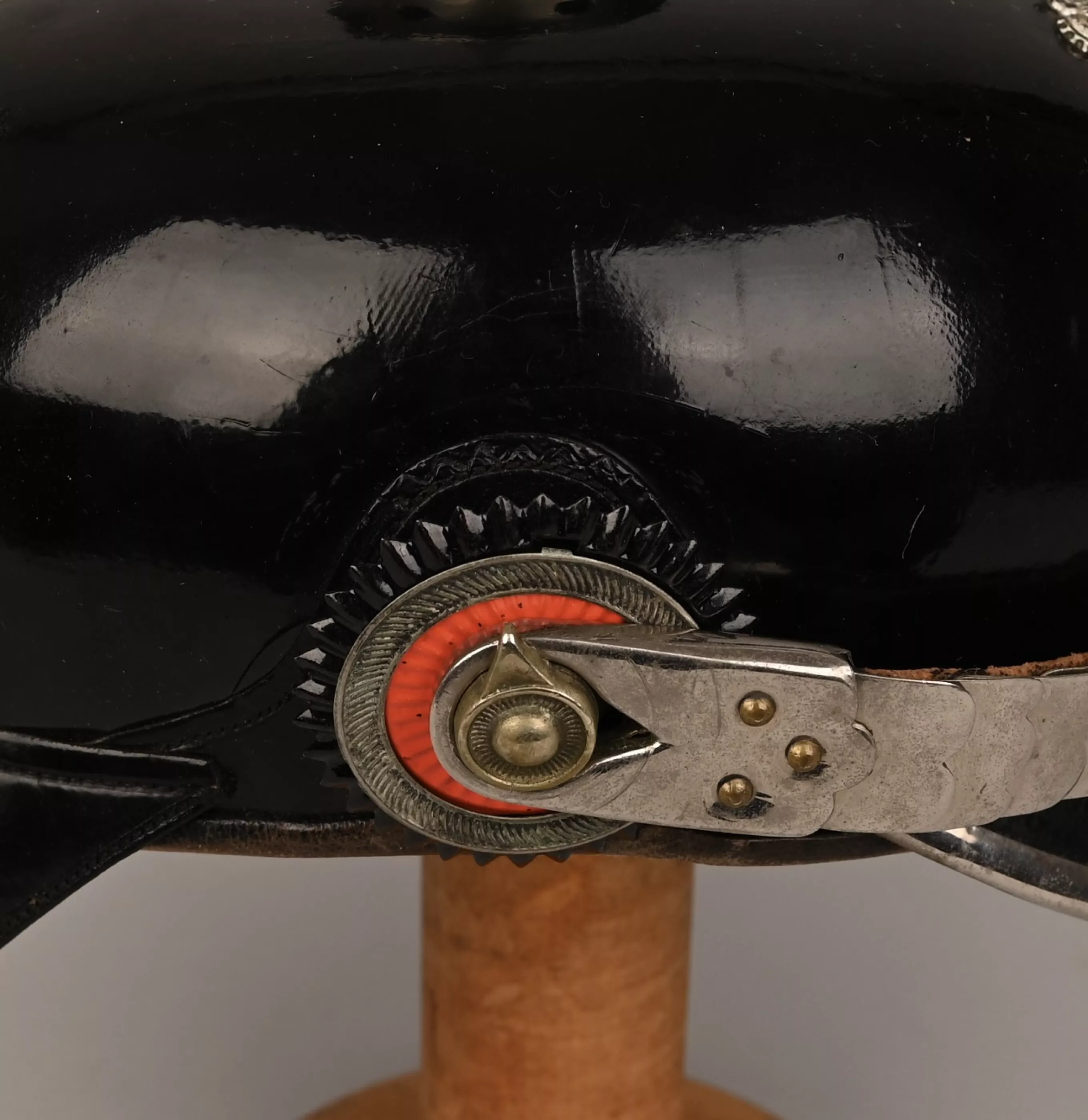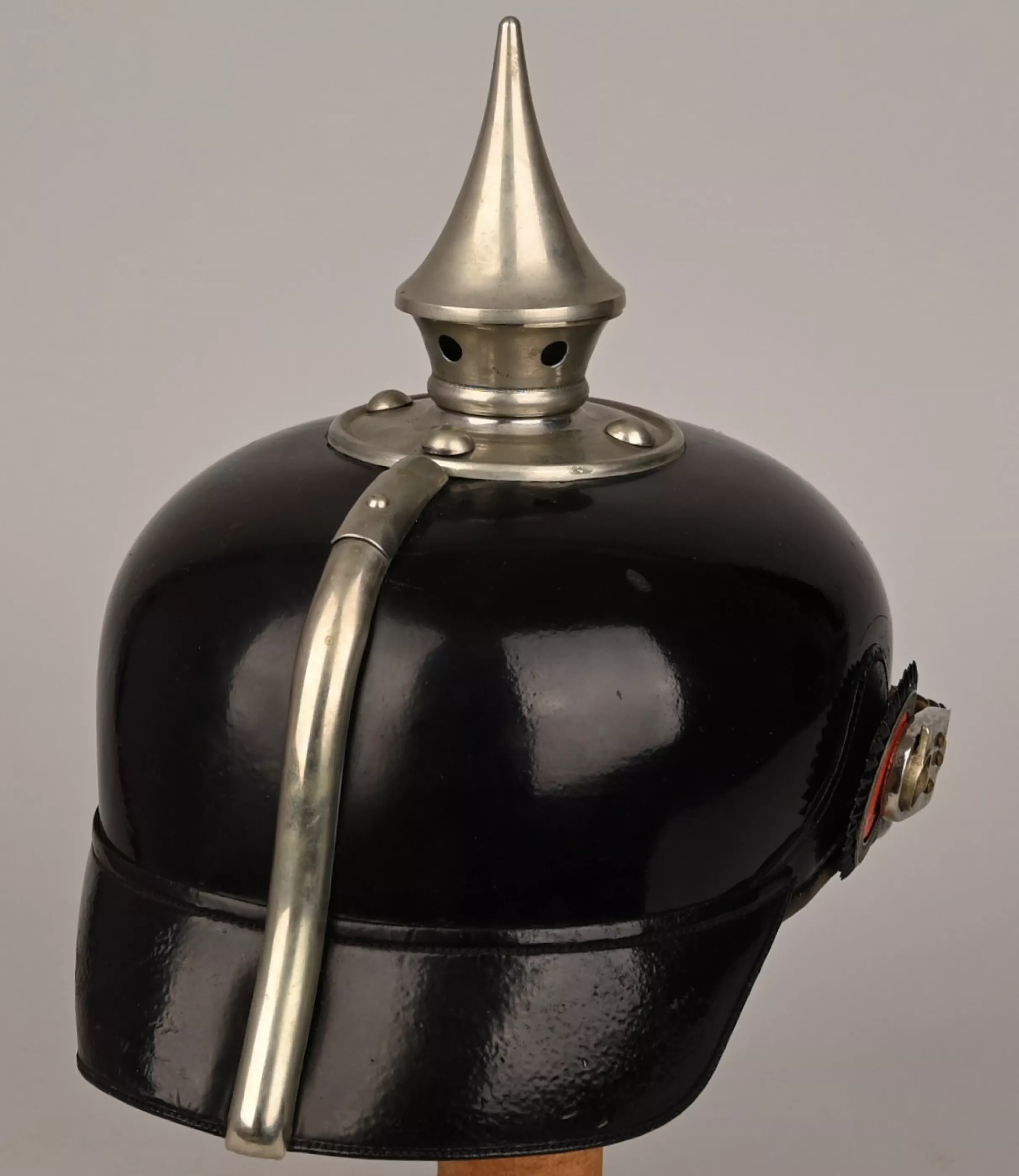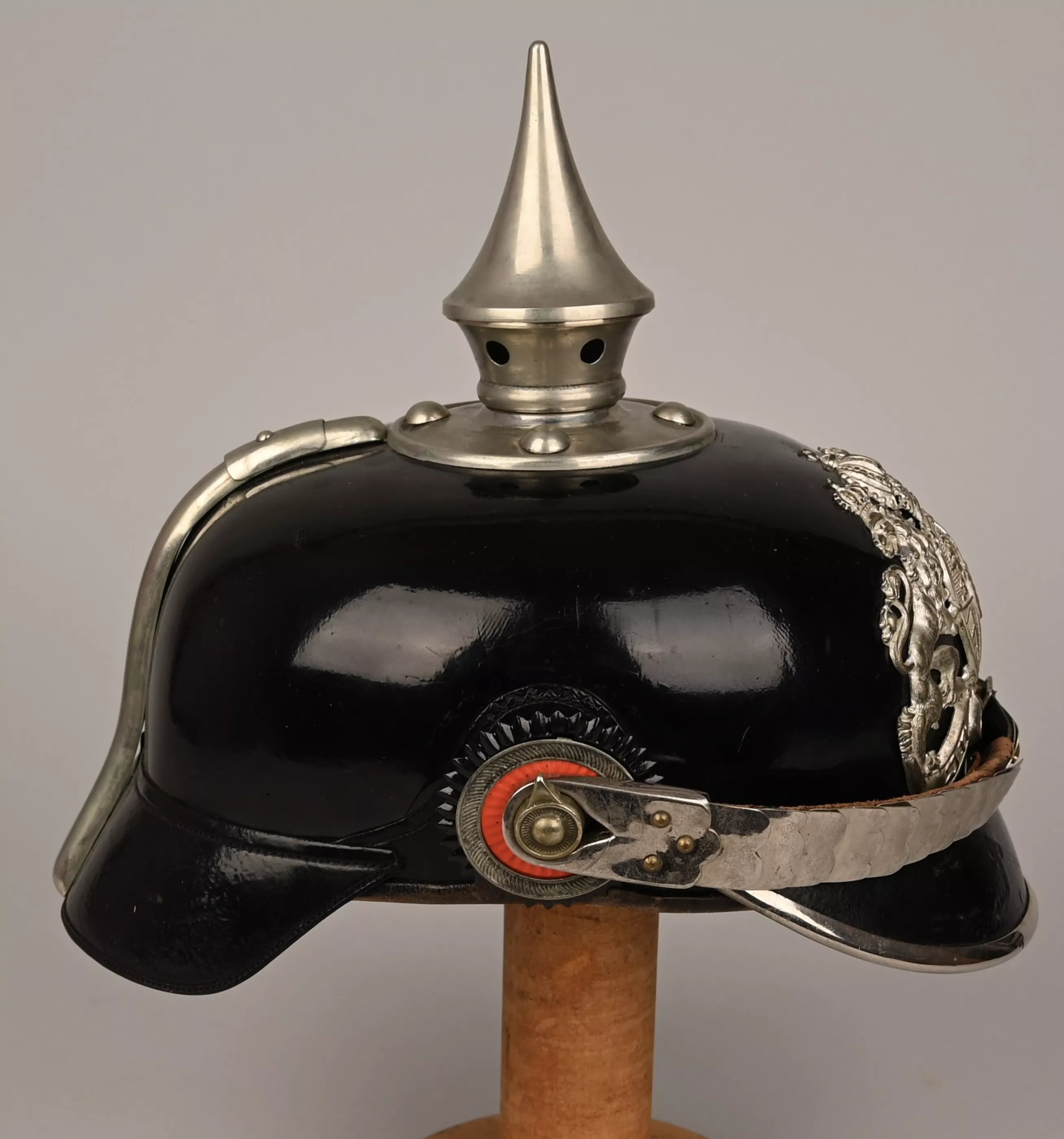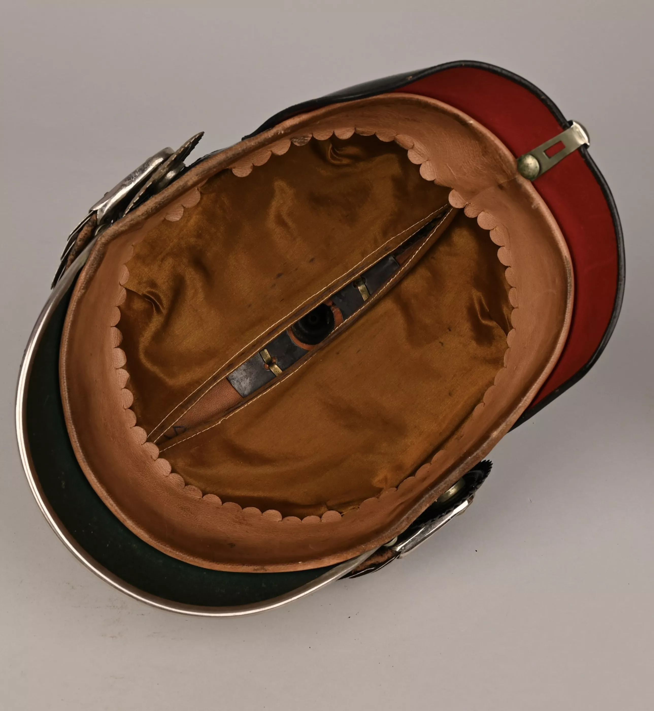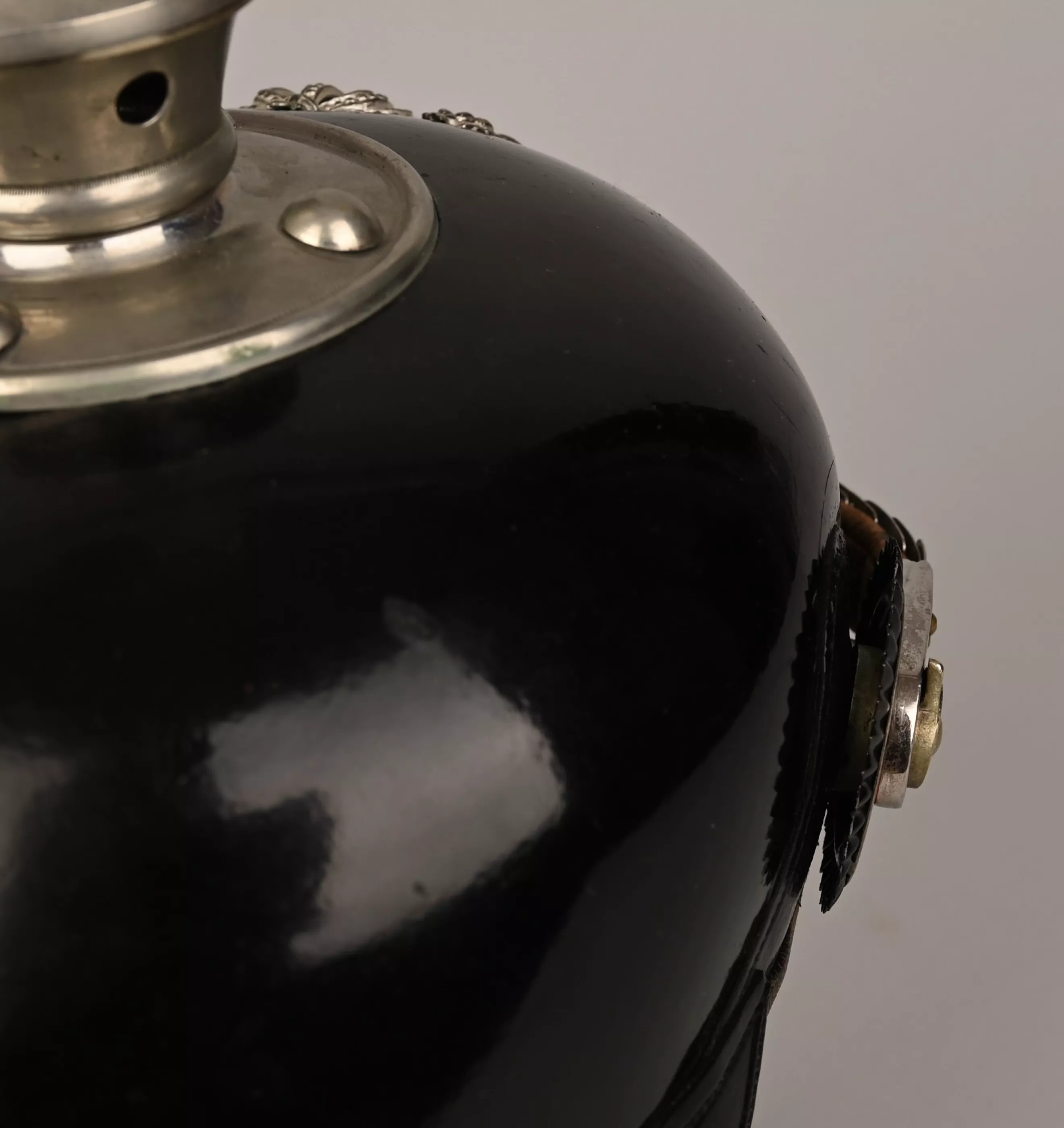 Bavarian Leib Infantry NCO Model 1897 Pickelhaube. Beautiful and absolutely virgin and untouched. Black lacquered leather helmet body with silver trim. Helmet body has excellent form and firm stitching. Exterior lacquer still has its polished sheen in immaculate condition. Interior has the officer sweat leather and brown colored silk headliner in absolute MINT condition. Round front visor lined in green, back visor lined red. No extra holes in helmet body.